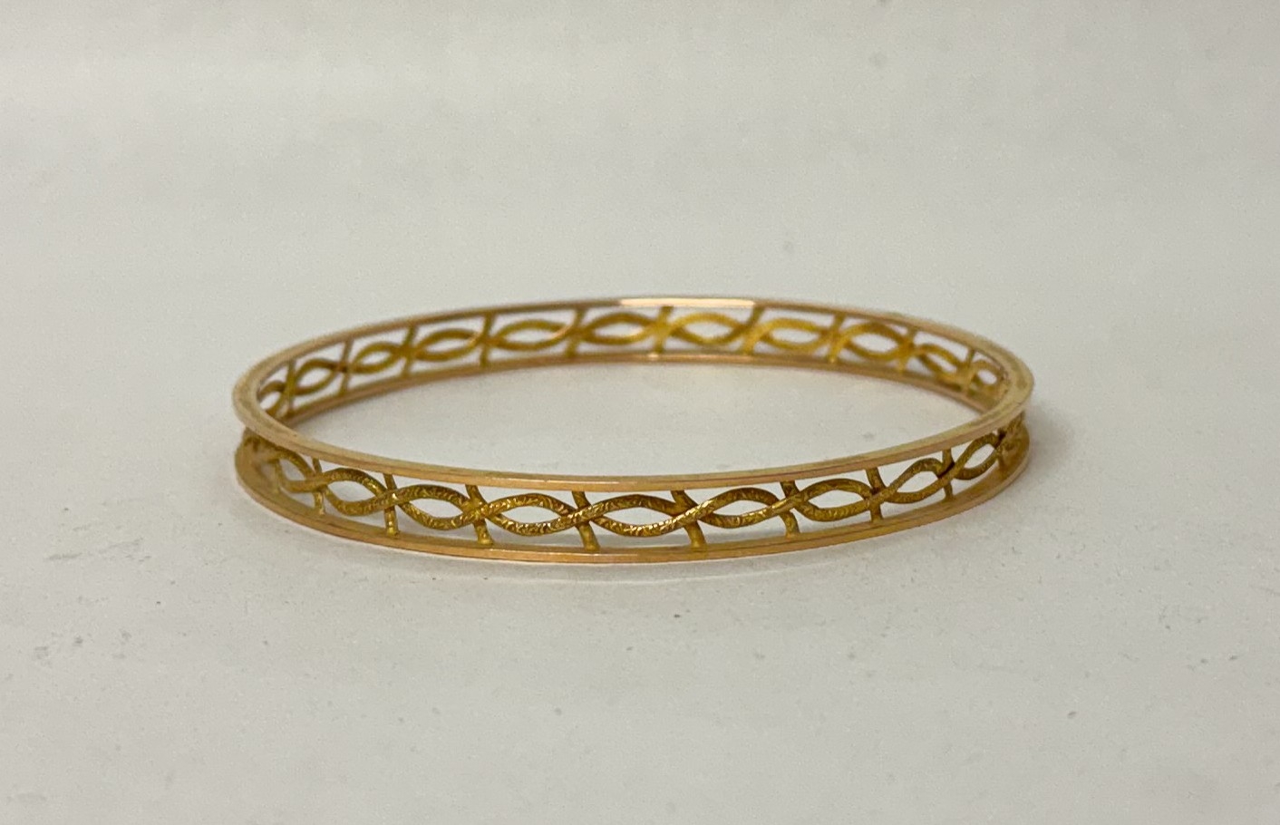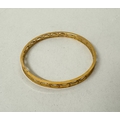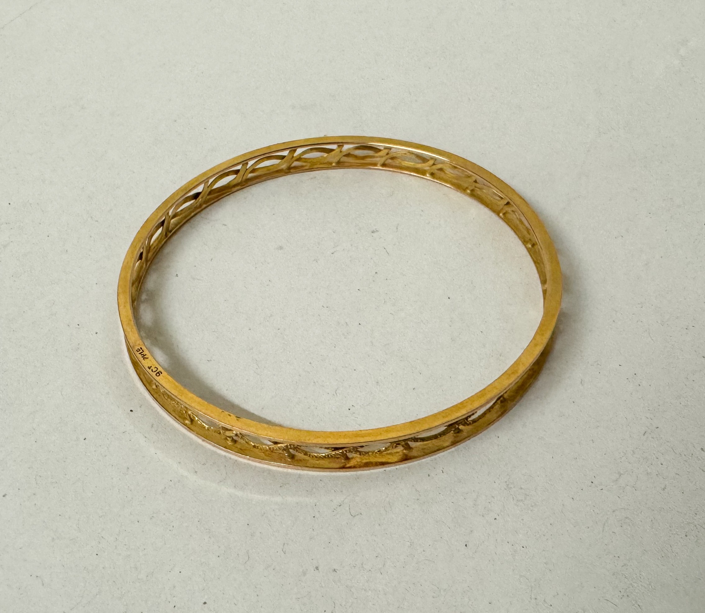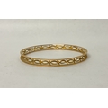 9ct gold pierced bangle with engraved decoration to the centre panels. 13.4g