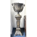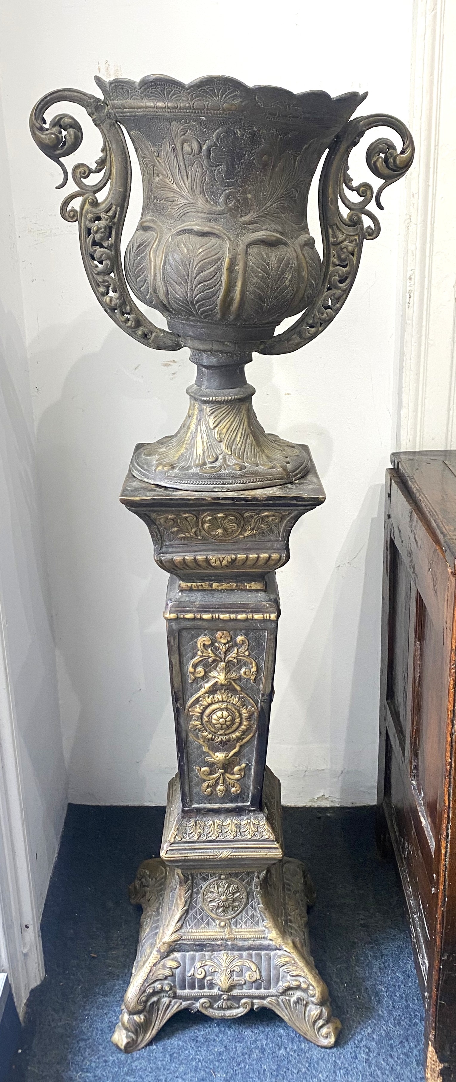 An ornate cast bronzed metal twin handled urn / jardiniere, on pedestal stand, decorated throughout with embossed and chased stylised foliate motifs, combined height 132cm.