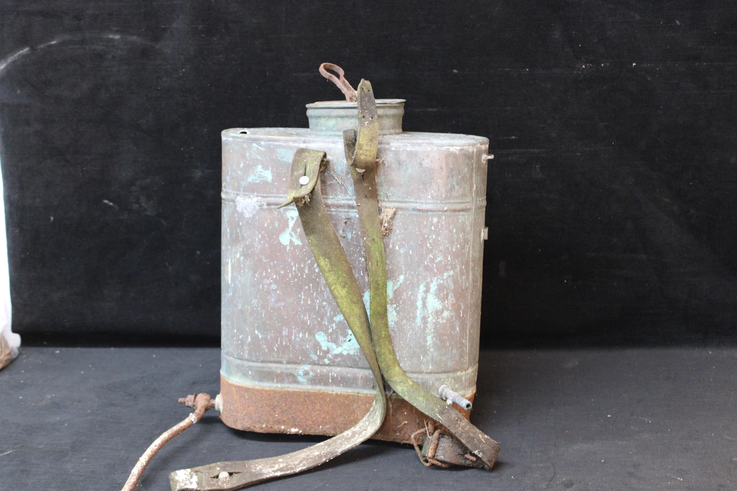 A vintage copper Mysto knapsack sprayer
