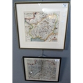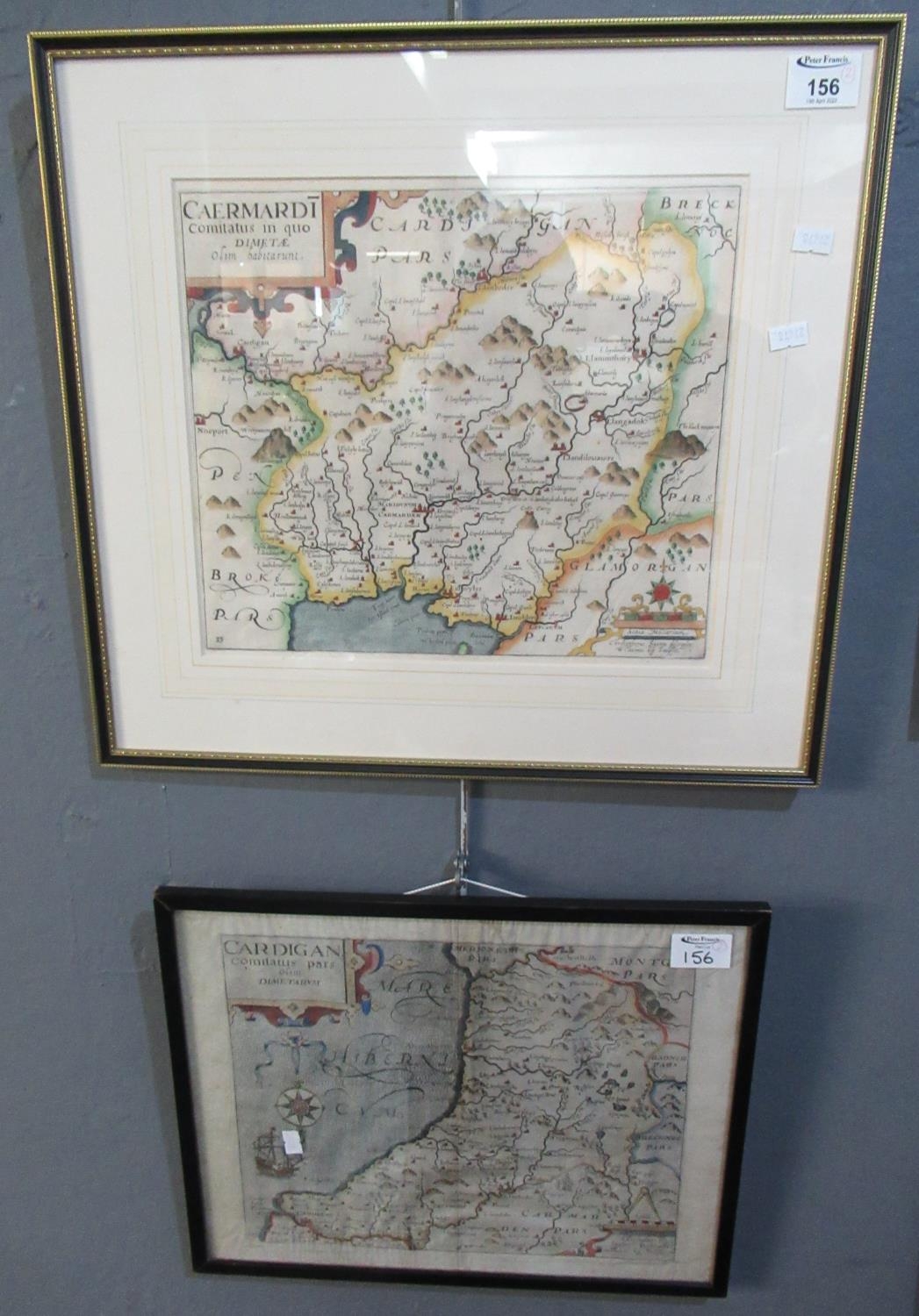 Christopher Saxton & William Kip ,"Caermardi", Carmarthen, Hand coloured original map, 27.5 x 32.5cm approx together with another Saxton & Kip Original sparely coloured map of Cardigan approx 27 x 31.5 cm framed and glazed. (2)