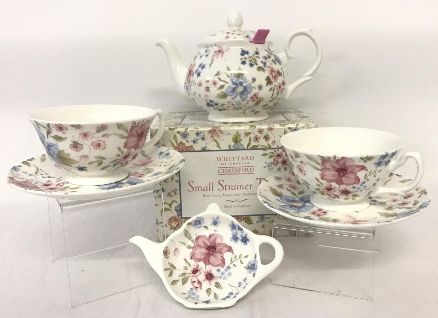 Brand New, Whittard of Chelsea, ex stock, "Victoria Chintz" tea set. Comprising: boxed small strainer teapot, 2 cups & saucers and tea tidy.