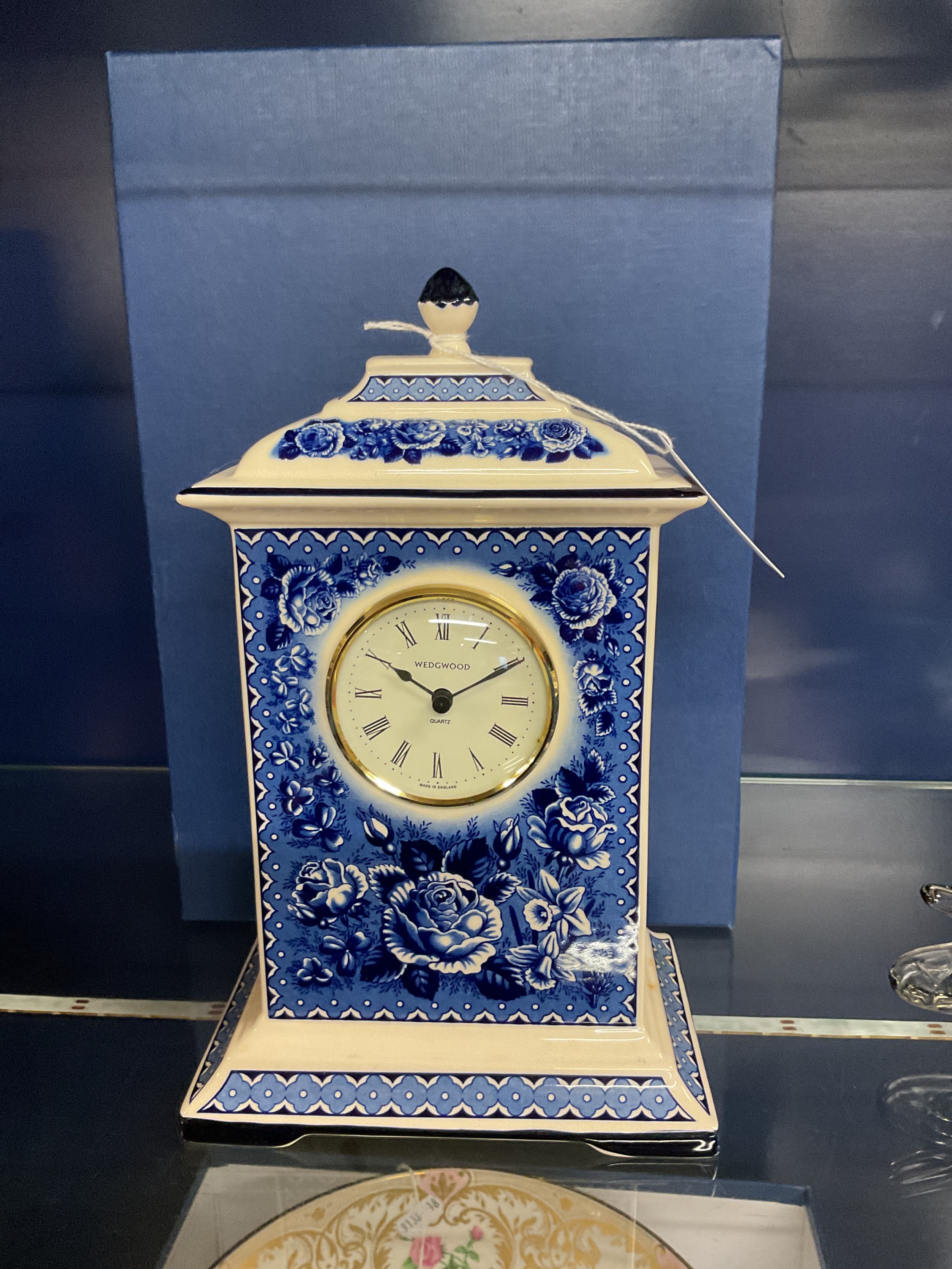 A boxed Wedgwood Queen's ware Limited Edition blue and white Golden Jubilee Clock No 31/750 with certificates