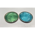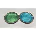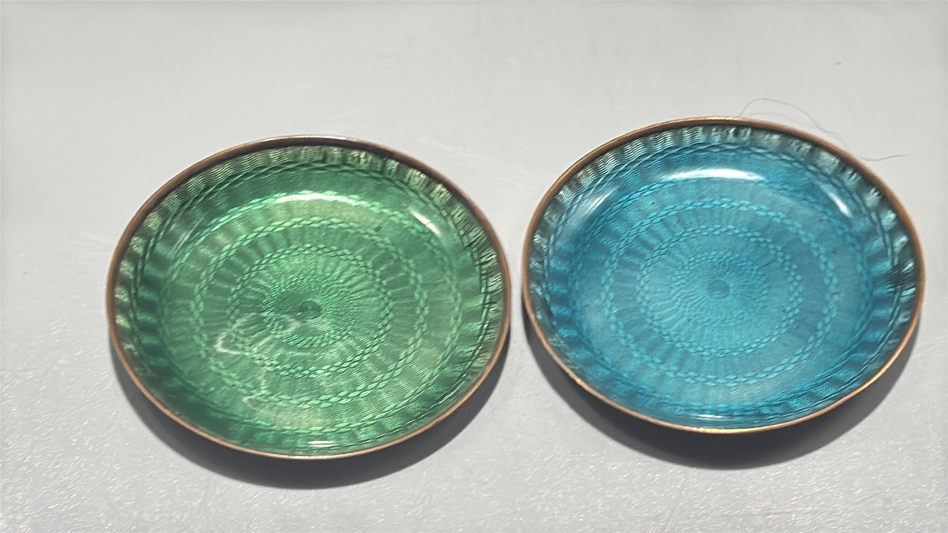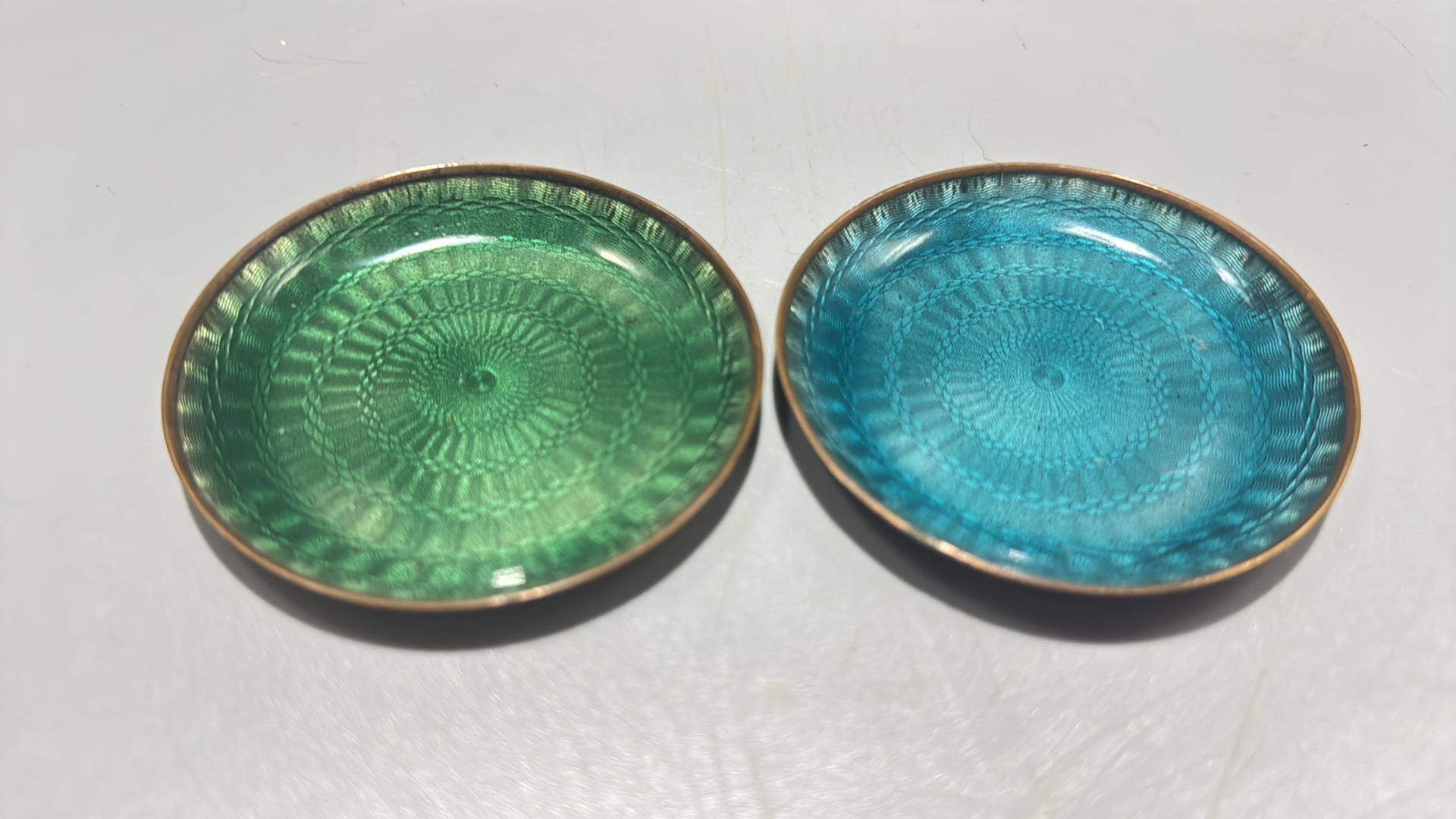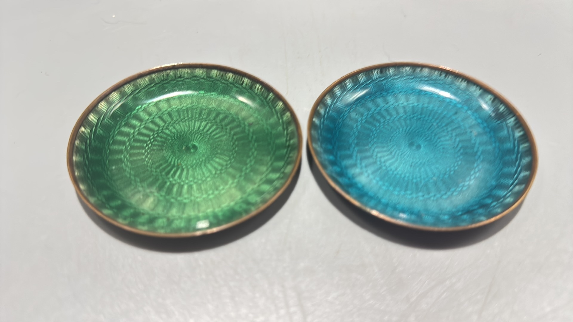 Pair of circular copper dishes with translucent guilloché enamel, one emerald-green, the other turquoise, each displaying engine-turned radiating motifs.