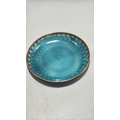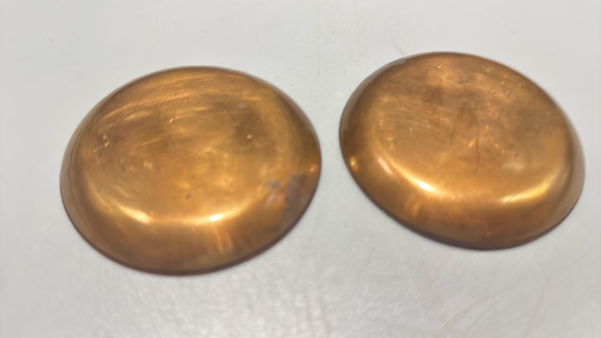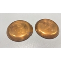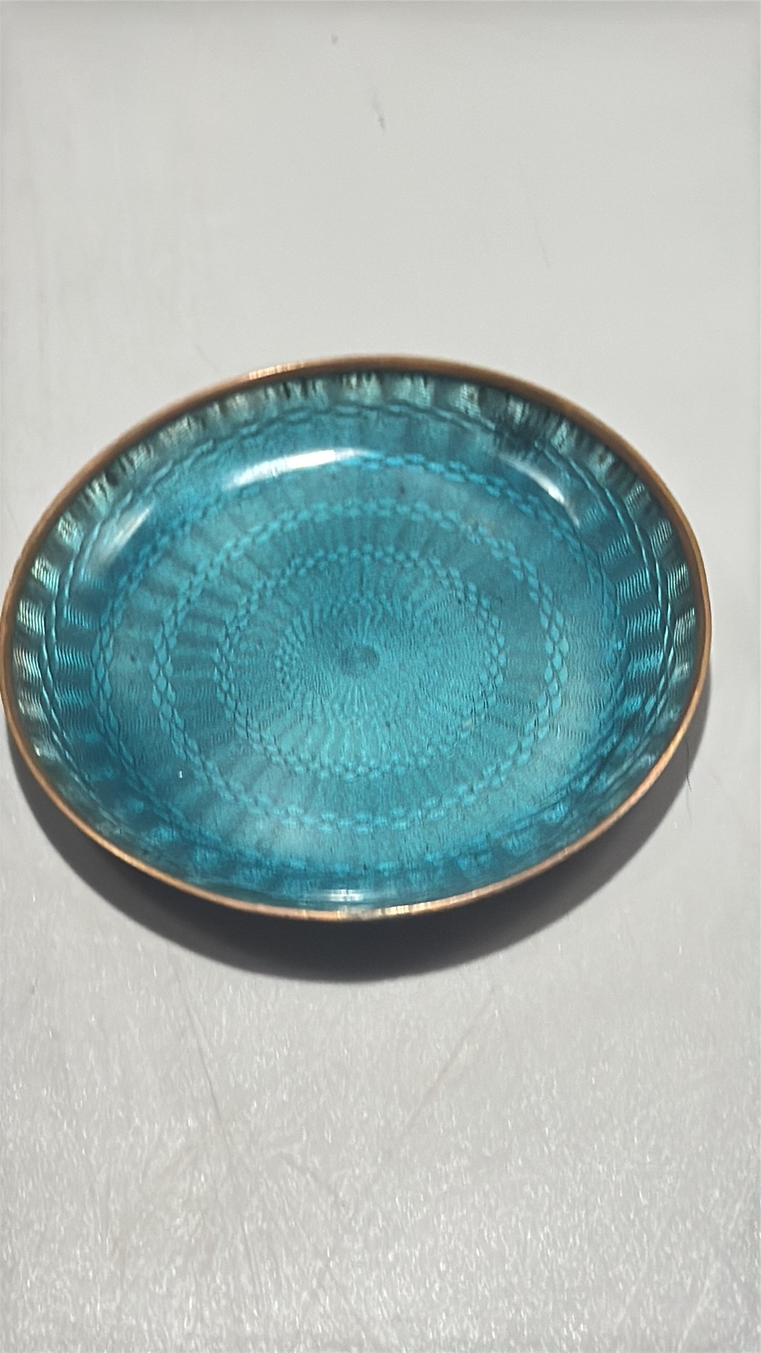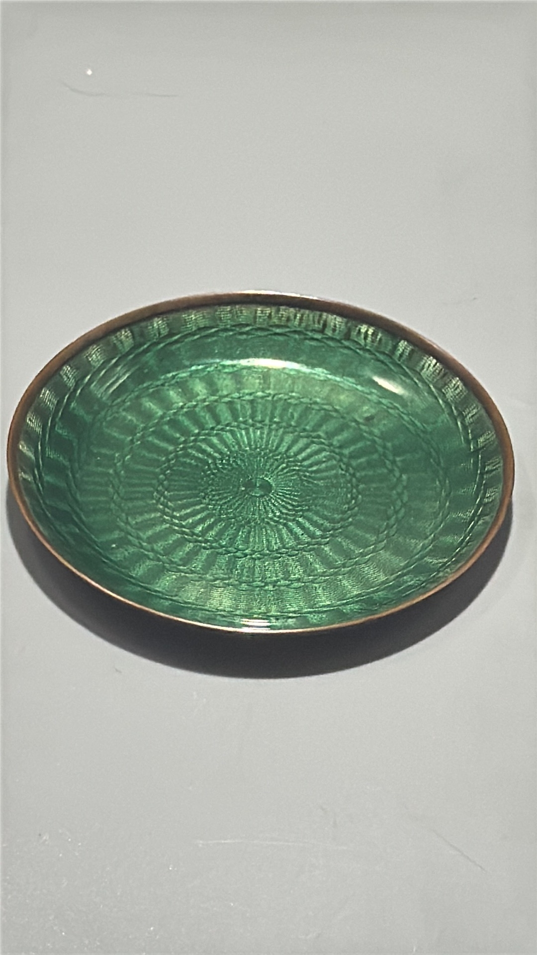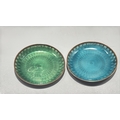 Pair of circular copper dishes with translucent guilloché enamel, one emerald-green, the other turquoise, each displaying engine-turned radiating motifs.