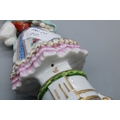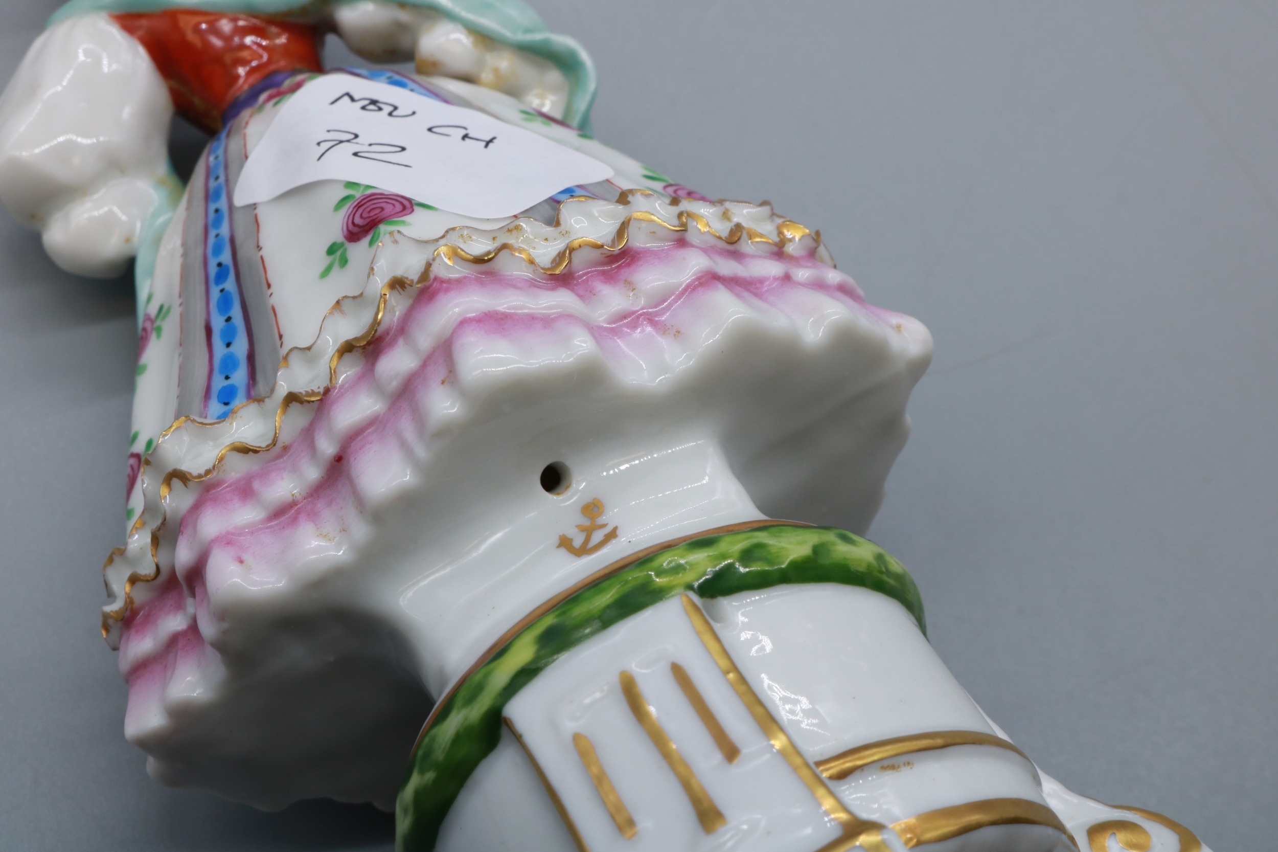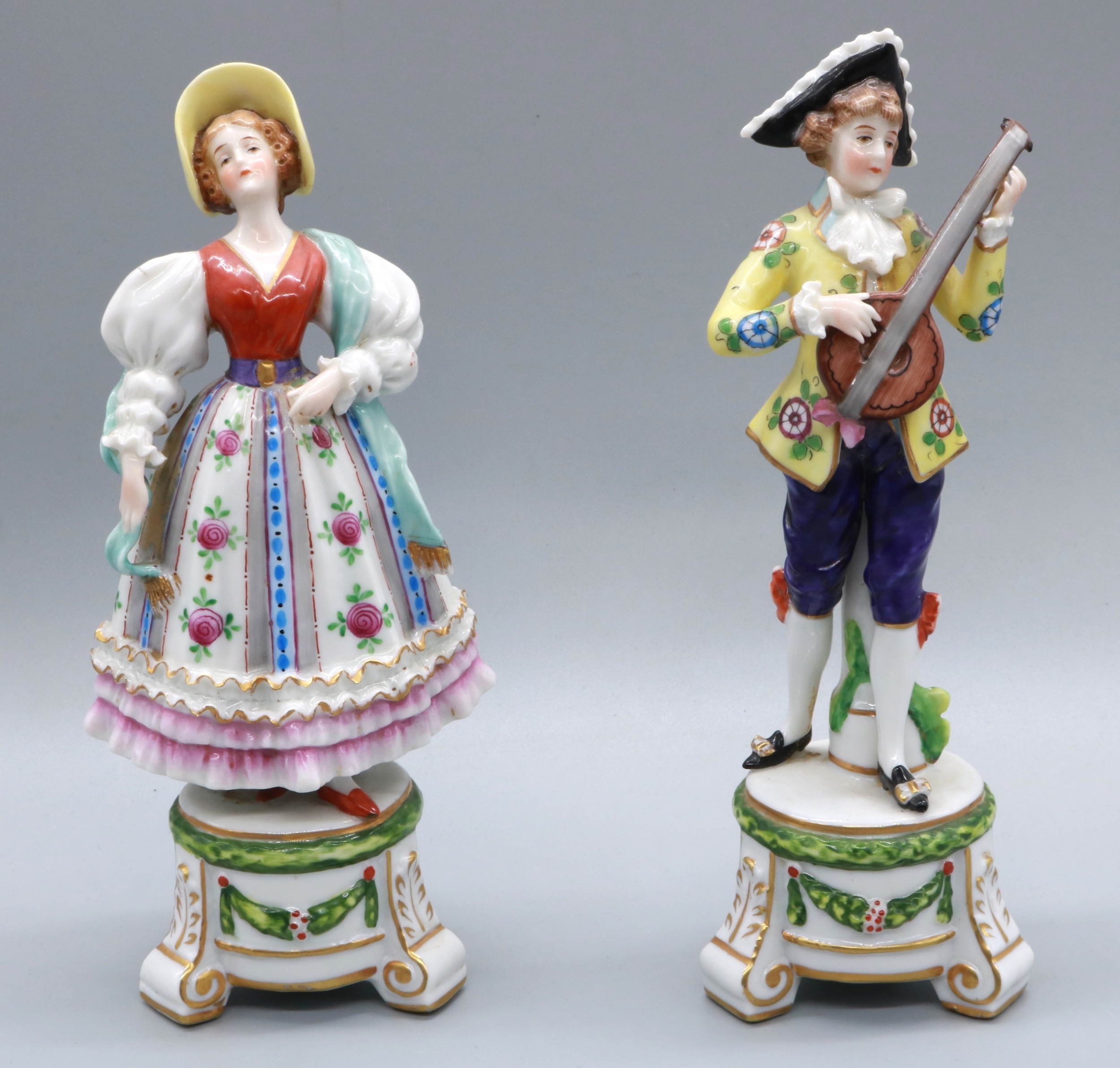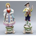 Pair of Chelsea style continental porcelain models of a Musician and Dancer, decorated in coloured enamels on circular bases with three scroll feet, gilt detail with pseudo gold anchor marks, H19cm (2)