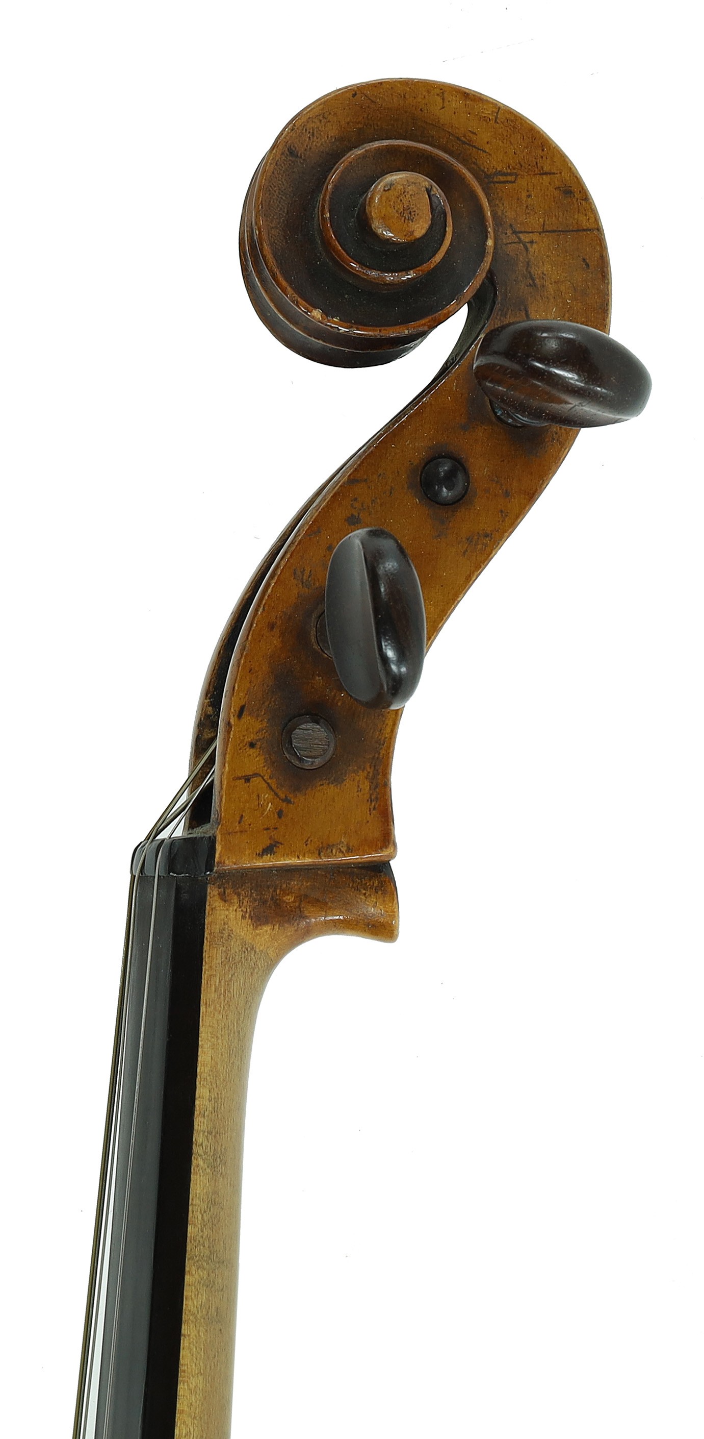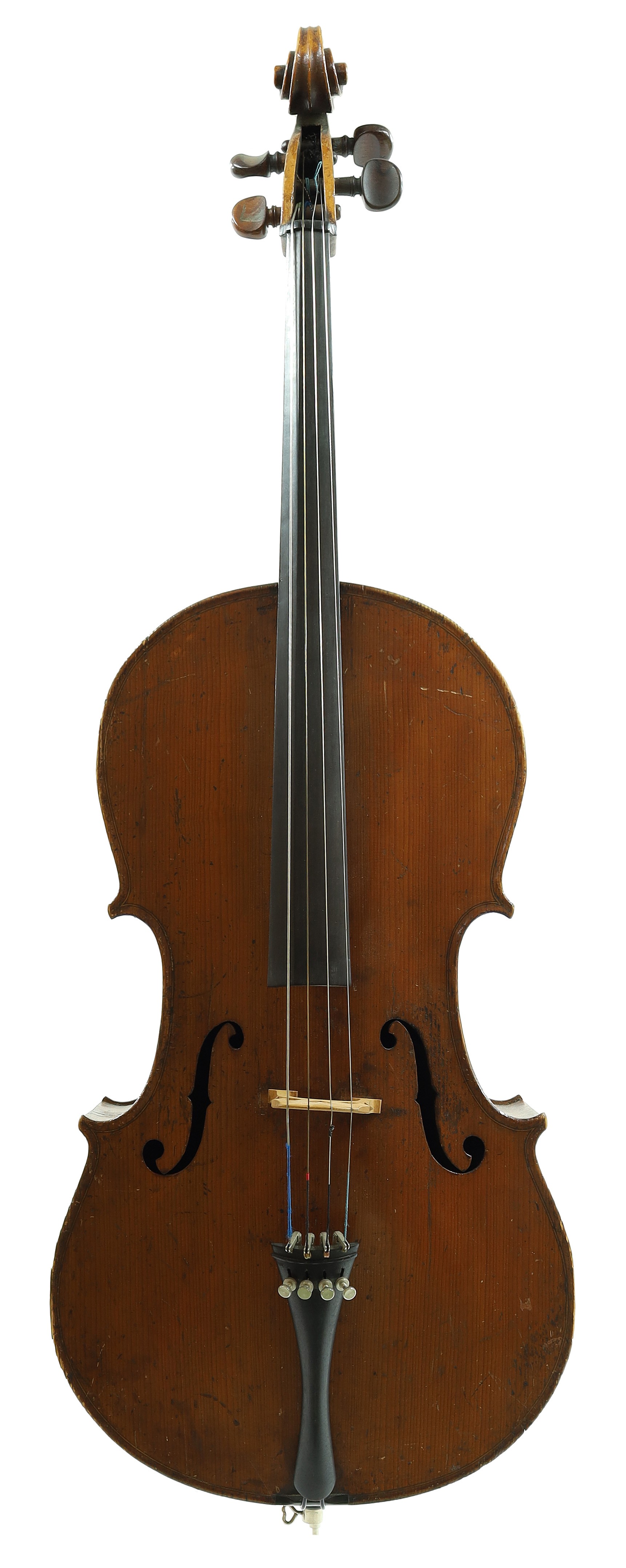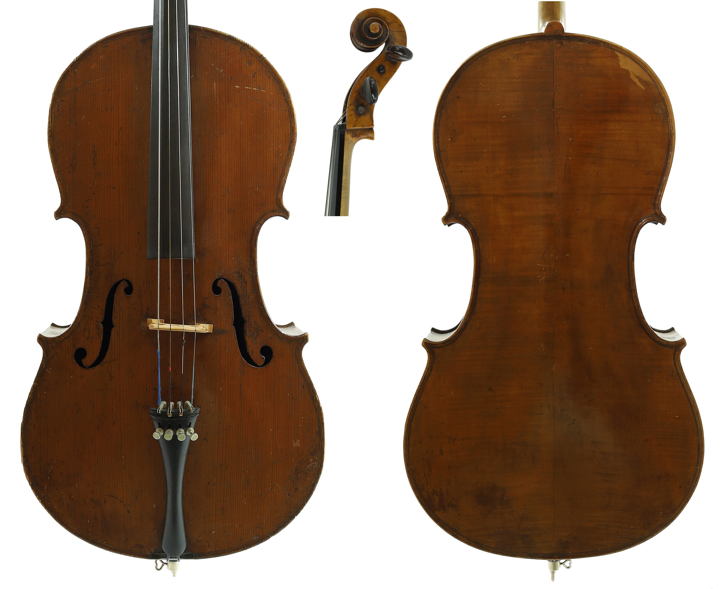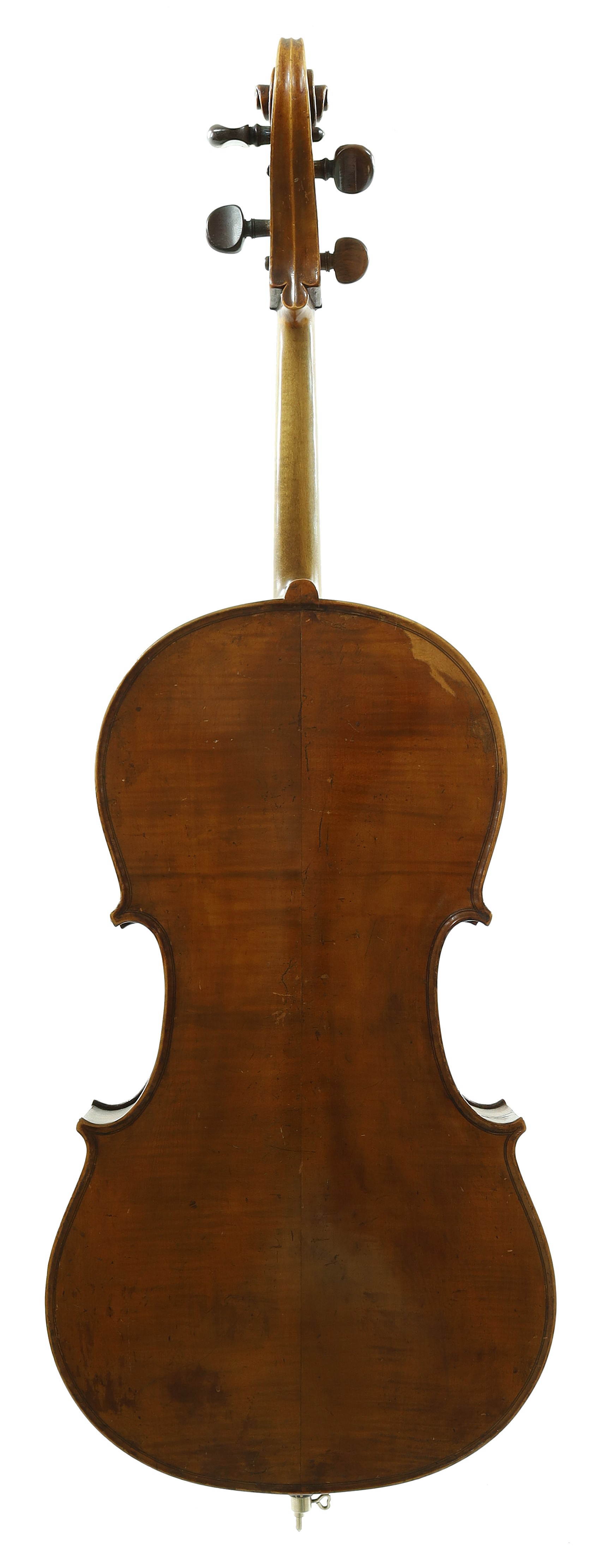 19th century German violoncello, unlabelled, the two piece back of faint medium curl with similar wood to the sides, the head of plainish wood, the table of a broad width grain and the varnish of a golden-brown colour, 30 1/4", 76.90cm