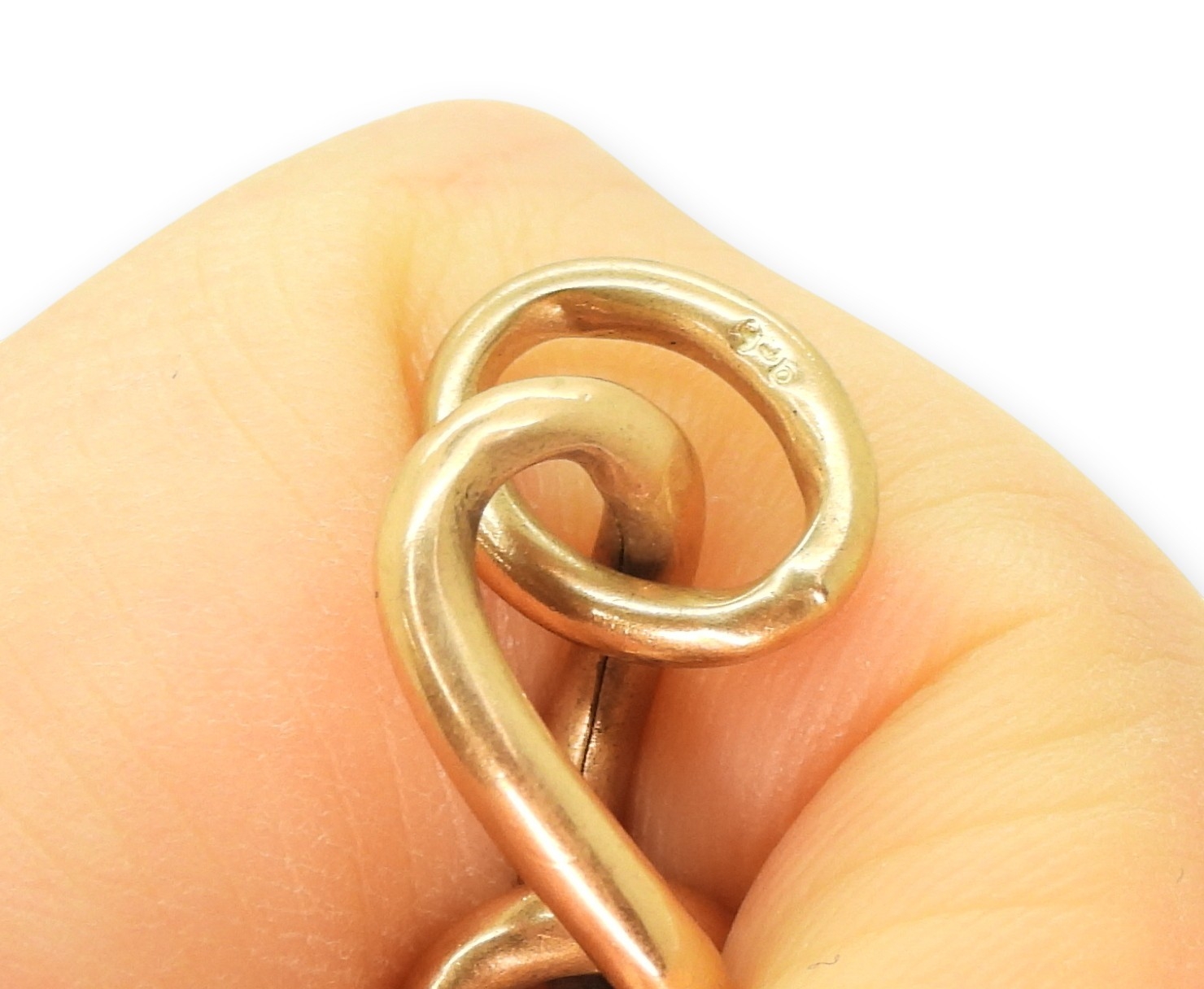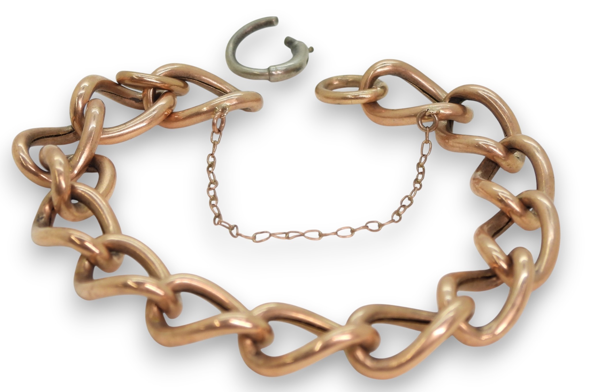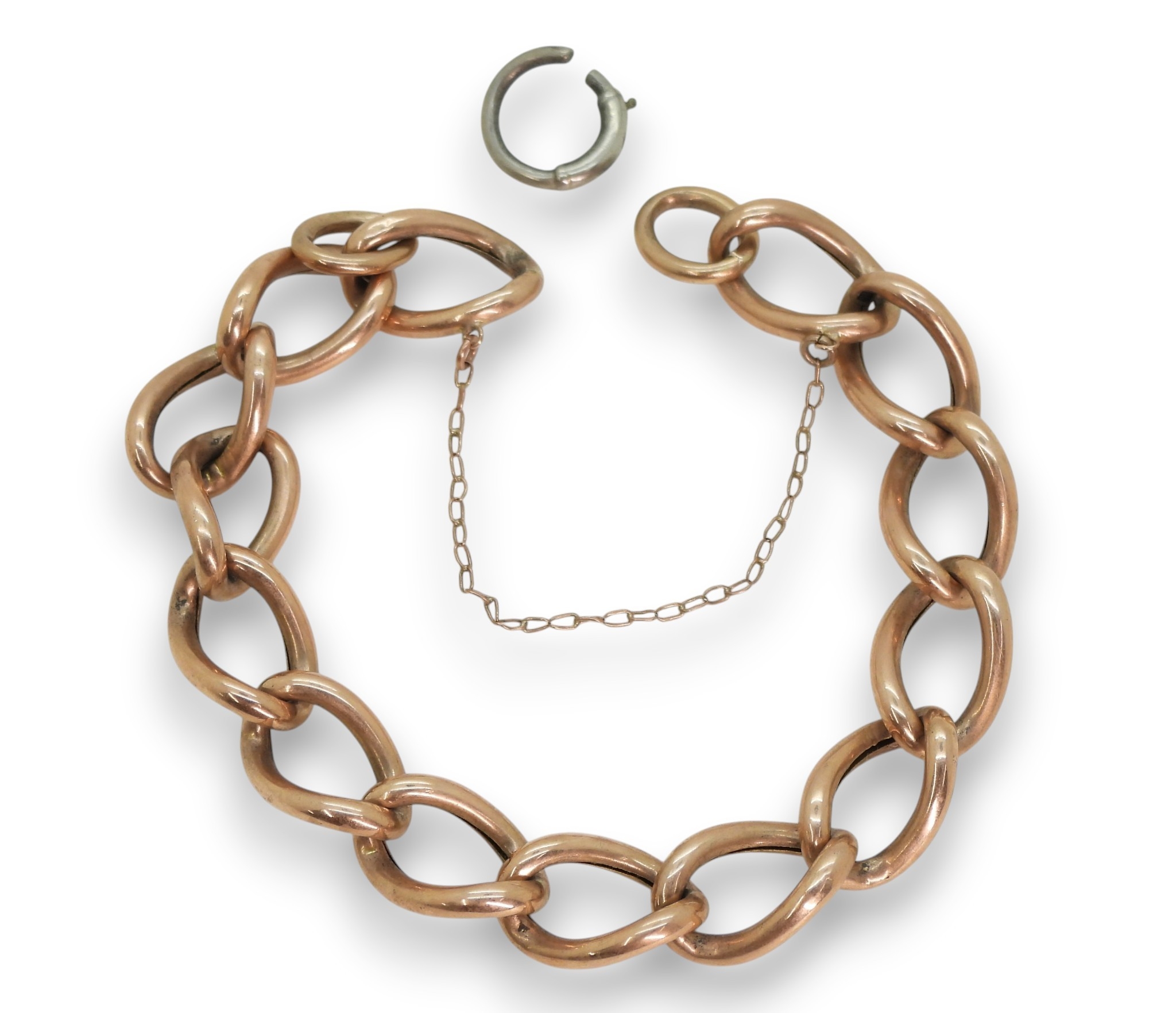 A 9ct rose gold curb chain, with a white metal (probably silver) clasp, weight without the clasp 9.5gms