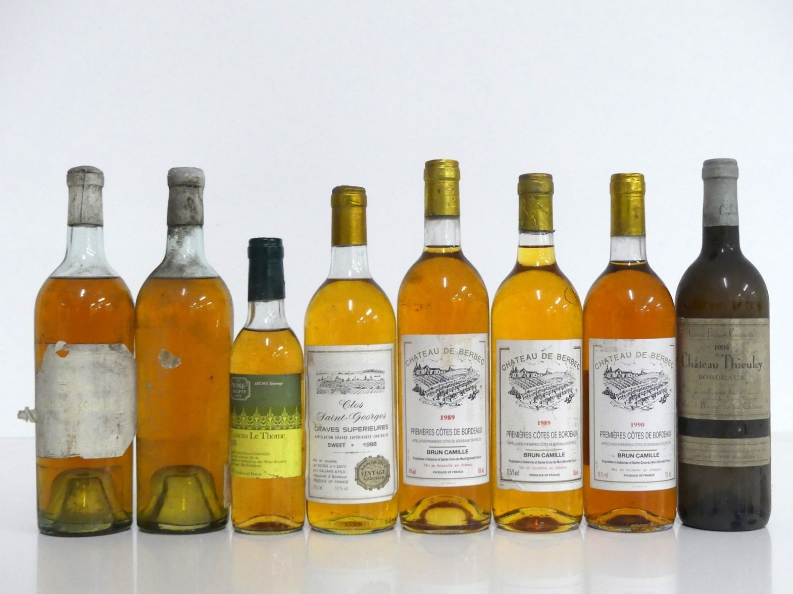 1 bt Ch. Couhins 1949 EB John Harvey & Sons ms/us, vsl bs, faded label 1 bt believed Ch. Couhins Vintage Unknown 1 hf bt Ch. Le Thome 1976 Graves, ts, EB The Wine Society 1 bt Clos Saint-Georges 1988 Graves Supérieurs ts, vsl bs 2 bts Ch. de Berbec 1989 Premières Côtes de Bordeaux i.n, vsl bs 1 bt Ch. de Berbec 1990 Premières Côtes de Bordeaux vts, vsl bs 1 bt Ch. Thieuley Cuvée Francis Courselle Bordeaux 1994 i.n, bs Above 7 bottles and 1 half bottle