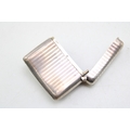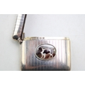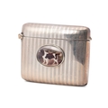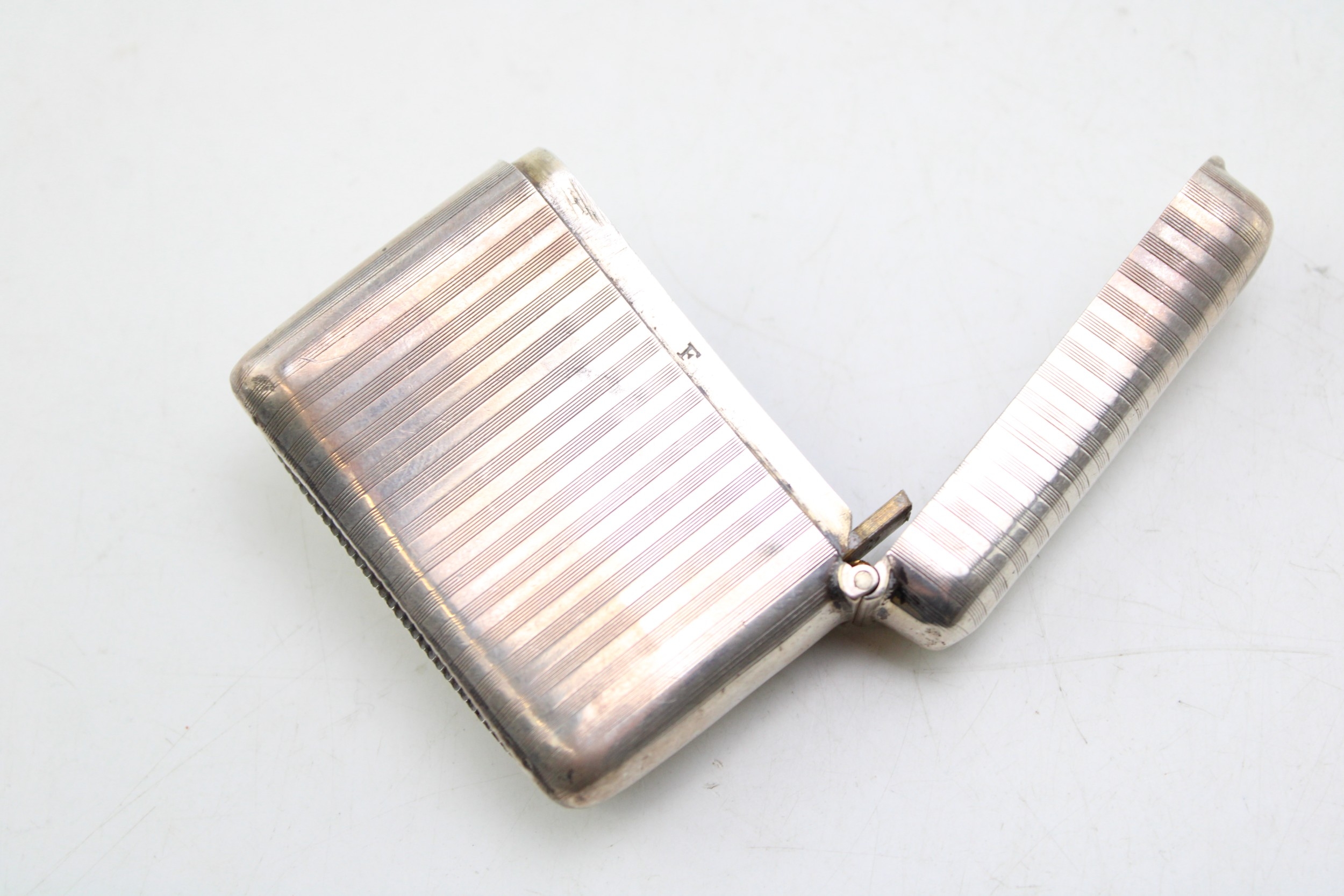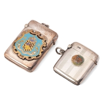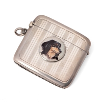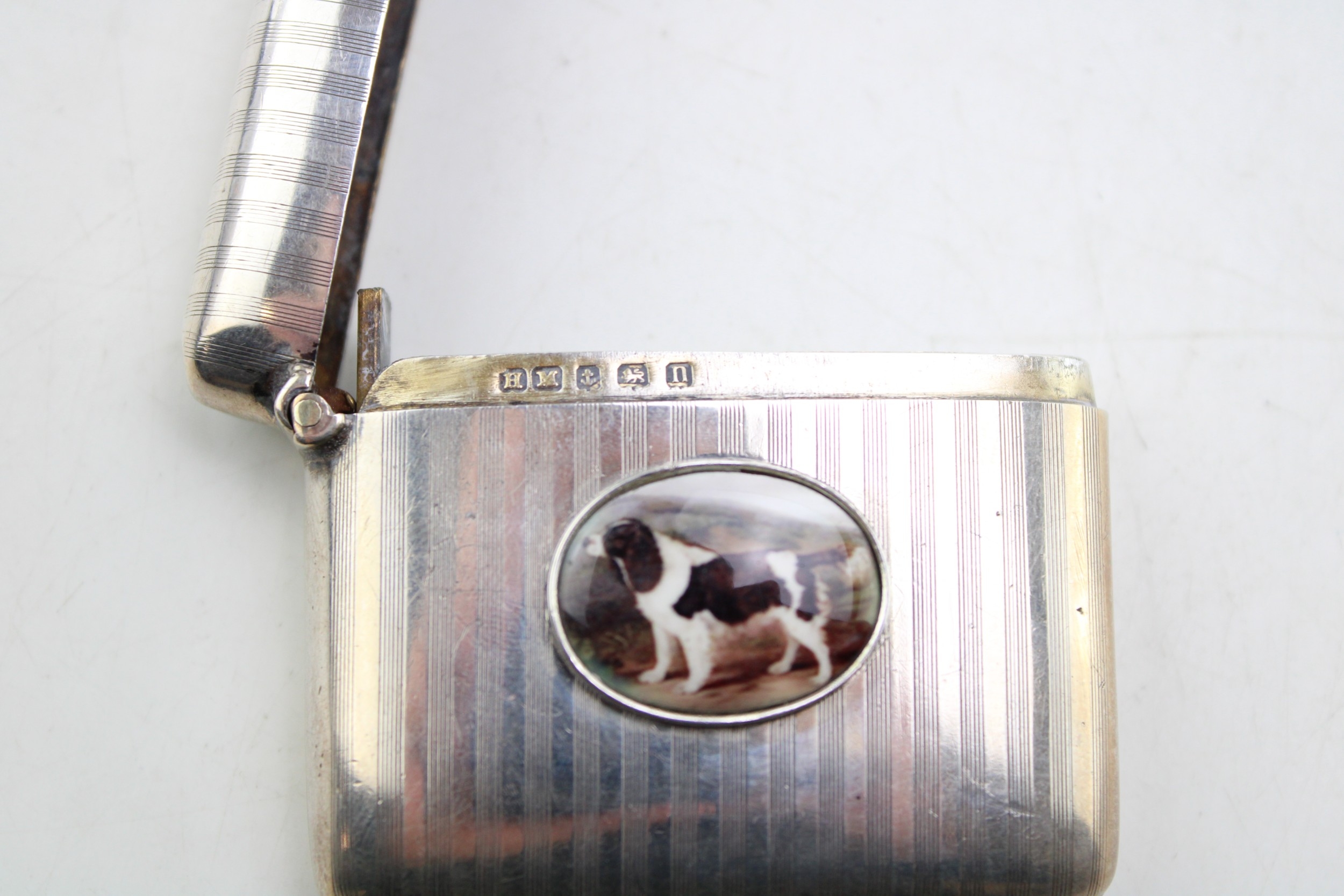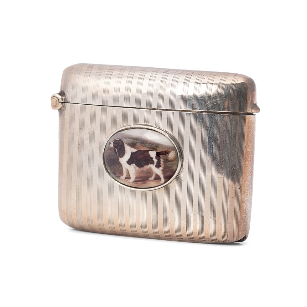 A silver vesta case of curved form with engine turned engraving and applied plaque depicting a working spaniel in landscape, Henry Matthews, Birmingham 1912, 46.9g, 1.51toz.
