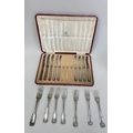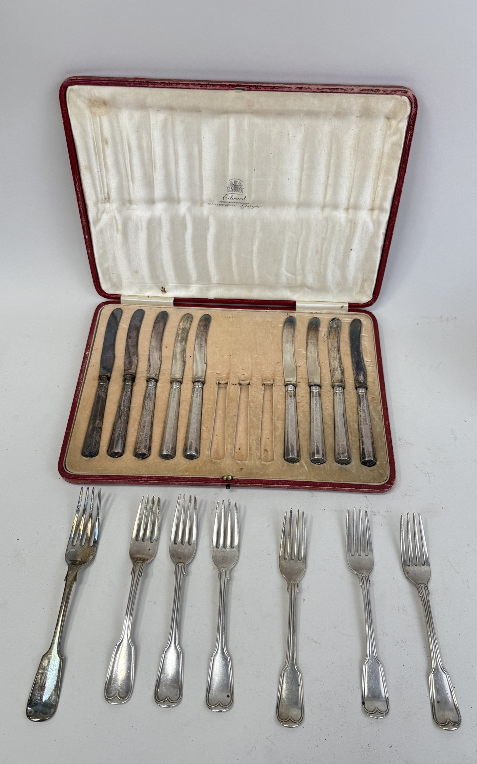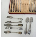 A GROUP OF SILVER FORKS TOGETHER WITH SILVER HANDLED KNIVES (STAINLESS BLADES)