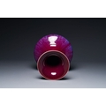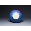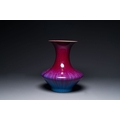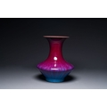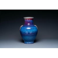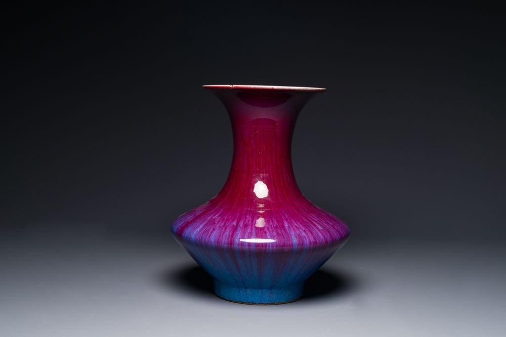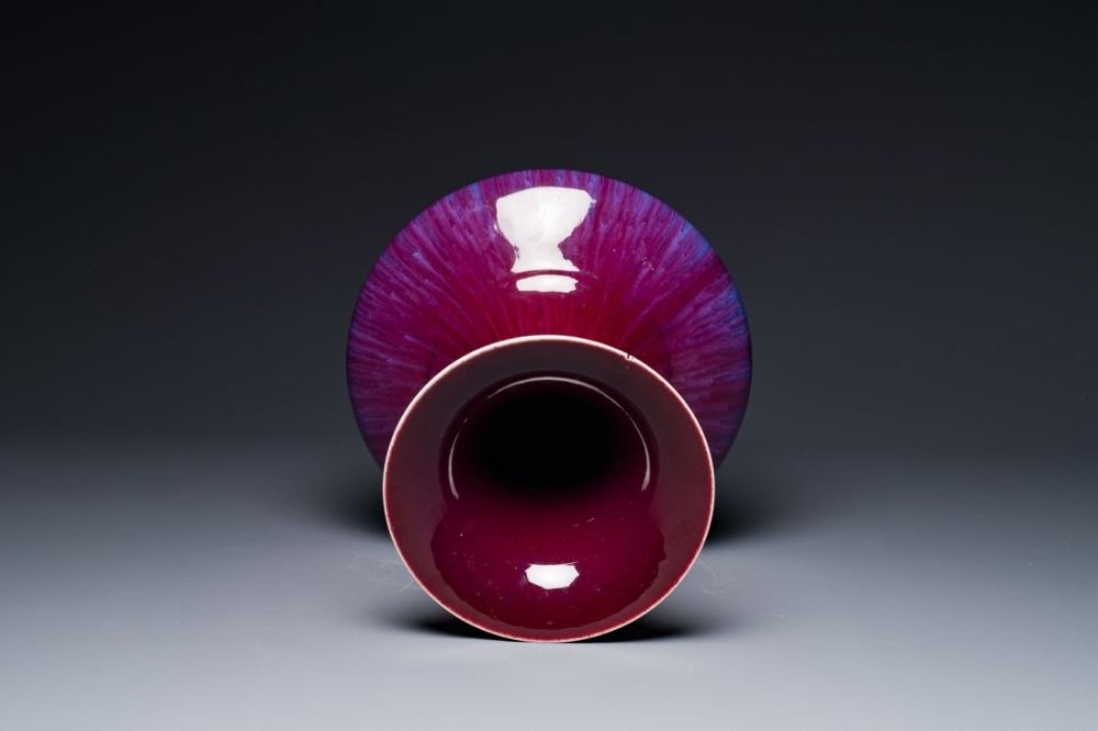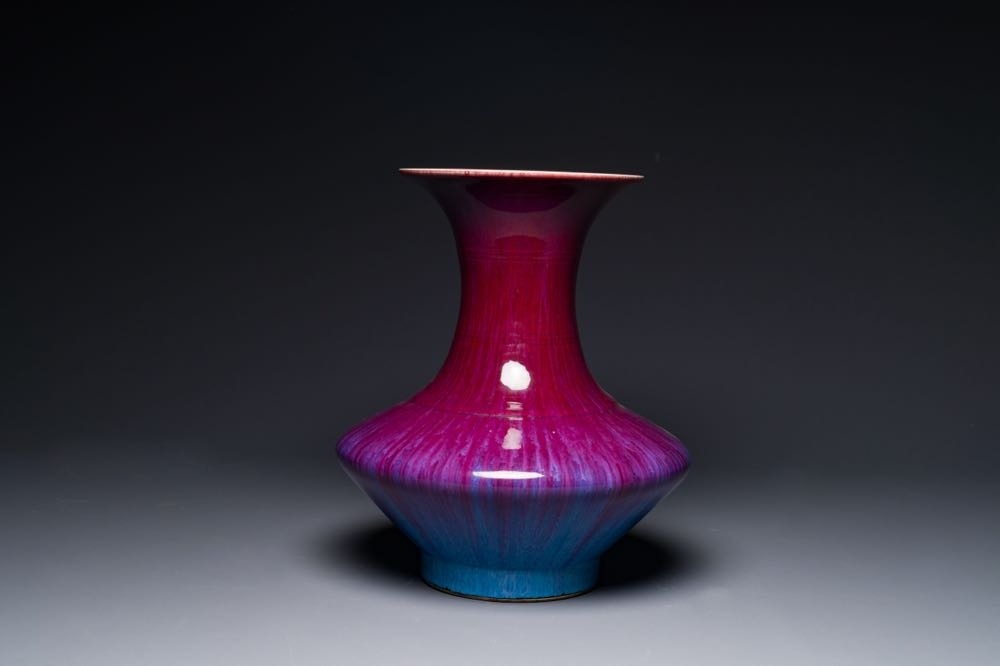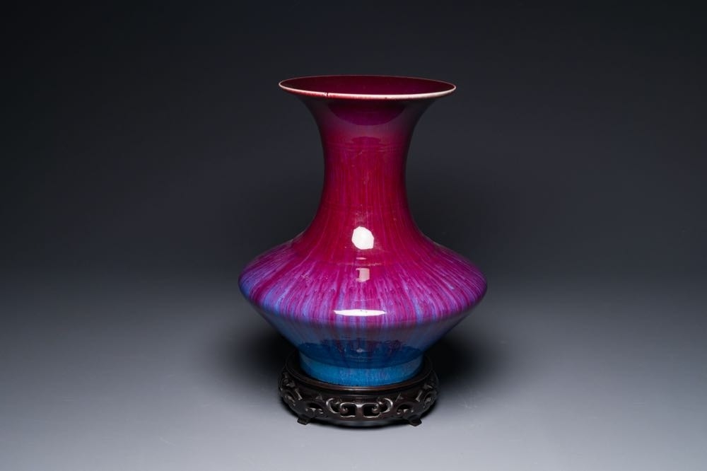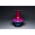 A Chinese flambe-glazed vase on a wooden base, 19th C.