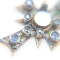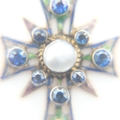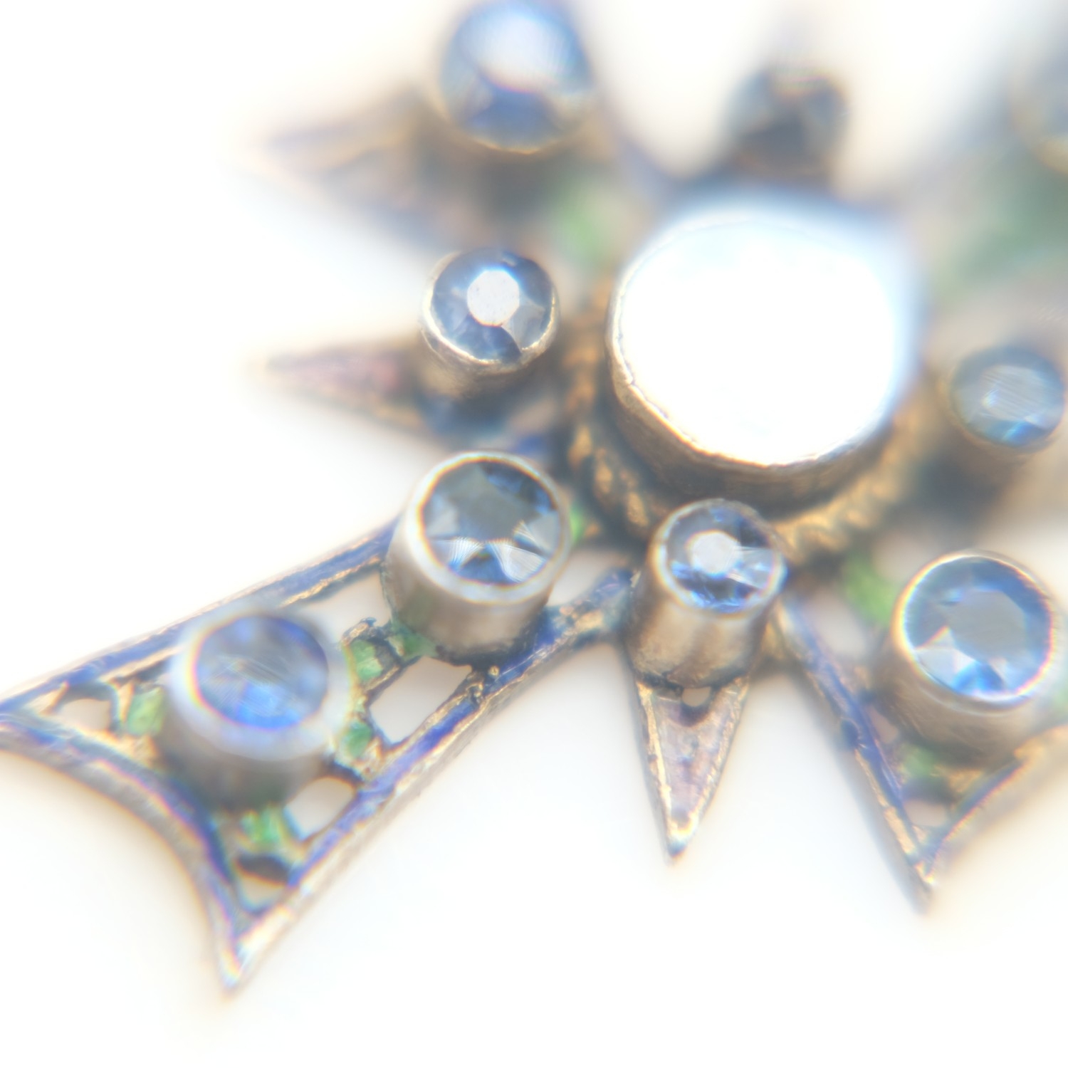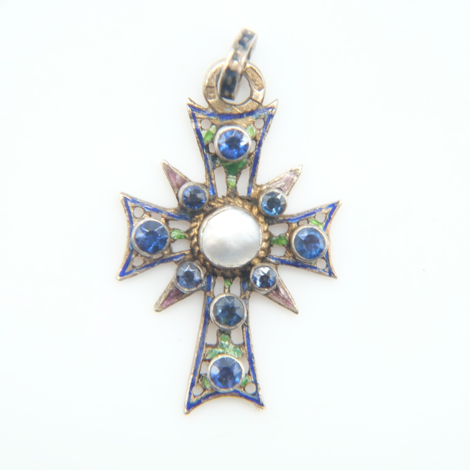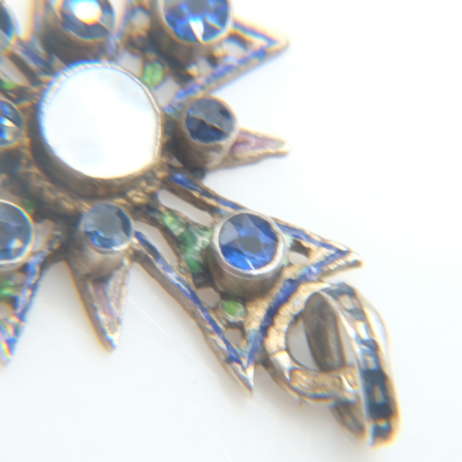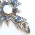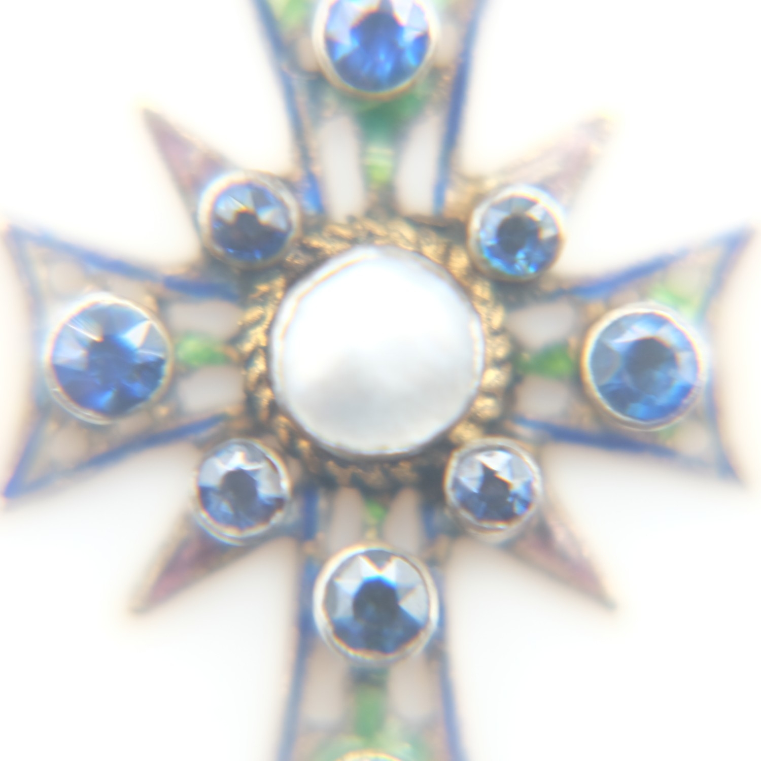 Austrian hallmarked silver cross pendant, enamelled and set with blue tourmaline and shell, Vienna assay, drop L: 35 mm, 3g. Some losses to the enamel, all stones present, hallmarks clear to the bale. UK P&P Group 0 (£7+VAT for the first lot and £1+VAT for subsequent lots)