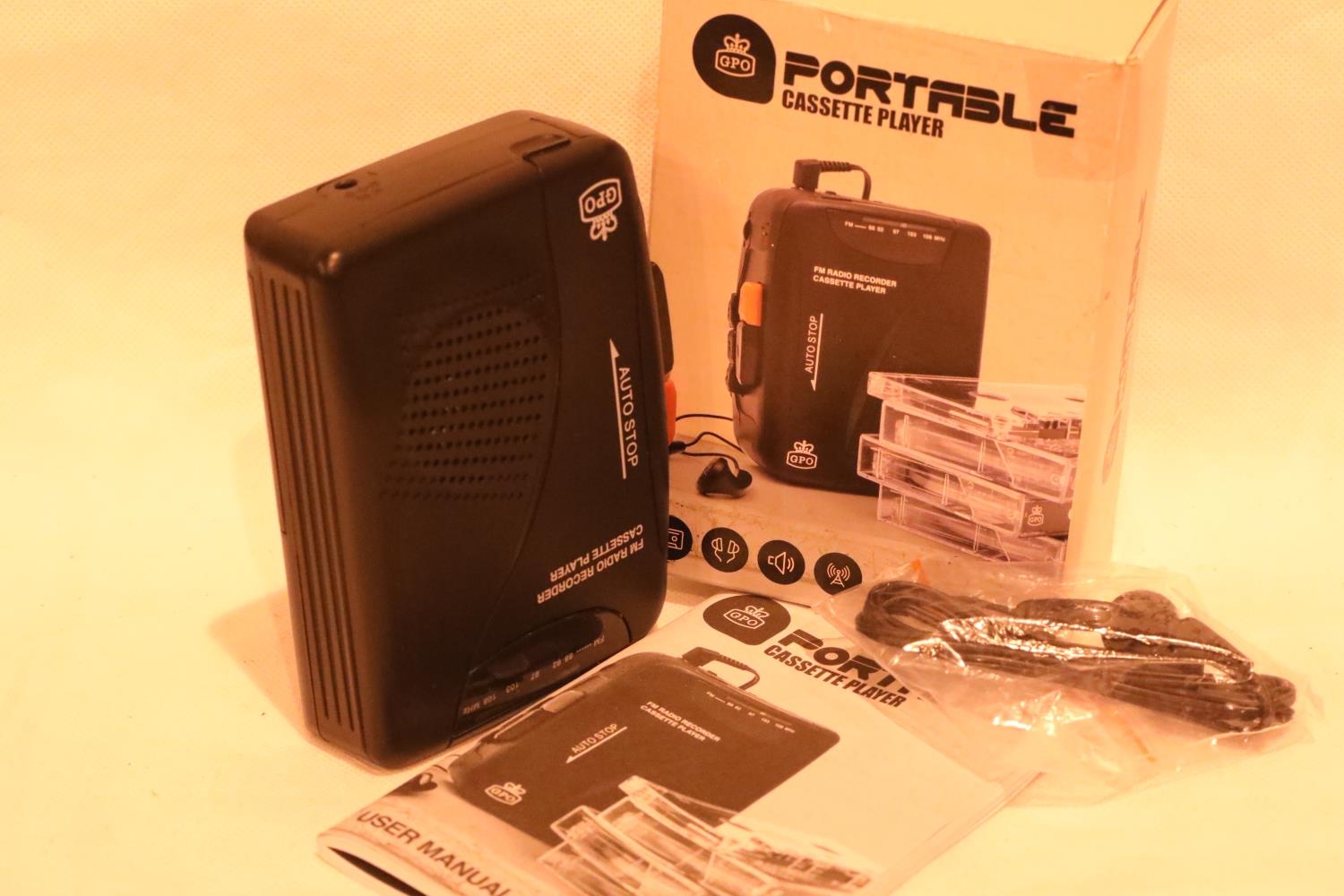 GPO Personal FM radio and cassette player, 3.5mm jack, and 3V DC in jack, with built in microphone, boxed. P&P Group 1 (£14+VAT for the first lot and £1+VAT for subsequent lots)