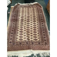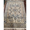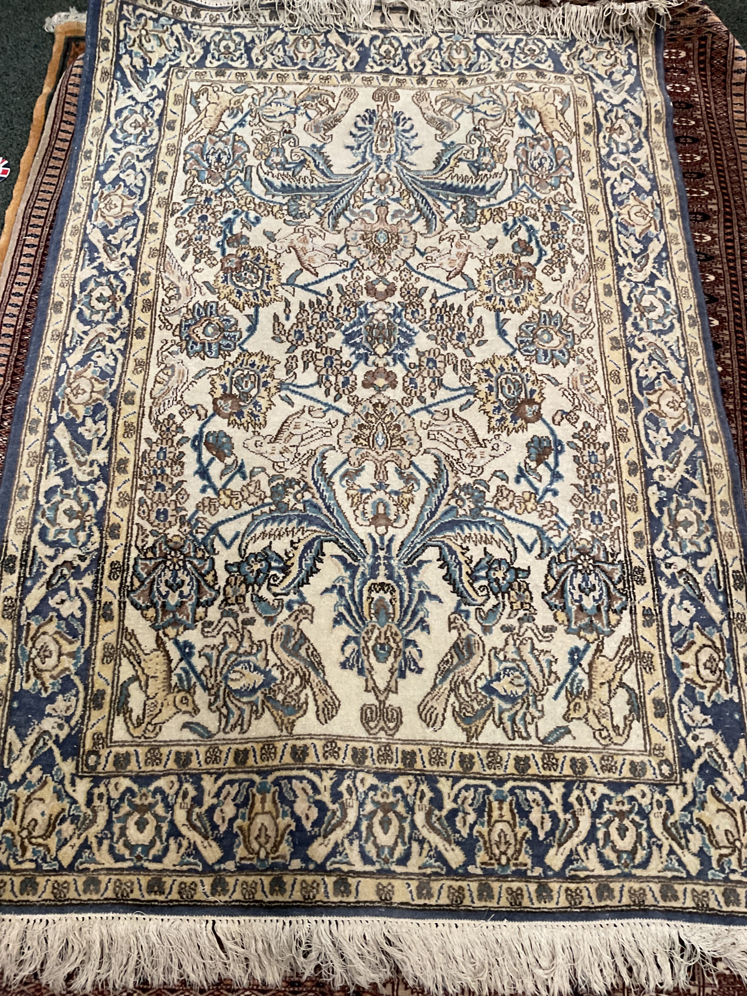 A beige and blue ground rug with bird and animal pattern 60" x 42"