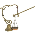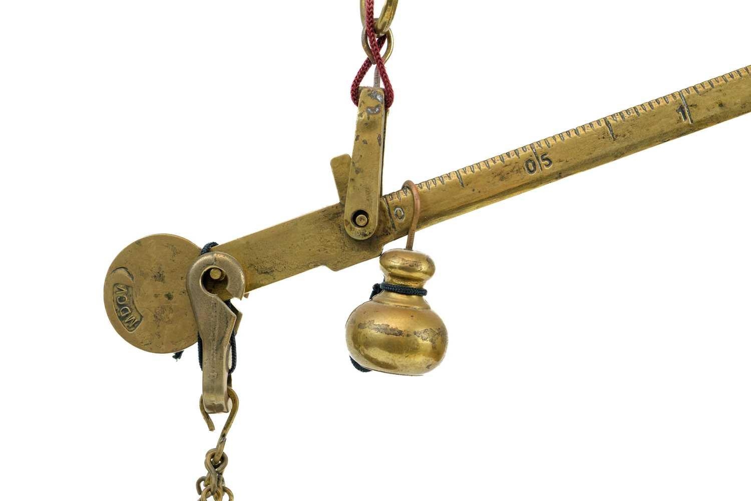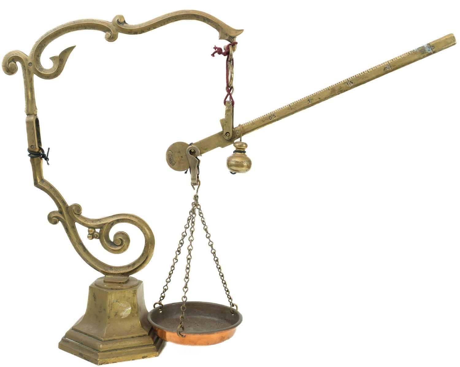 An early 20th century brass balance scales Marked MDVC, height 50cm.