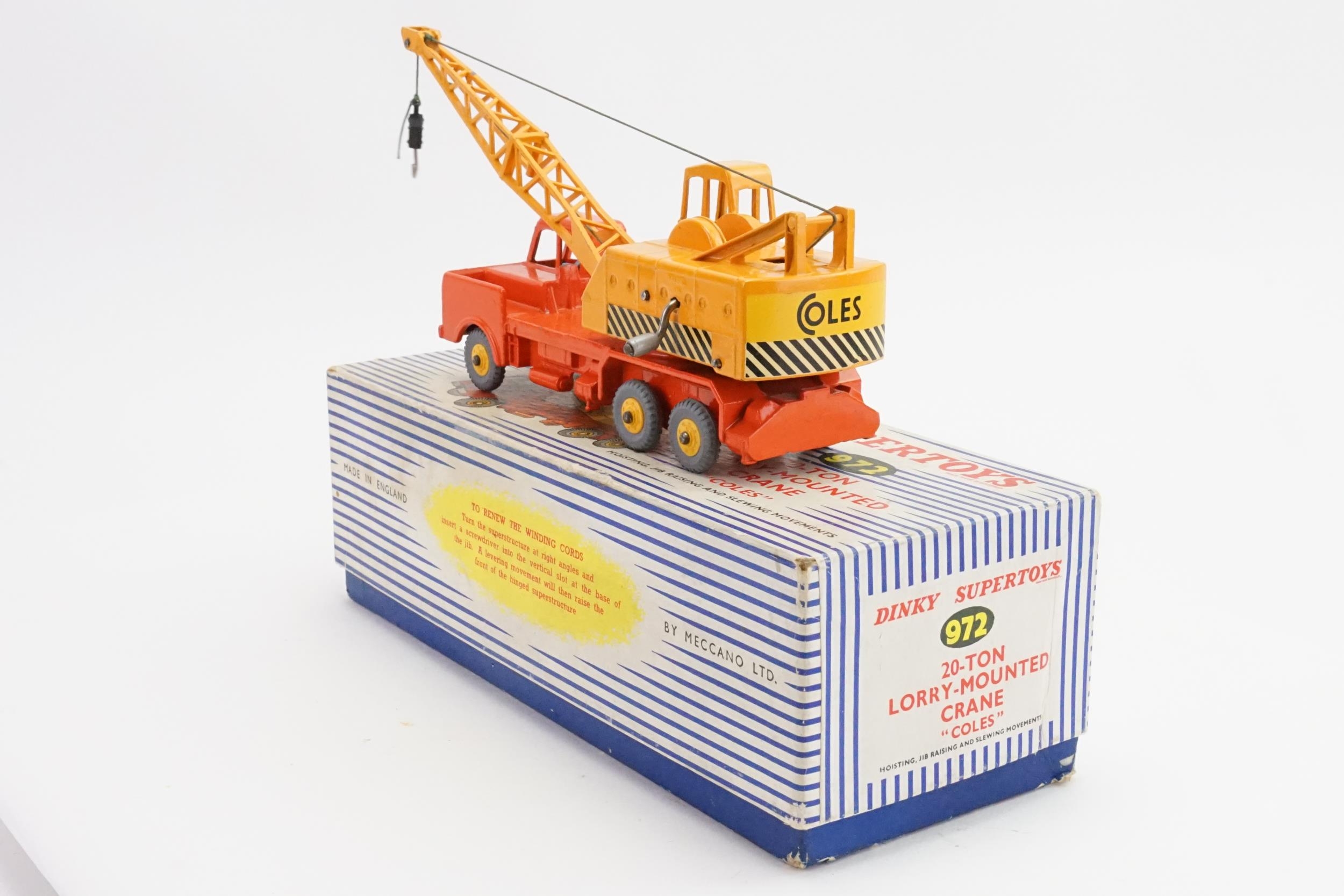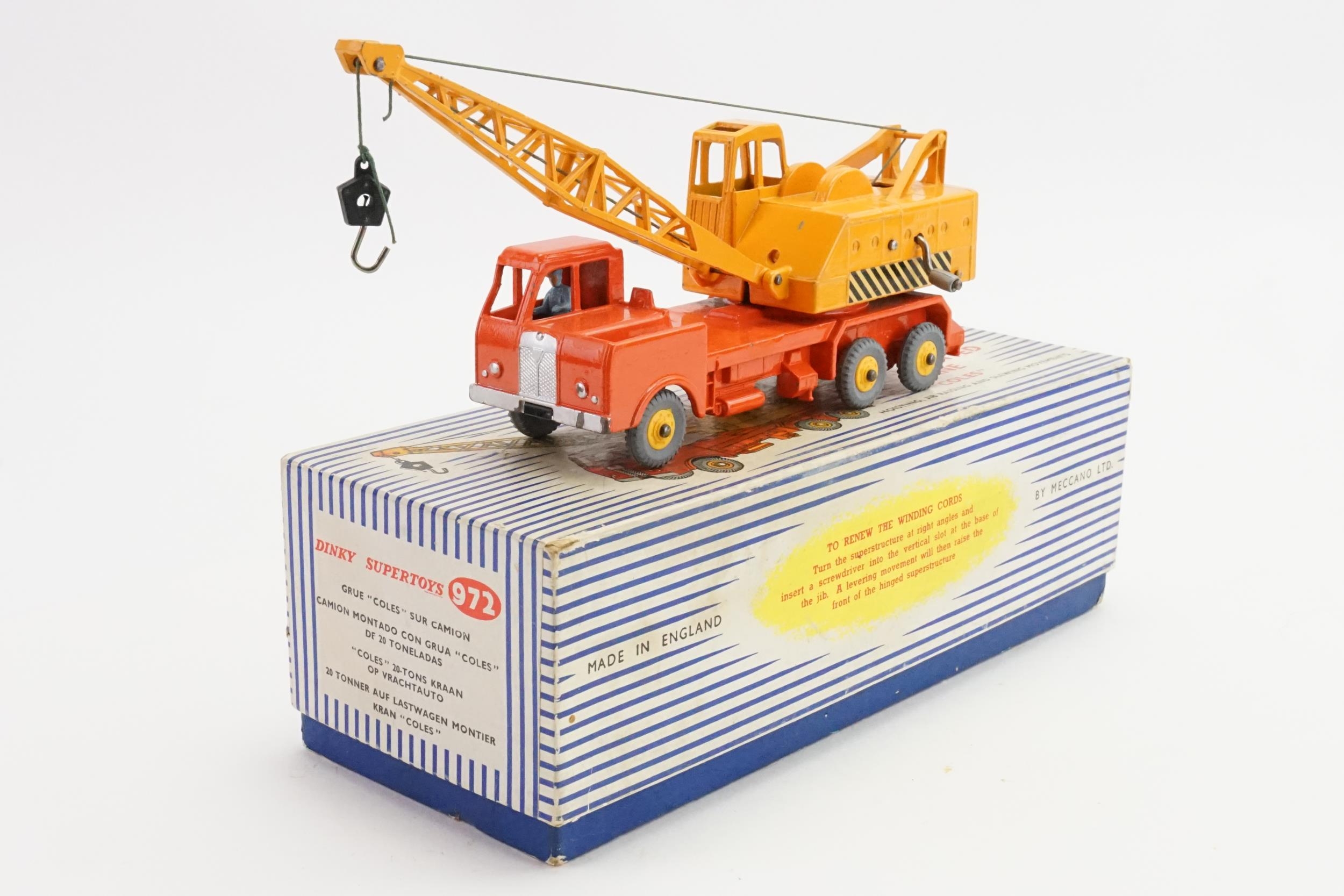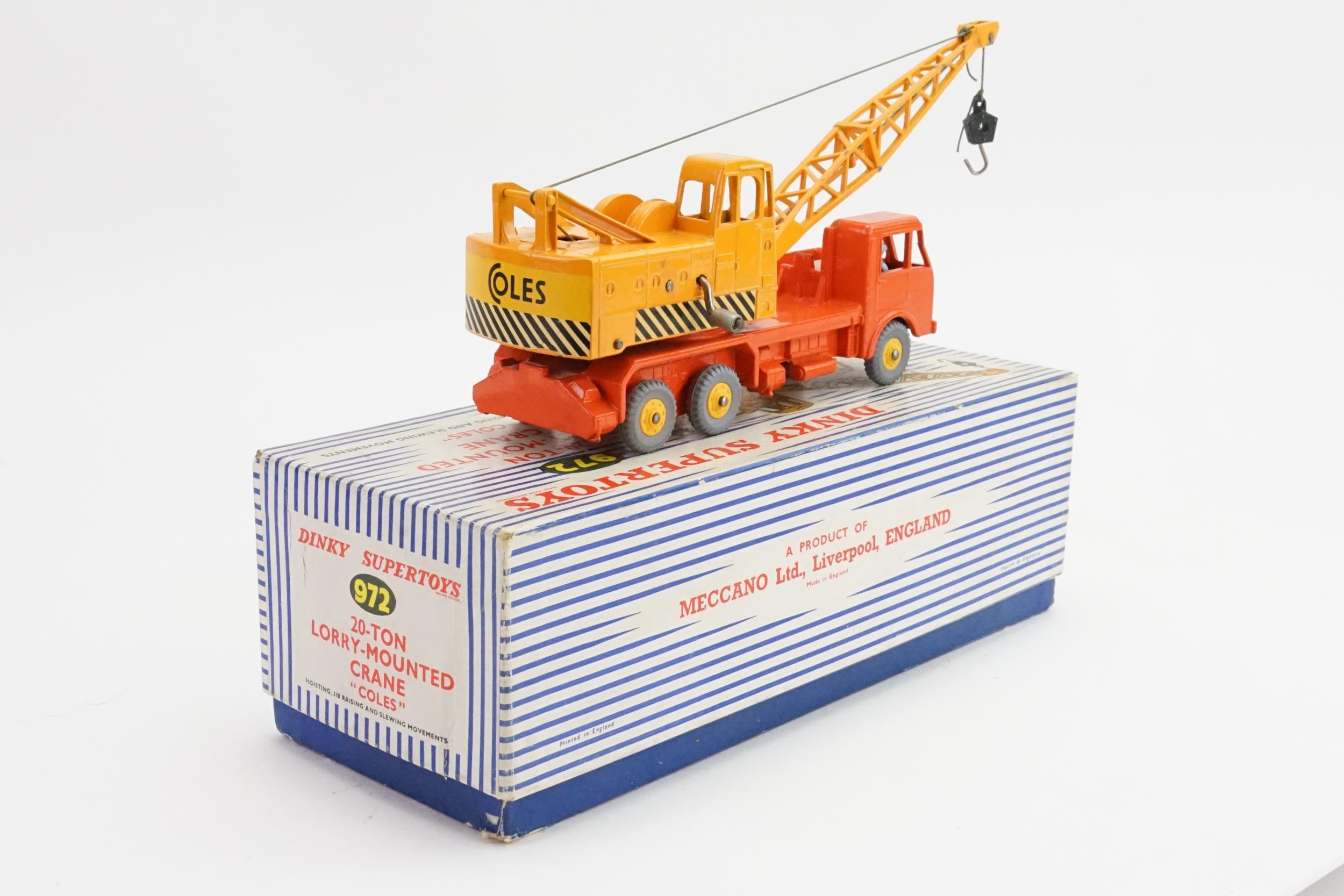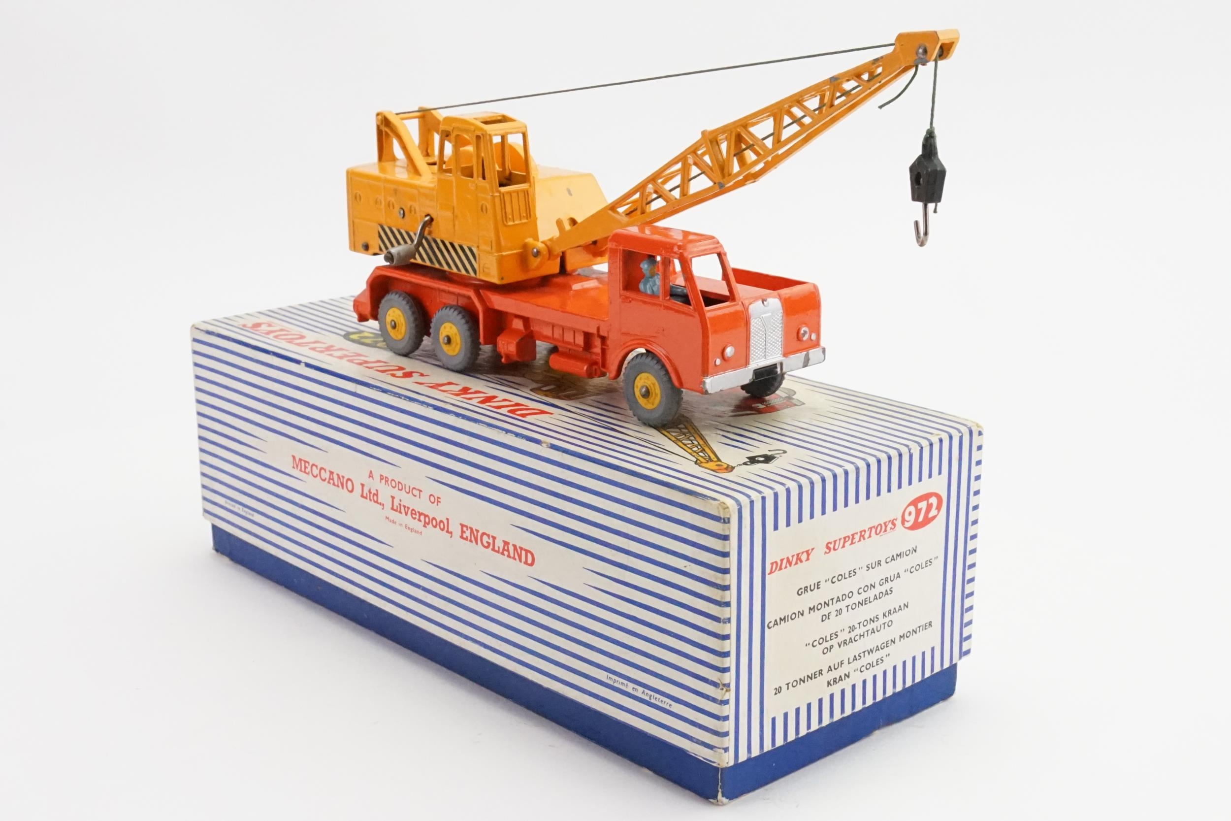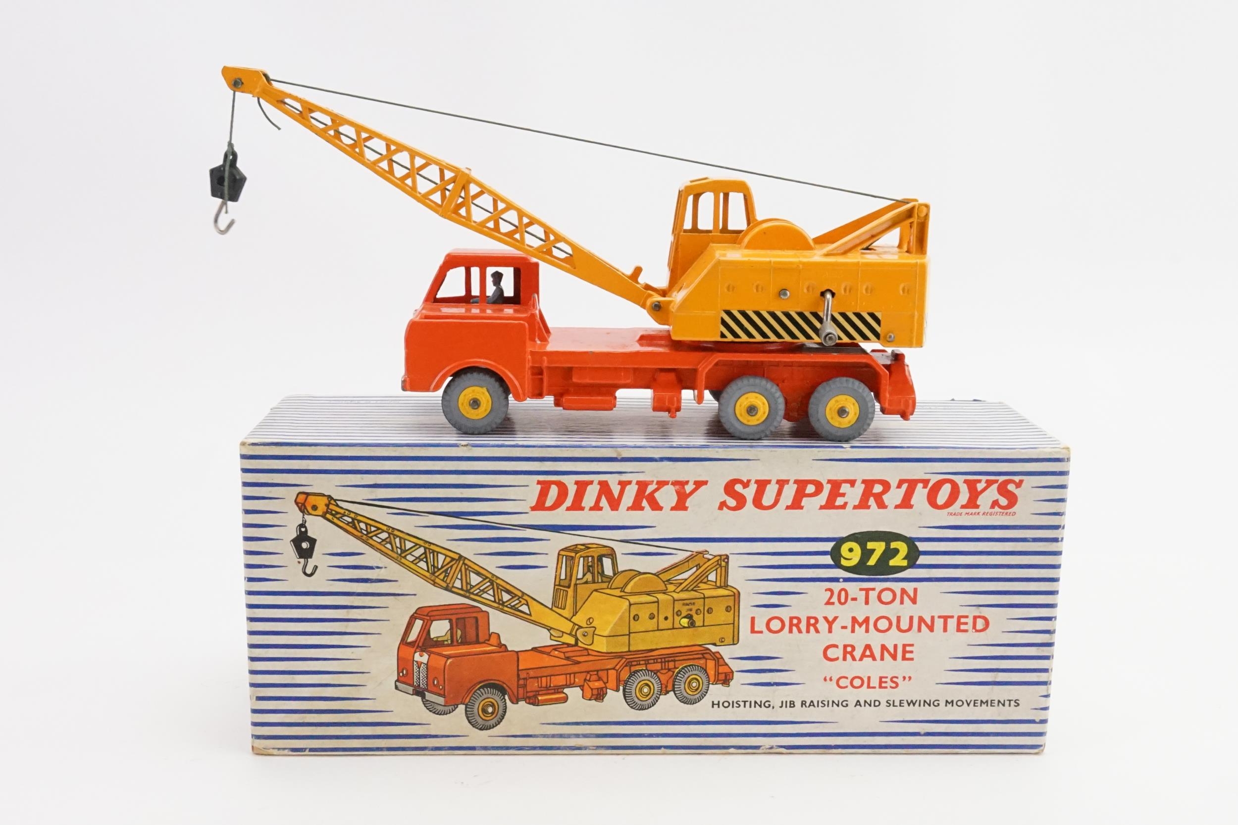 A Dinky No: 972 "20-Ton Lorry Mounted Coles Crane" finished in Orange & Yellow with Rare Yellow PLASTIC HUBS & Grey Tyres. The model is in Excellent Original Condition & comes in an Excellent Original Box apart from missing the inner packing.