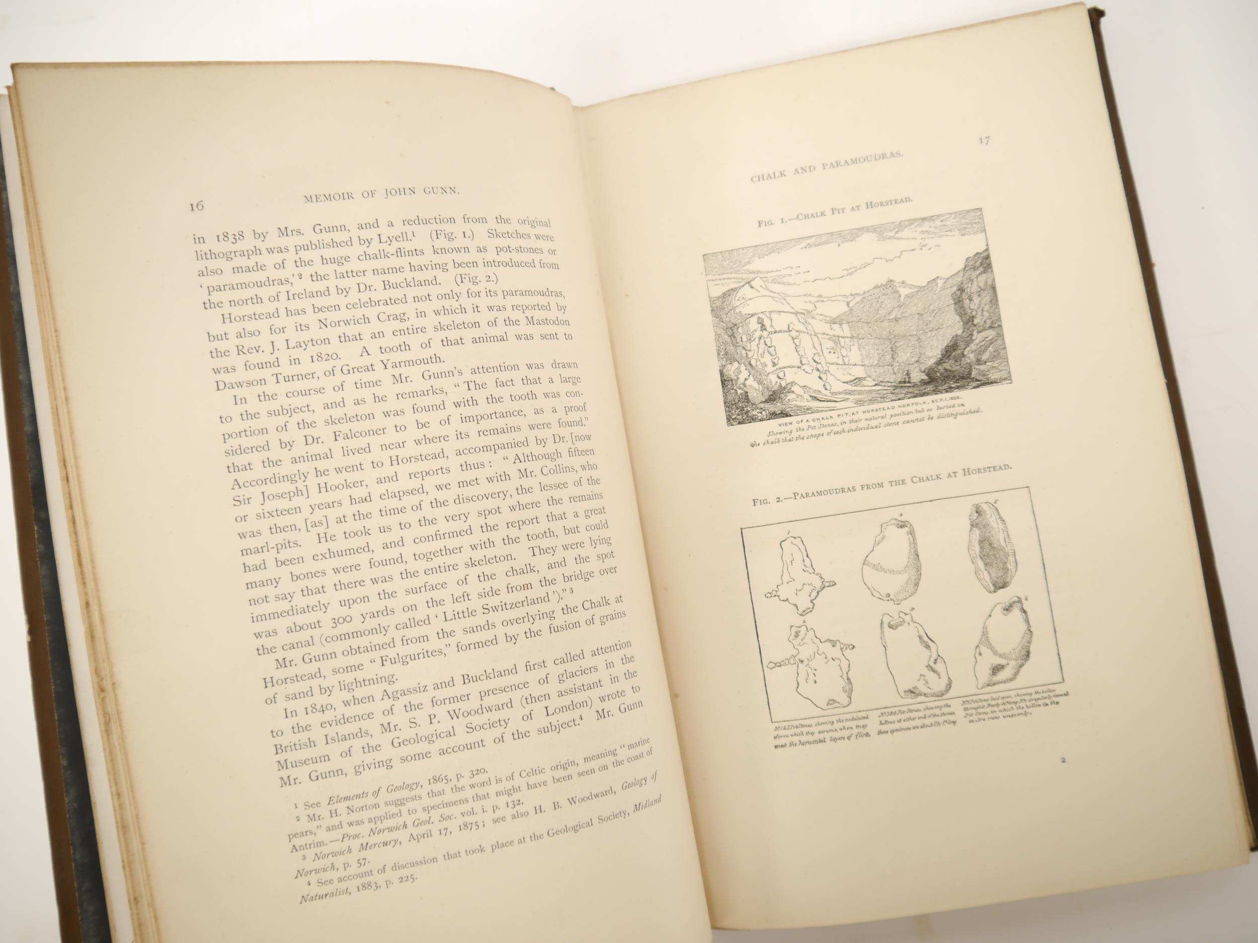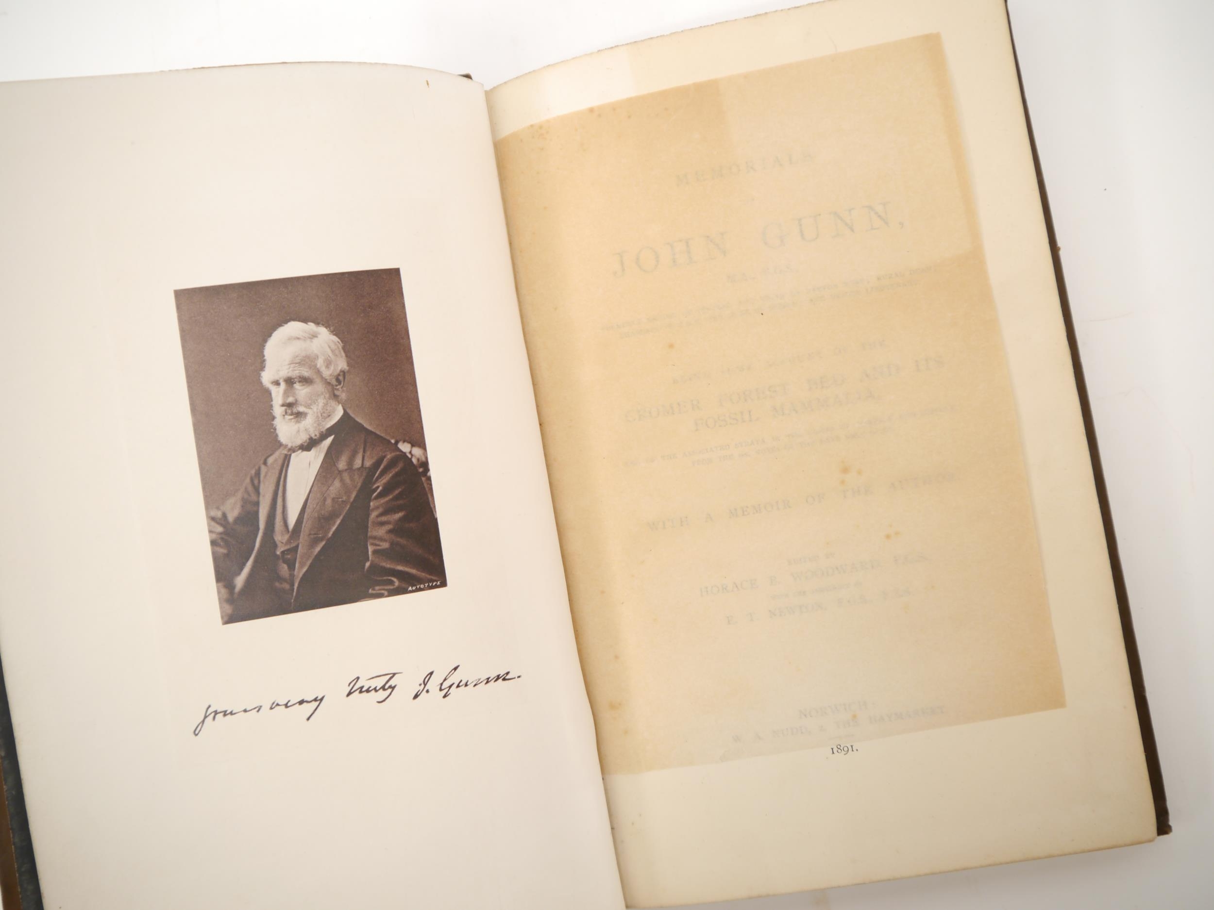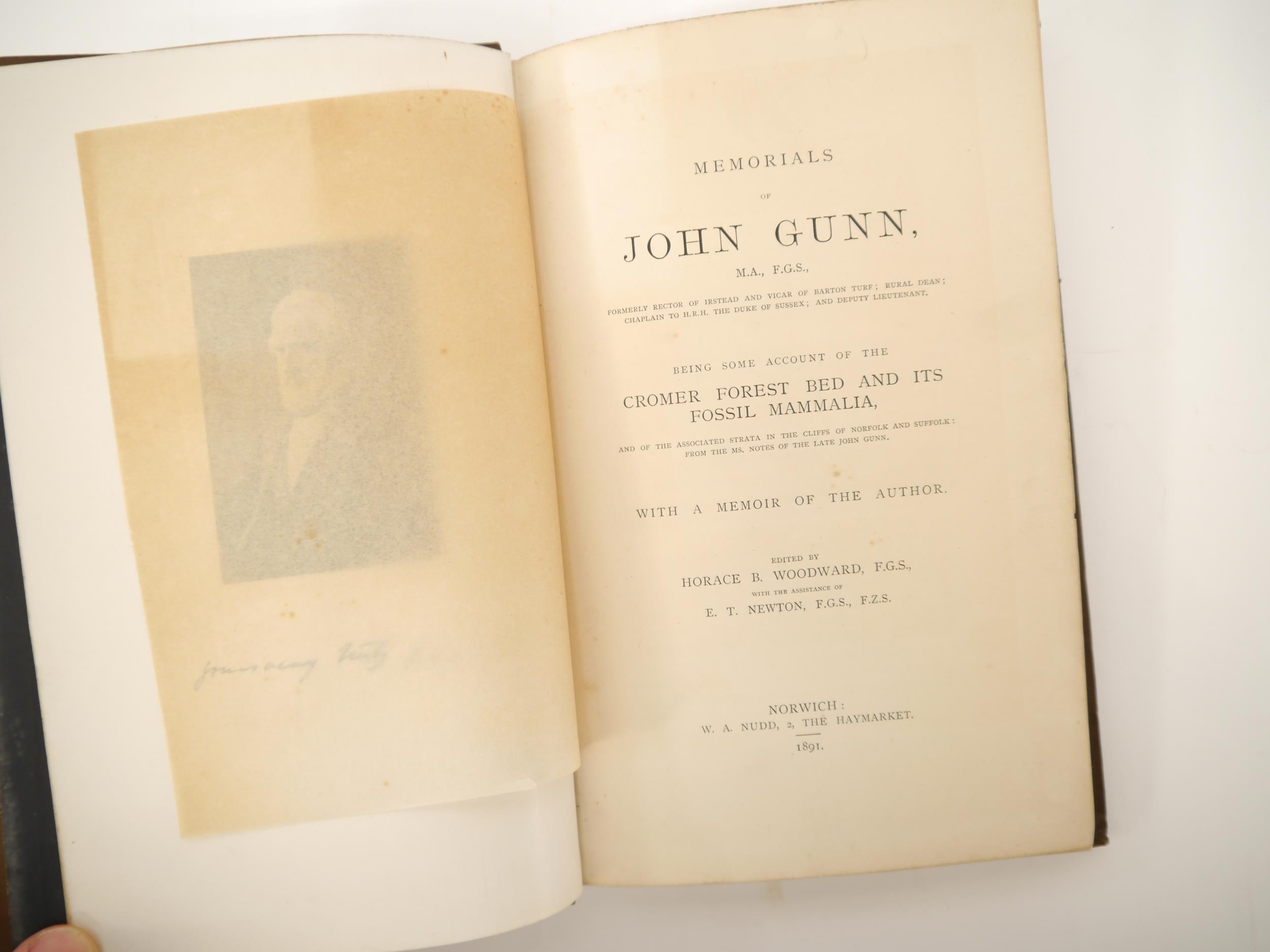 (Norfolk Geology), John Gunn: 'Memorials of John Gunn: being some account of the Cromer Forest Bed and its fossil mammalia, and of the associated strata in the cliffs of Norfolk and Suffolk: from the mss. of the late John Gunn. With a memoir of the author. Edited by Horace B. Woodward with the assistance of E.T. Newton', Norwich, W.A. Nudd, 1891, 1st edition, engraved portrait frontis + 12 b/w diagrams & illustrations + 7 engraved plates fossilized elephants and deer, vii,120pp, original cloth gilt. John Gunn (1801-1890), was a geologist and vicar of Barton Turf, Norfolk, and in 1830 married Harriet Turner, daughter of the Norfolk antiquary Dawson Turner. This scarce work summarises his palaeontological and geological discoveries in North Norfolk between 1840 and 1887, in an area latterly dubbed Norfolk's "Deep History Coast"