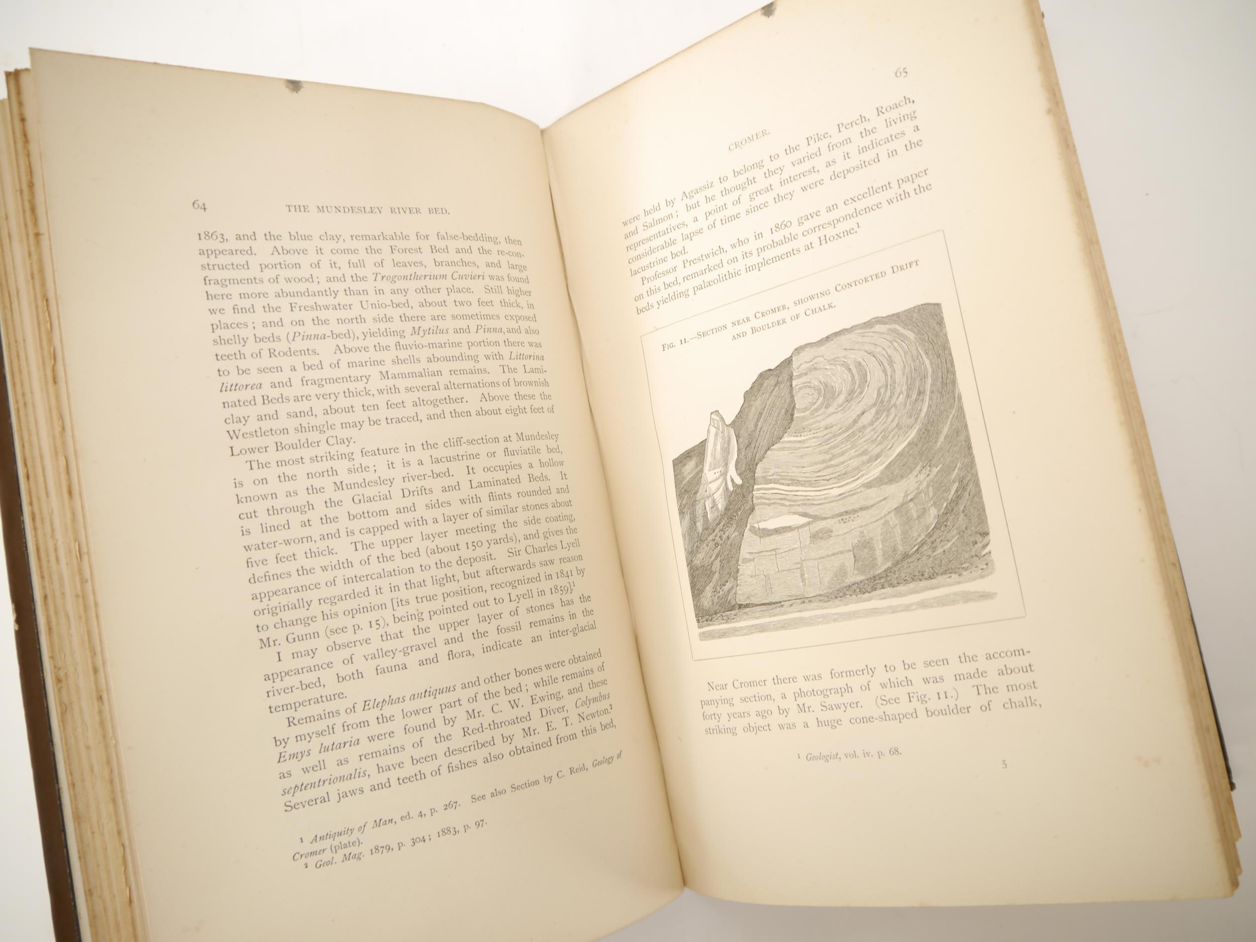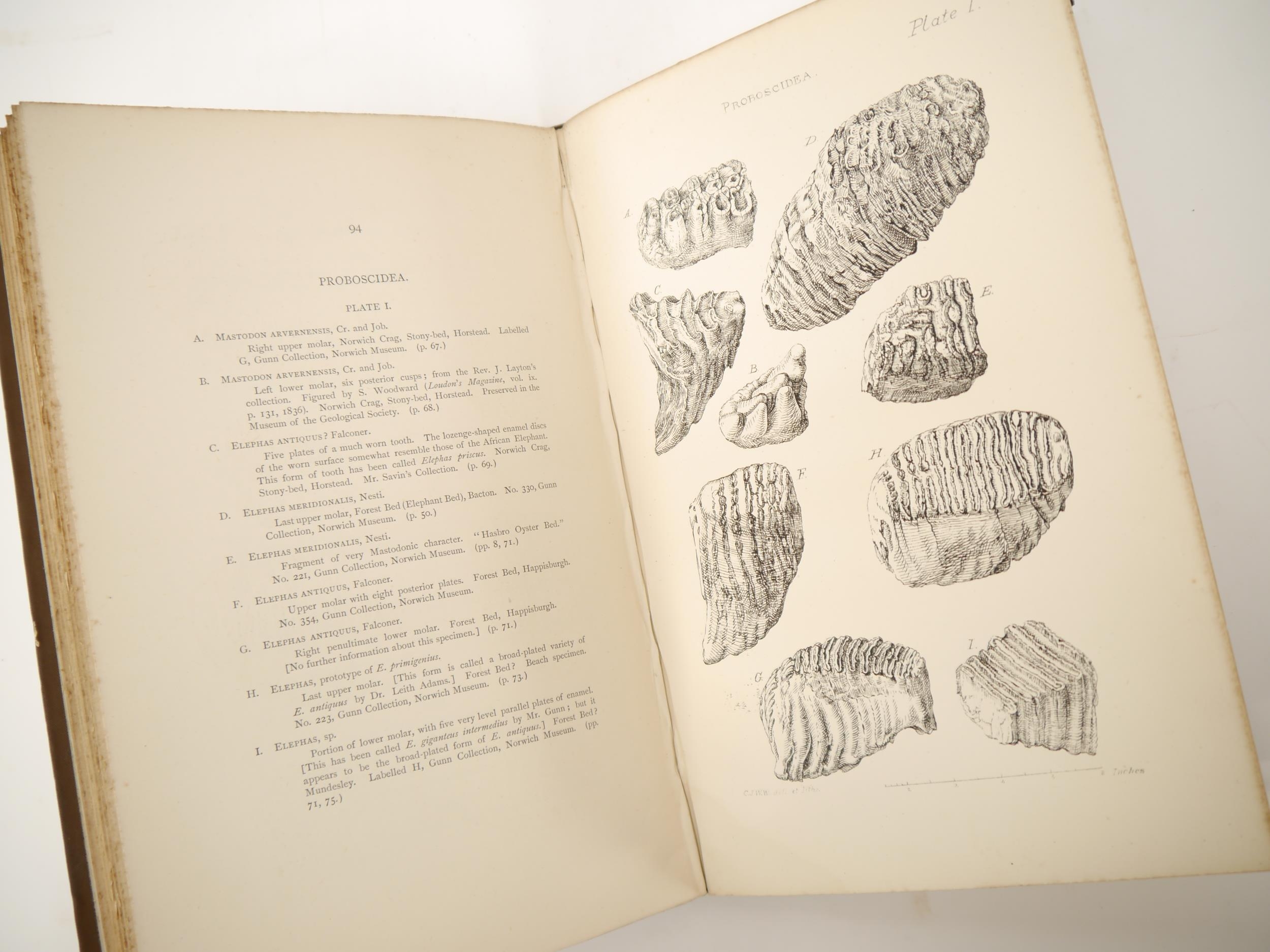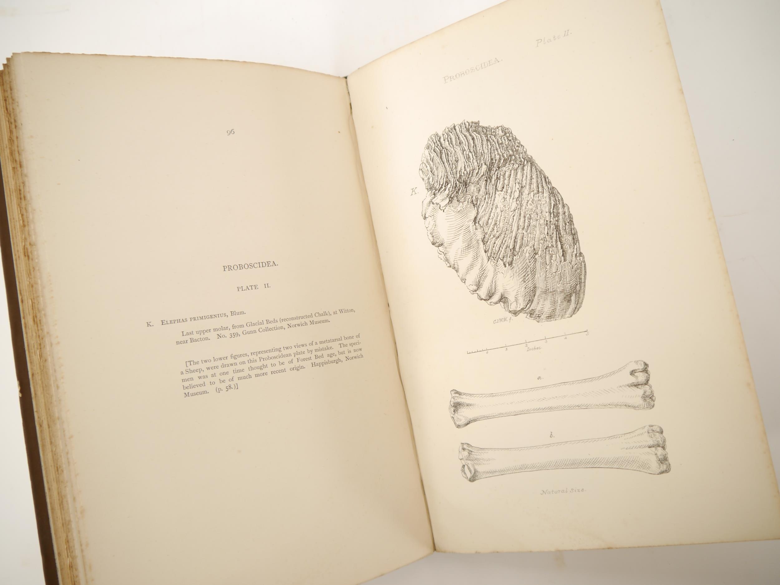 (Norfolk Geology), John Gunn: 'Memorials of John Gunn: being some account of the Cromer Forest Bed and its fossil mammalia, and of the associated strata in the cliffs of Norfolk and Suffolk: from the mss. of the late John Gunn. With a memoir of the author. Edited by Horace B. Woodward with the assistance of E.T. Newton', Norwich, W.A. Nudd, 1891, 1st edition, engraved portrait frontis + 12 b/w diagrams & illustrations + 7 engraved plates fossilized elephants and deer, vii,120pp, original cloth gilt. John Gunn (1801-1890), was a geologist and vicar of Barton Turf, Norfolk, and in 1830 married Harriet Turner, daughter of the Norfolk antiquary Dawson Turner. This scarce work summarises his palaeontological and geological discoveries in North Norfolk between 1840 and 1887, in an area latterly dubbed Norfolk's "Deep History Coast"