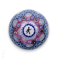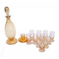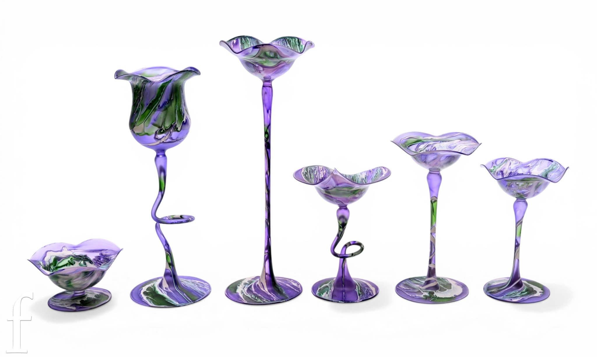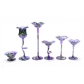 A quantity of Peter John coloured glassware, the slender stemmed wares decorated in a palette of mottled purple, green and white, comprising pedestal cup and shallow pedestal bowls with everted pinched rims, original labels, tallest 30cm. (6)