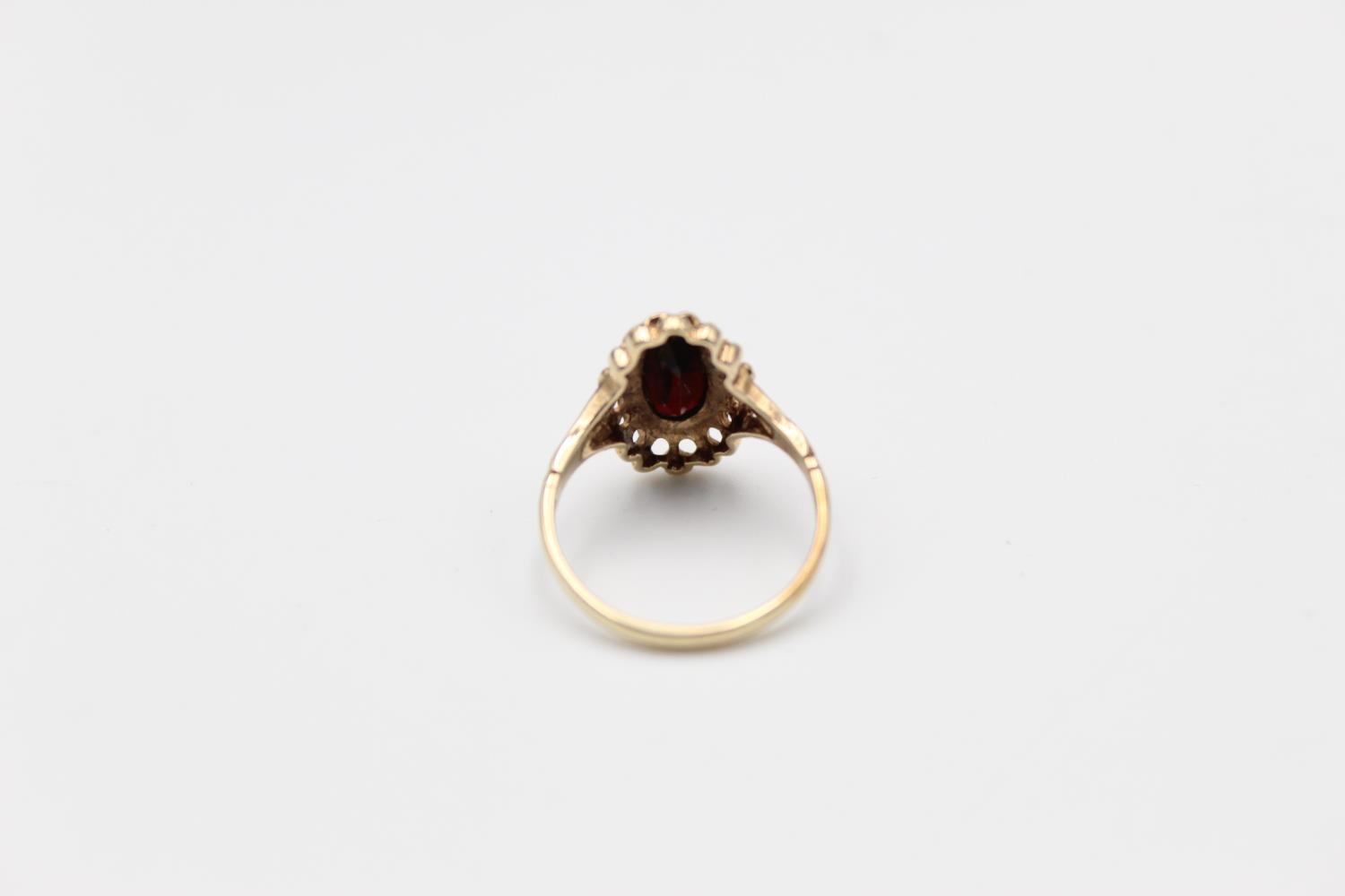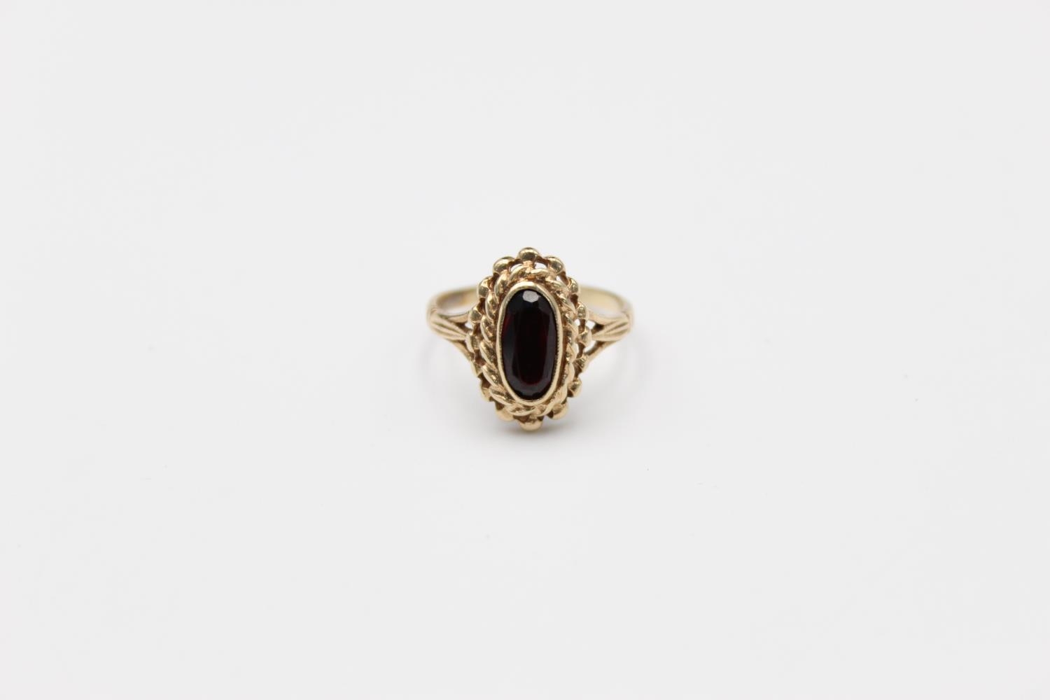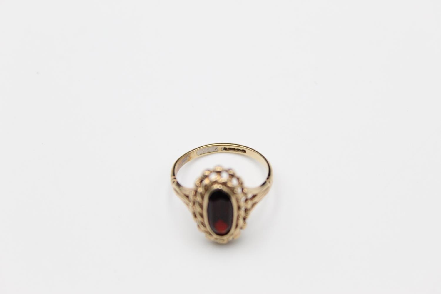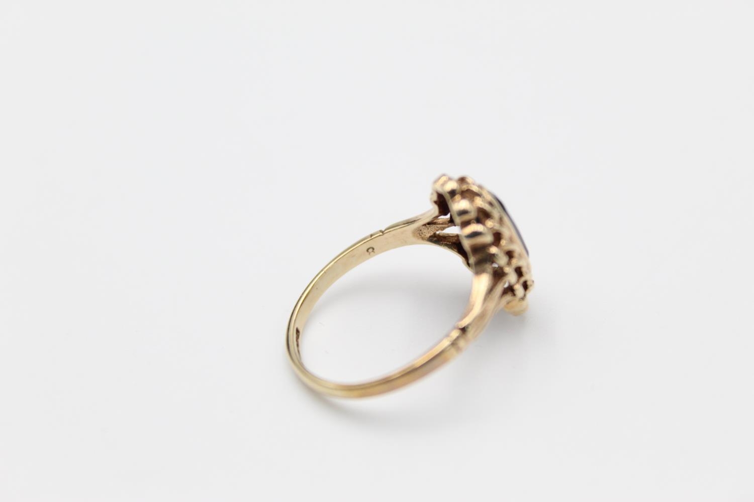 A 9ct gold ornate garnet set ring, size O - approx. gross weight 2.6 grams