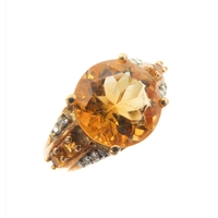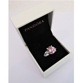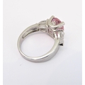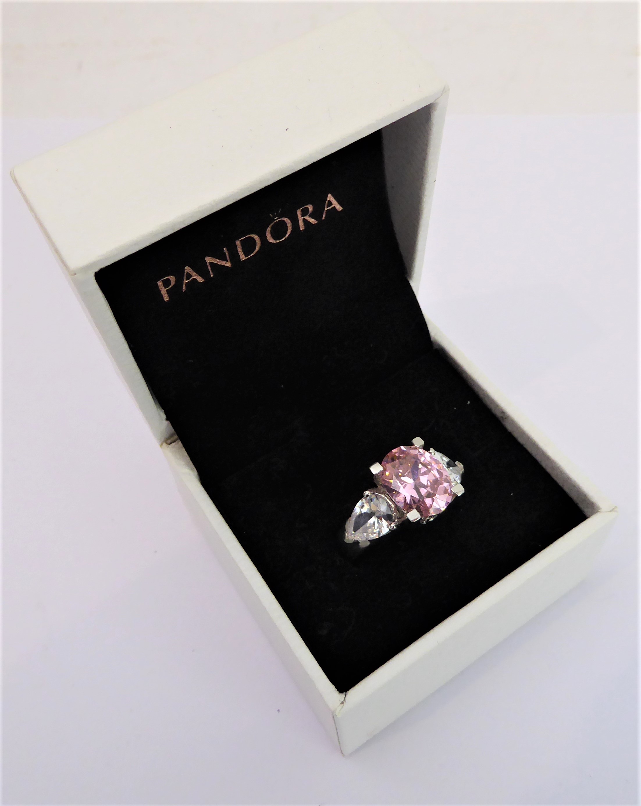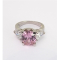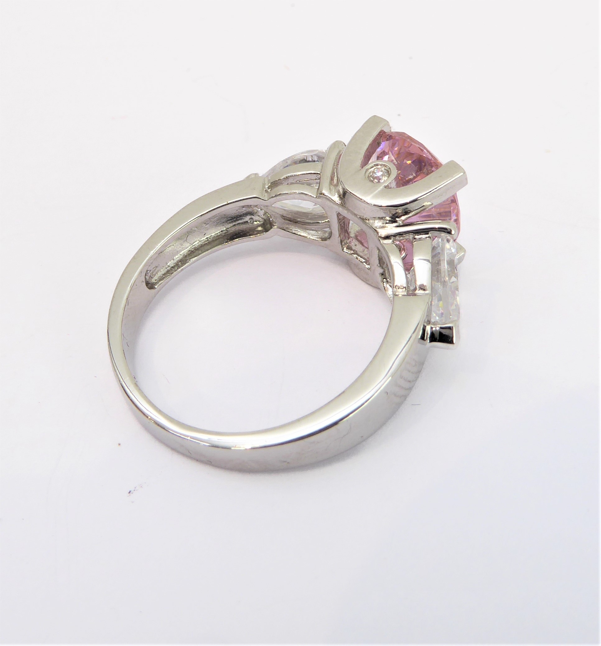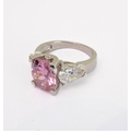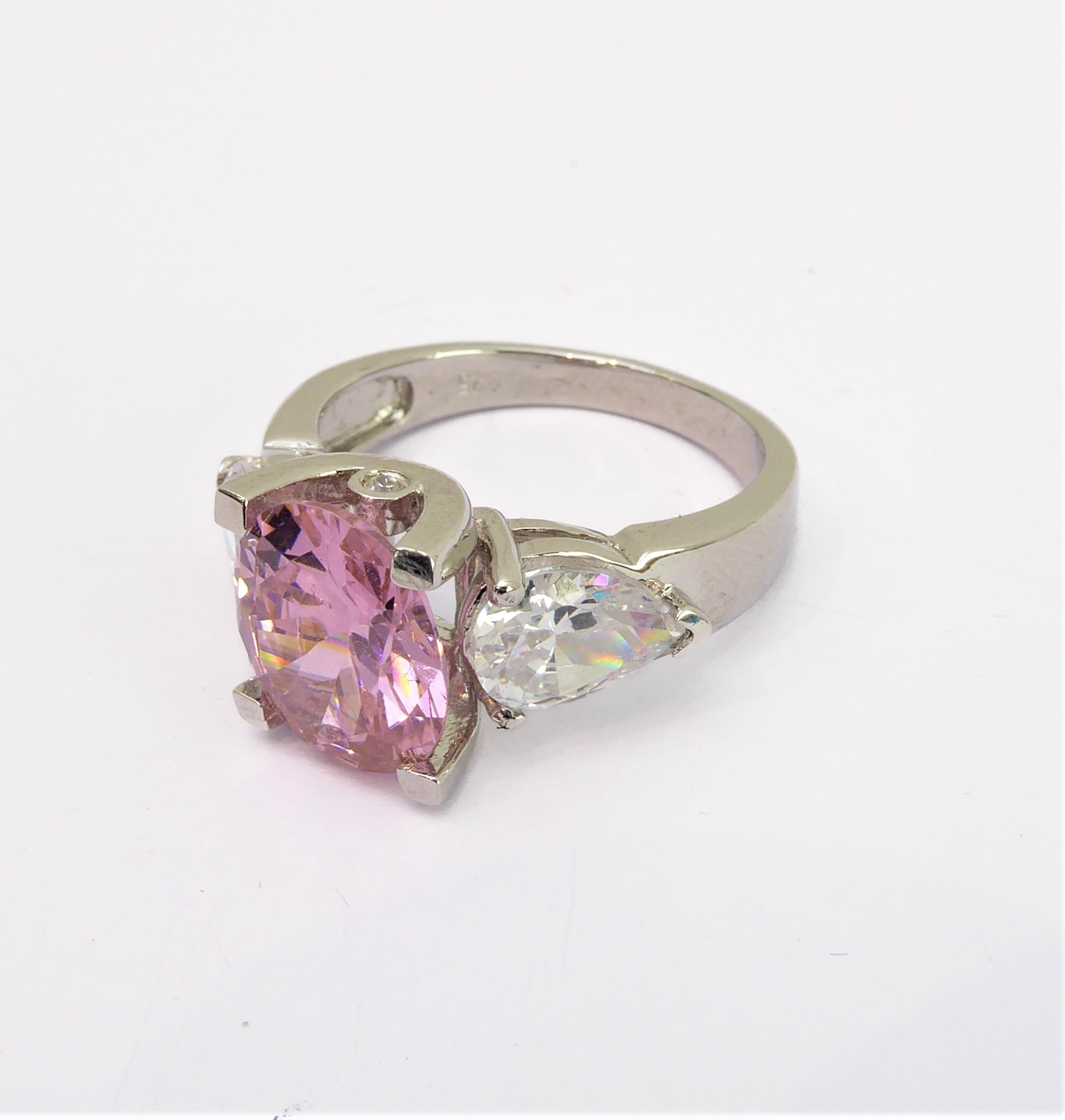 A lady's hallmarked silver ring centrally set with a large hand-cut oval pink stone of good colour, flanked by white hand-cut pear-shaped stones to the shoulders, ring size Q (boxed)
