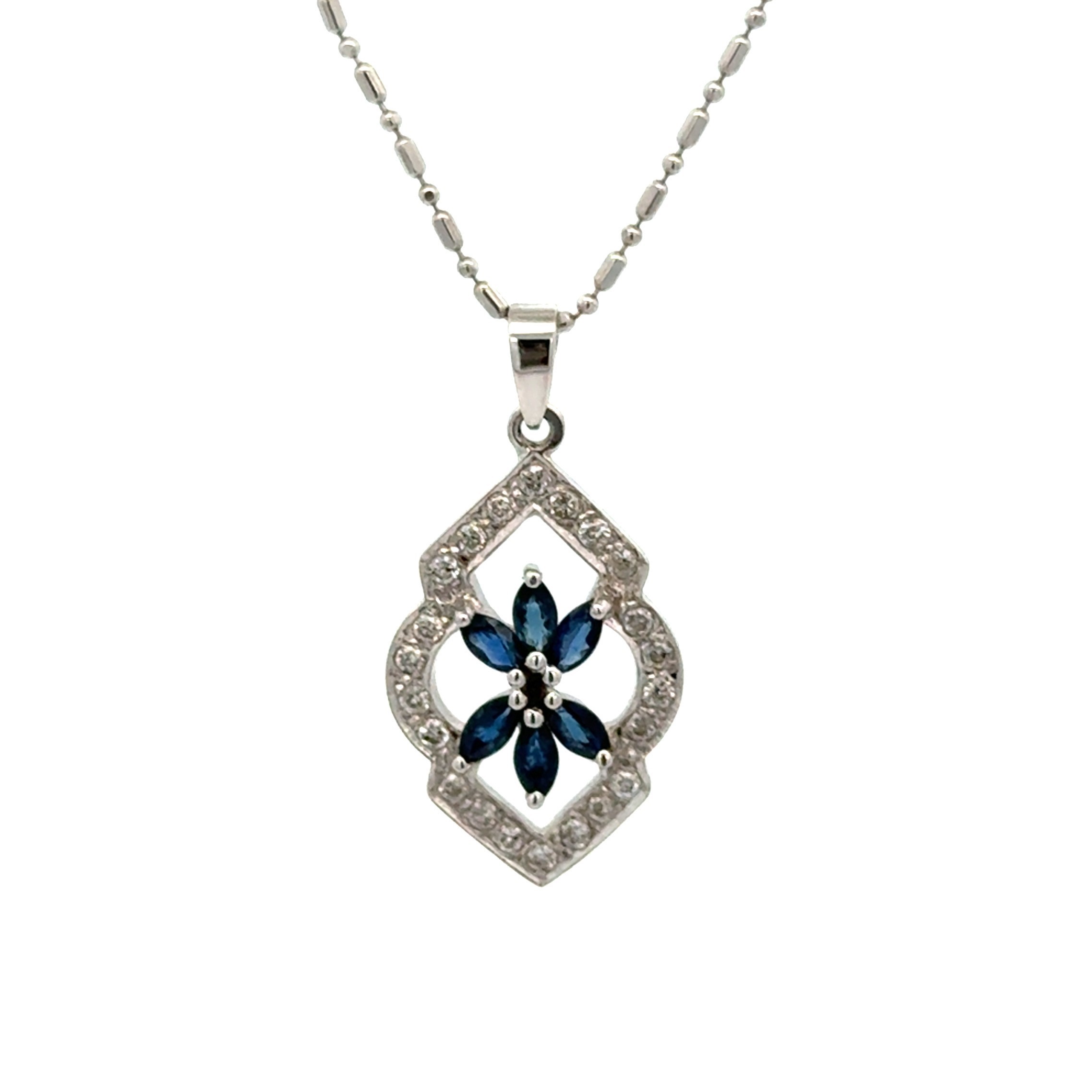 Sapphire & Diamond Pendant & Chain. 18ct white gold sapphire and diamond pendant and chain. Weighing 4.10g. Chain length 16".