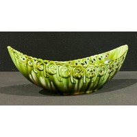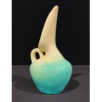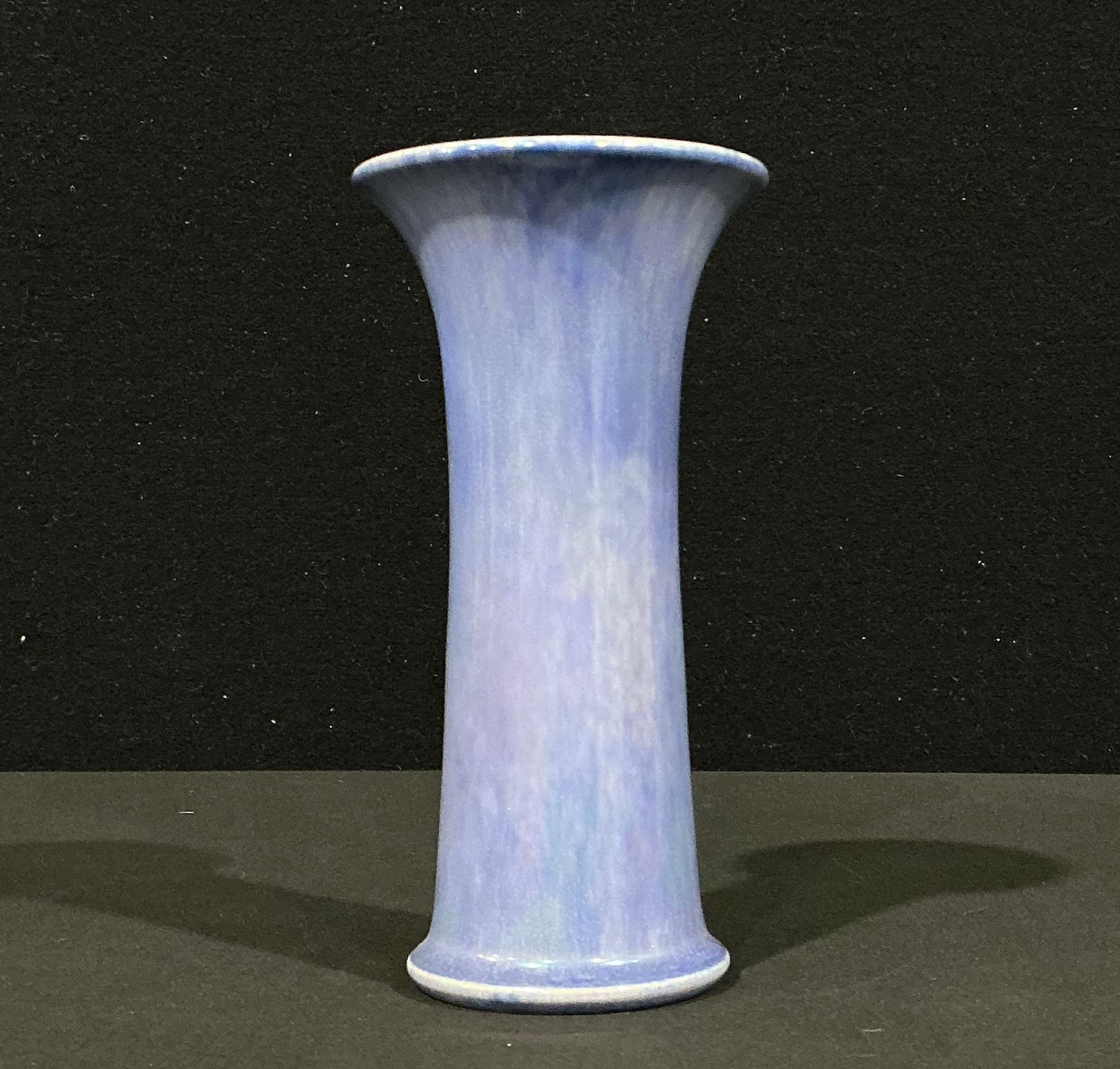 A Ruskin Pottery flared cylindrical vase, crystalline glazed in shades of pale mottled blue, 20cm, impressed mark, c.1910