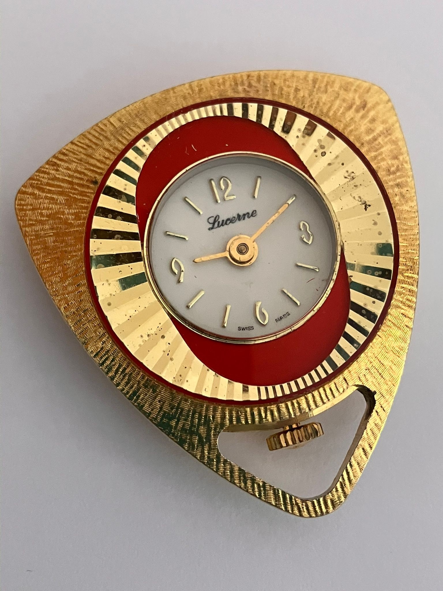 Ladies Vintage LUCERNE PENDANT WATCH. Finished in Frosted Gold Tone with Coral Enamel Detail. Manual winding in full working order. Swiss Made. Beautiful condition. Please see pictures.