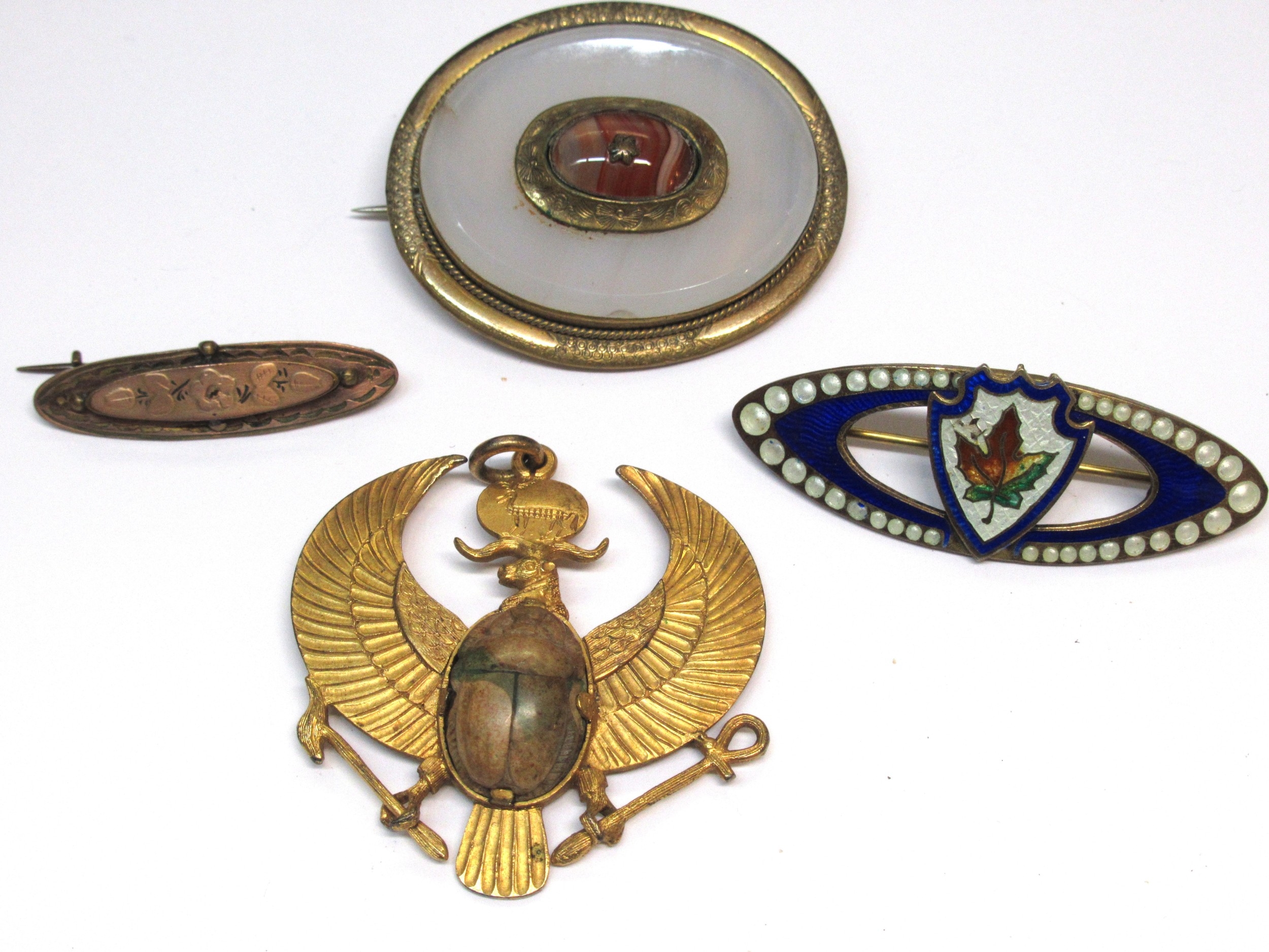 Oval chalcedony and agate brooch two other brooches and a pendant