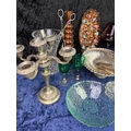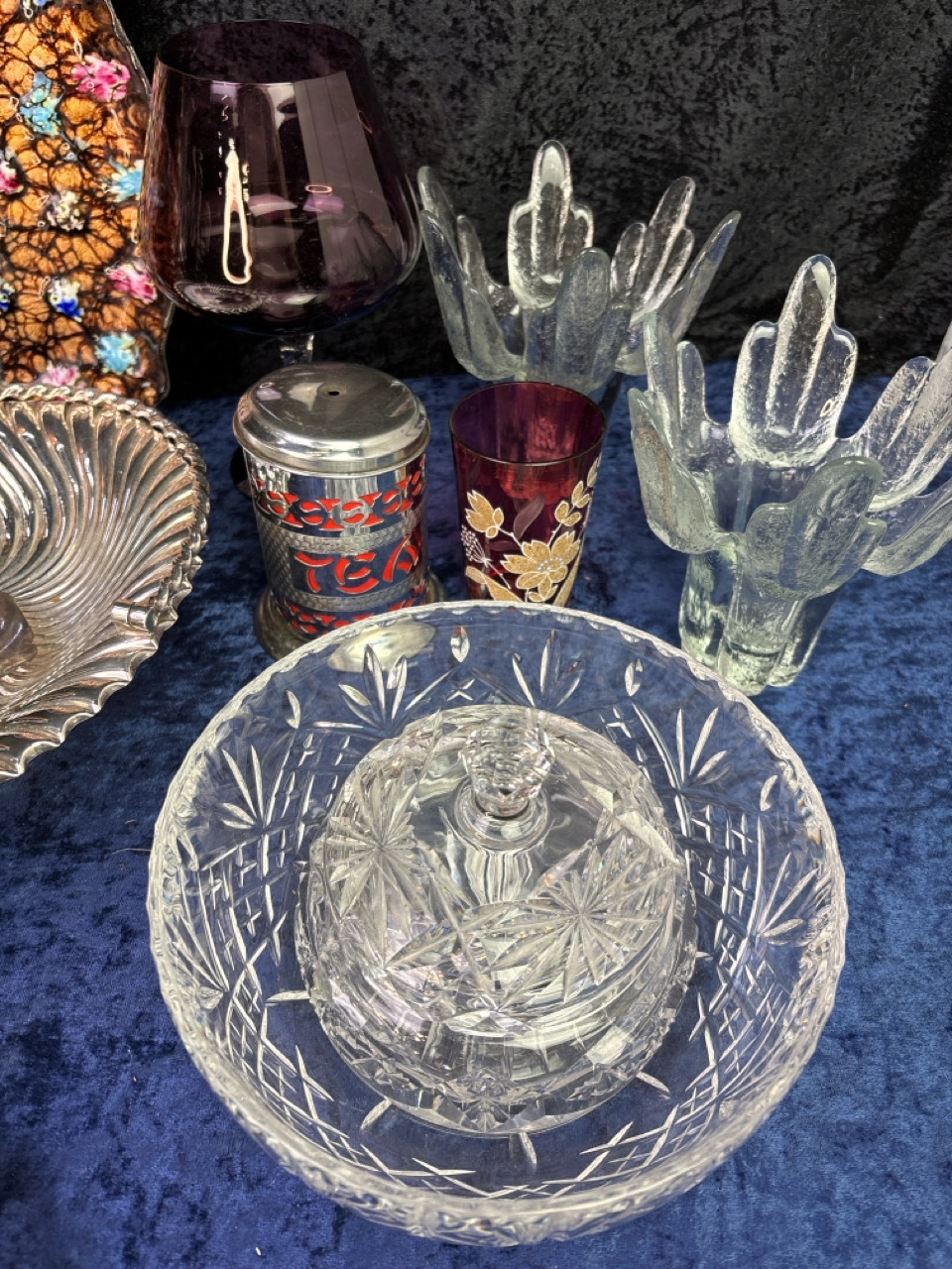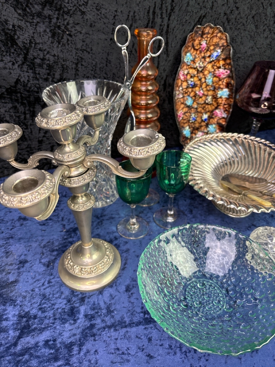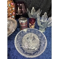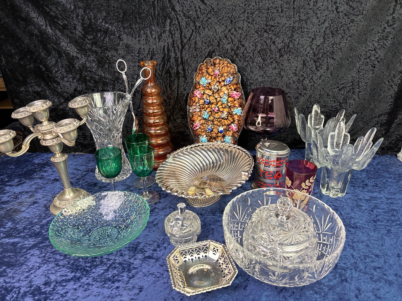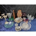 Collection of decorative glassware inc art vases, with plate candlestick and tableware