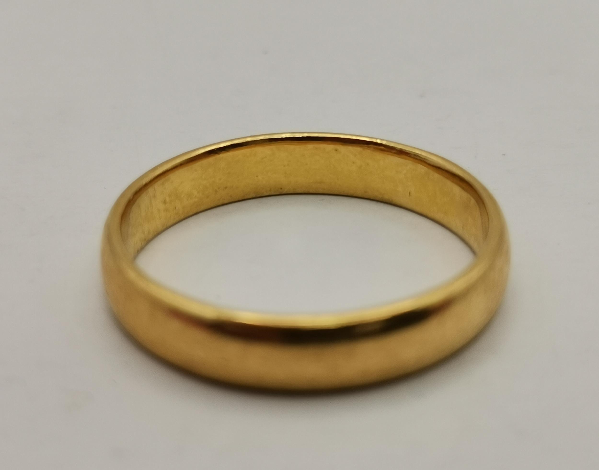 A 22 carat gold band ring, hallmarked 22. Ring size P, 4.5g