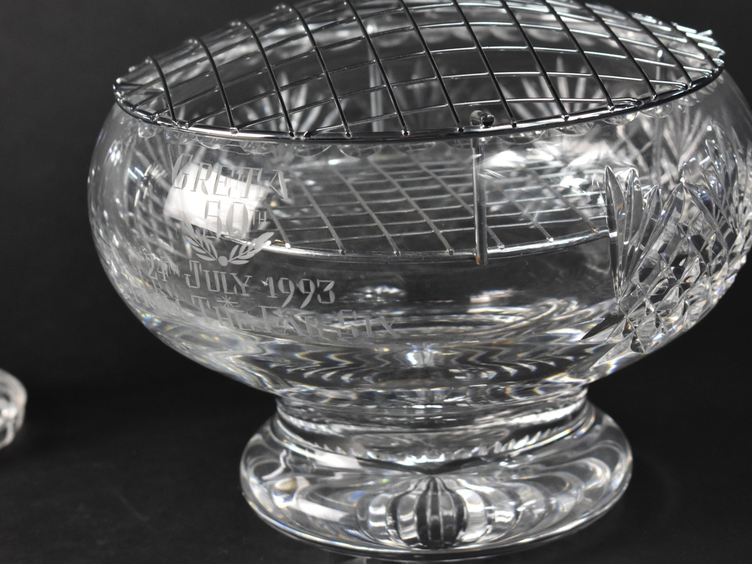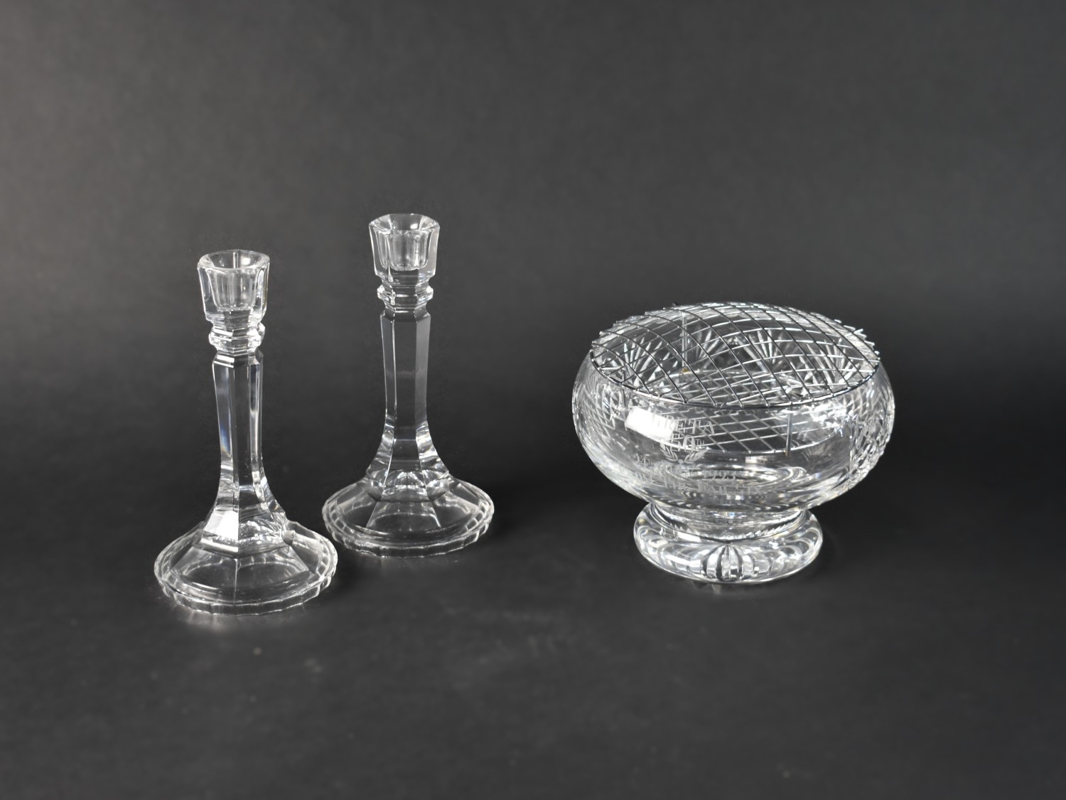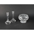 A Pair of Glass Candlesticks, 21cms High, together with an Engraved Rose Bowl with Commemorative Engraving