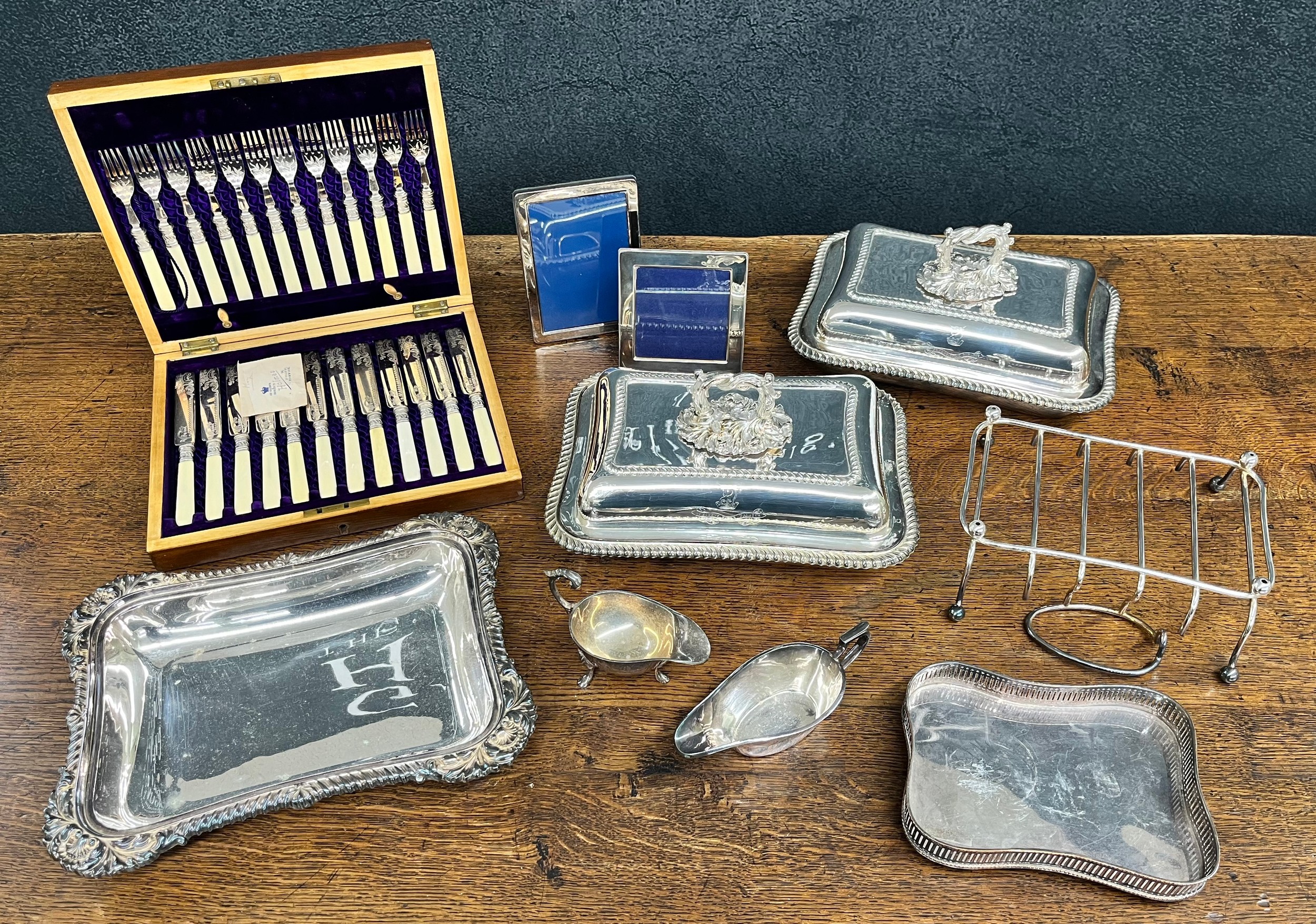 Mixed lot of electroplate, including entrée dishes and covers and photograph frames