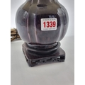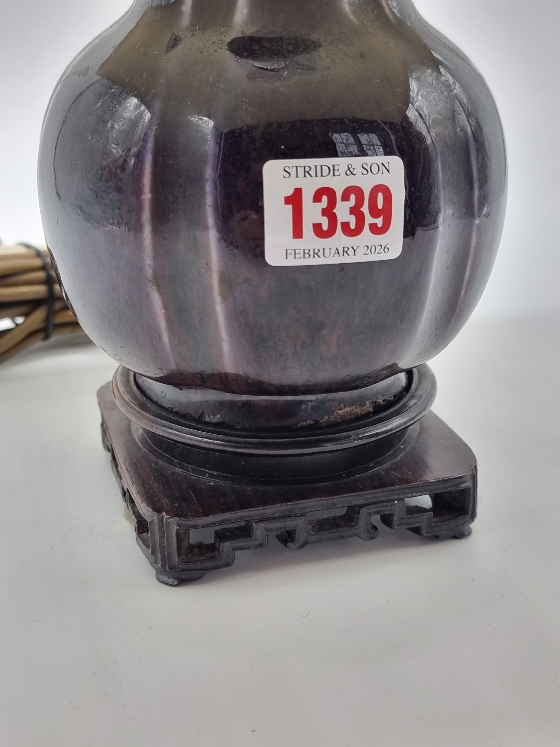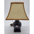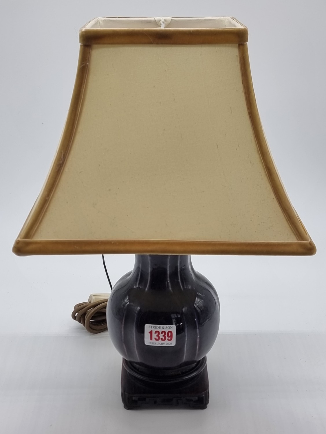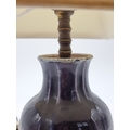 A Chinese aubergine glazed table lamp, on pierced hardwood stand, height including shade 39cm.