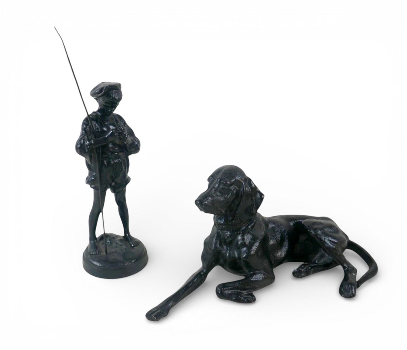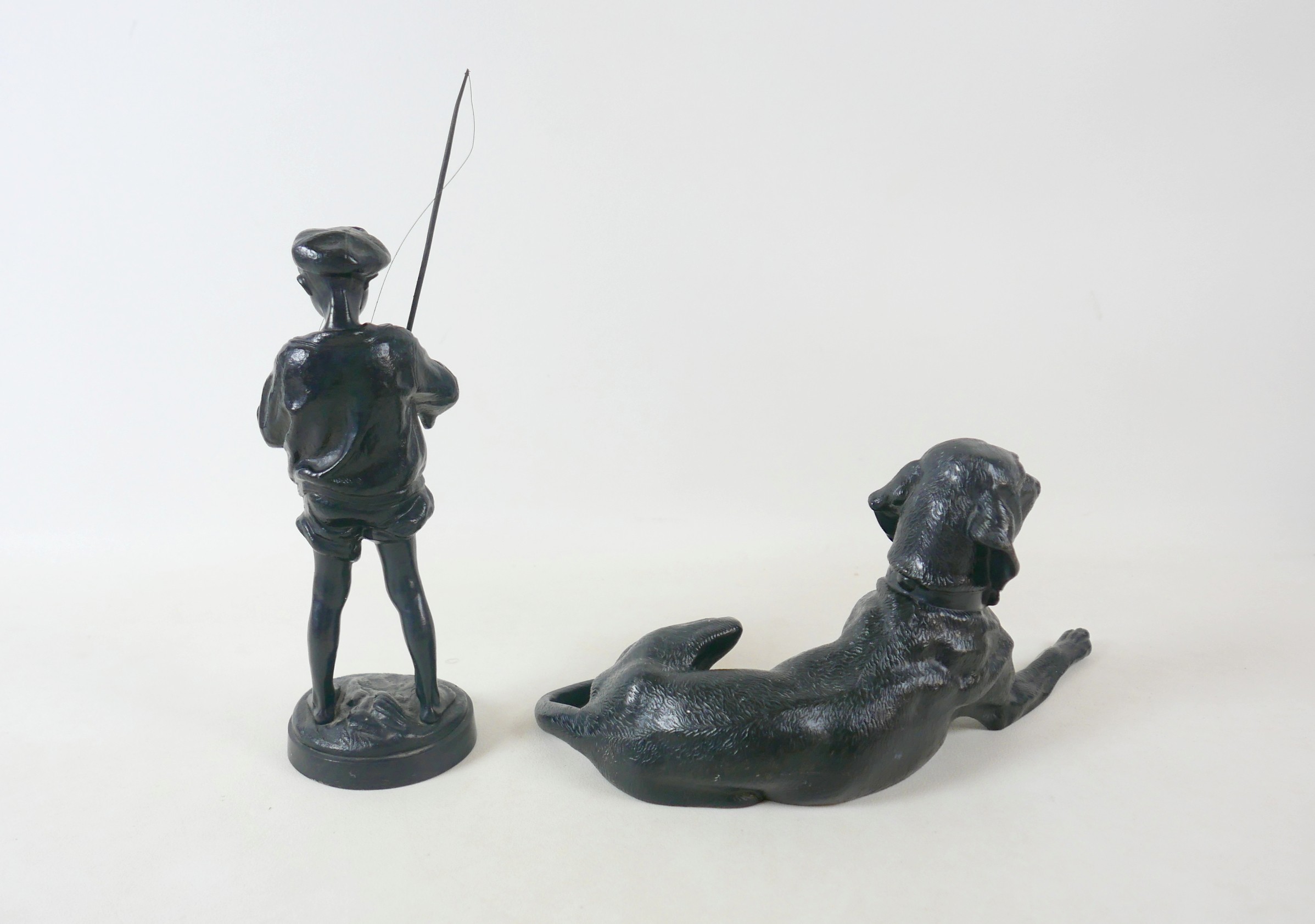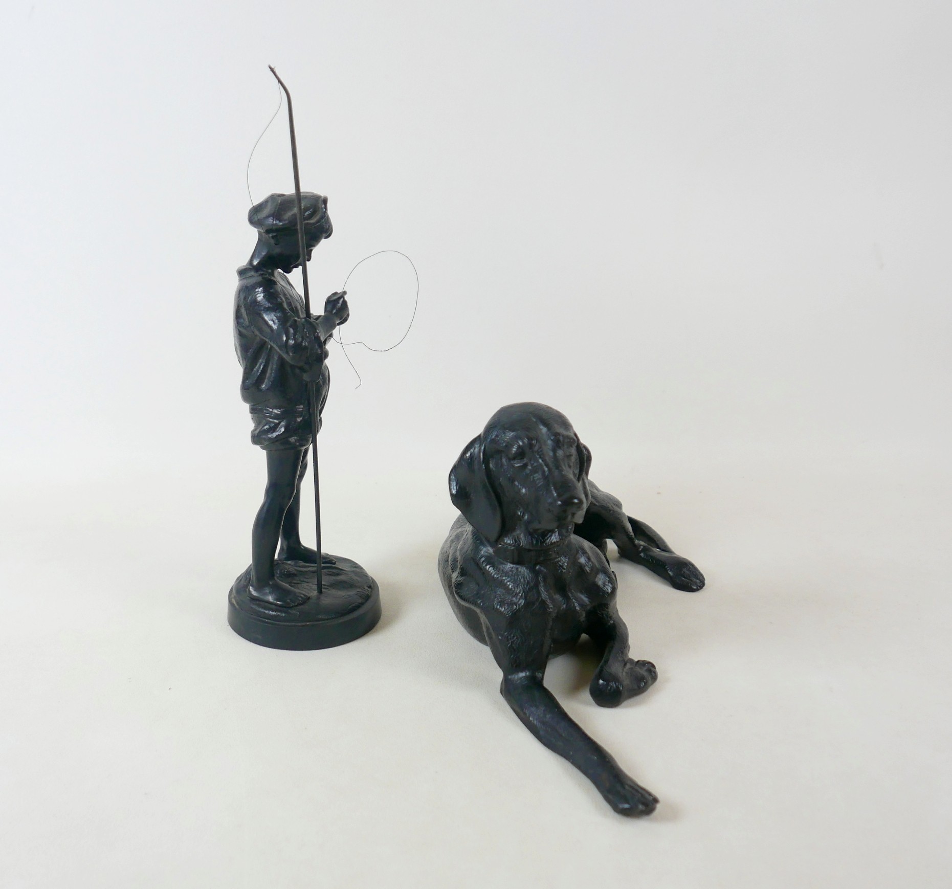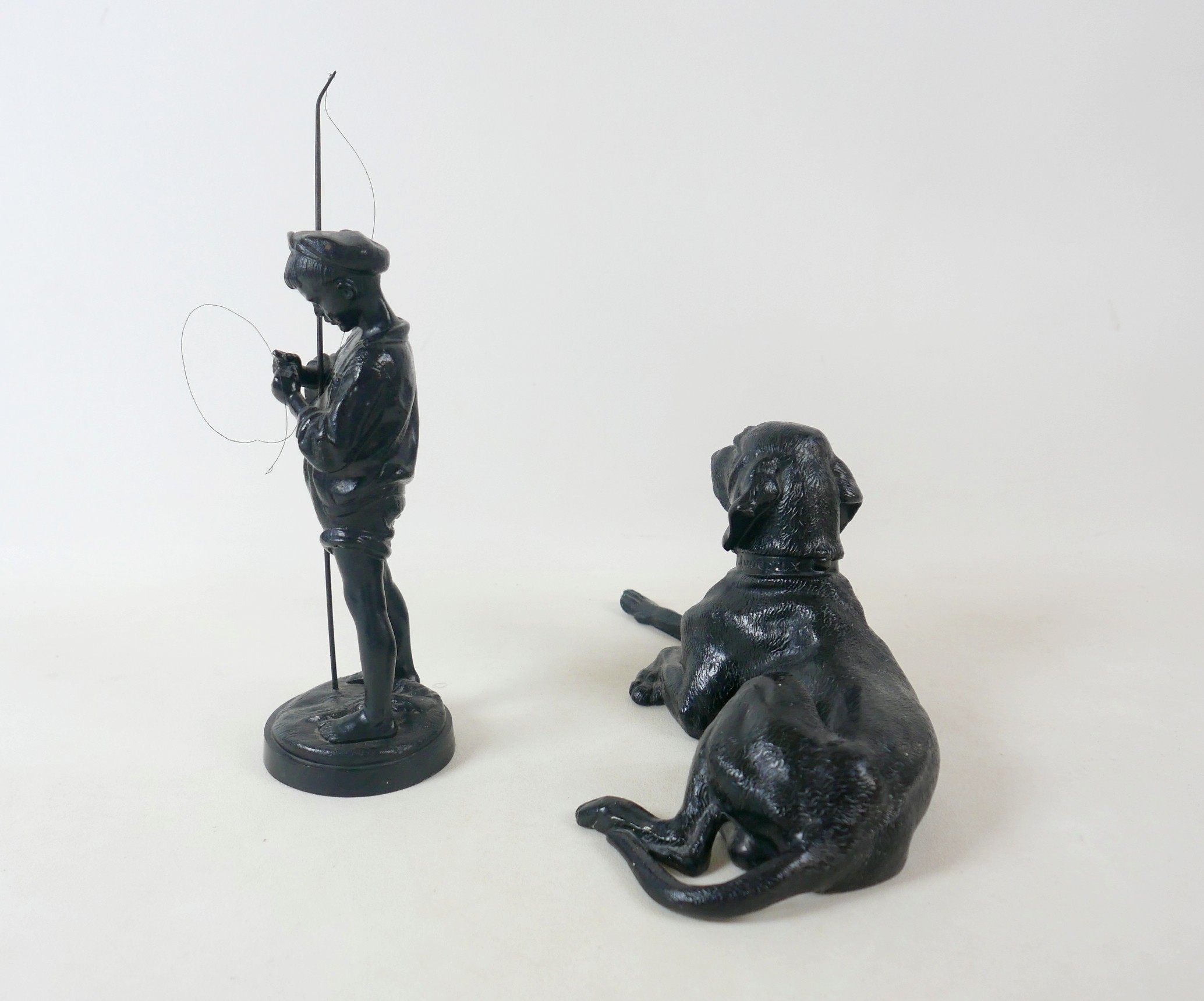 Two soviet cast iron figures of a boy fishing, the underside is embossed "Made in USSR, Kasli 1987", and a hollow cast iron dog, wearing a collar inscribed "bad Auderpux", bearing the painted mark of the soviet department of quality control (OTK). Figure of boy fishing is 34cm in height.(2)