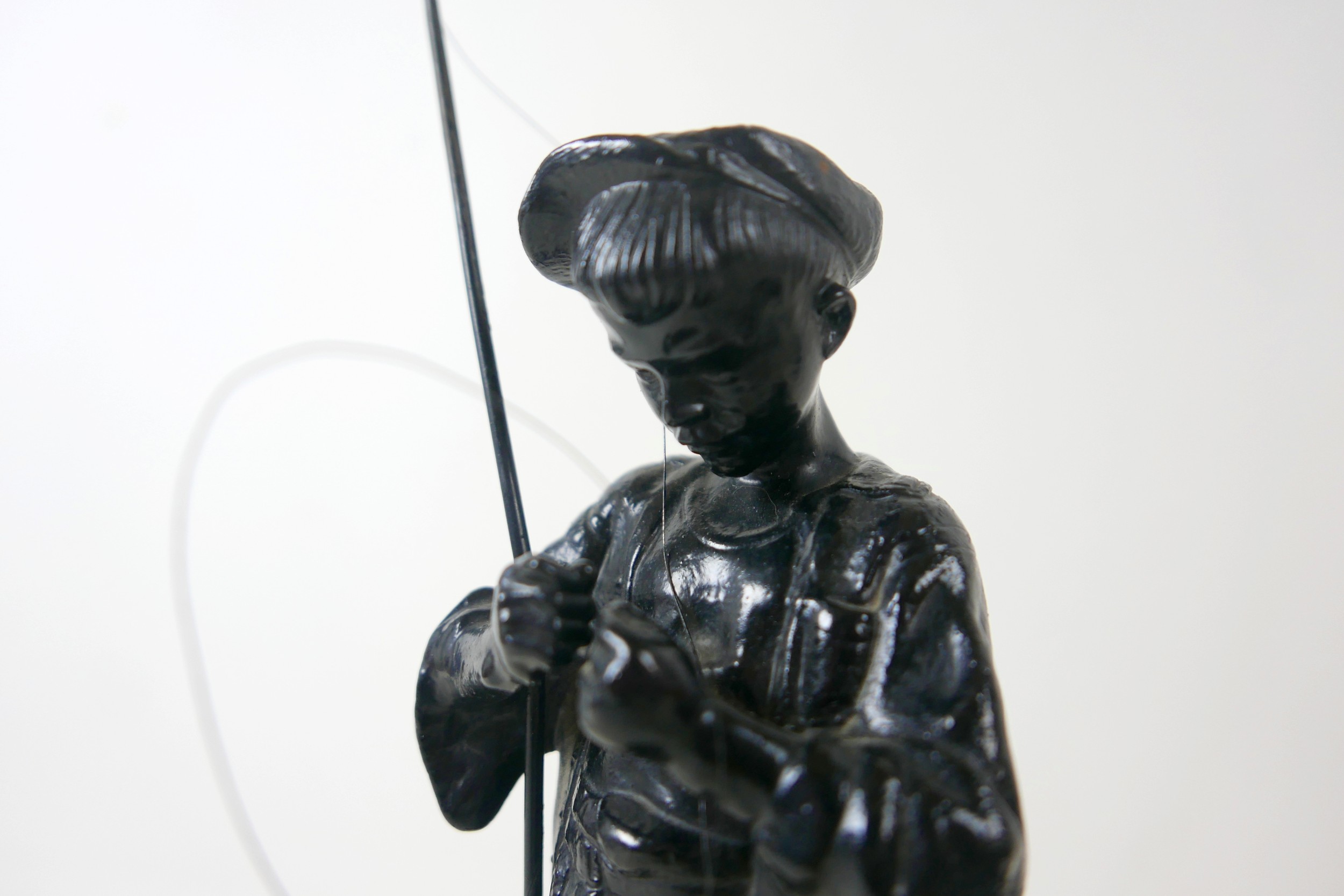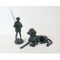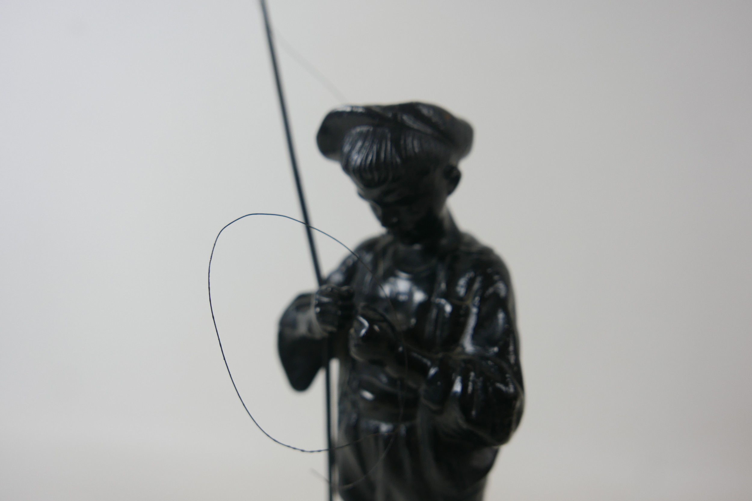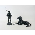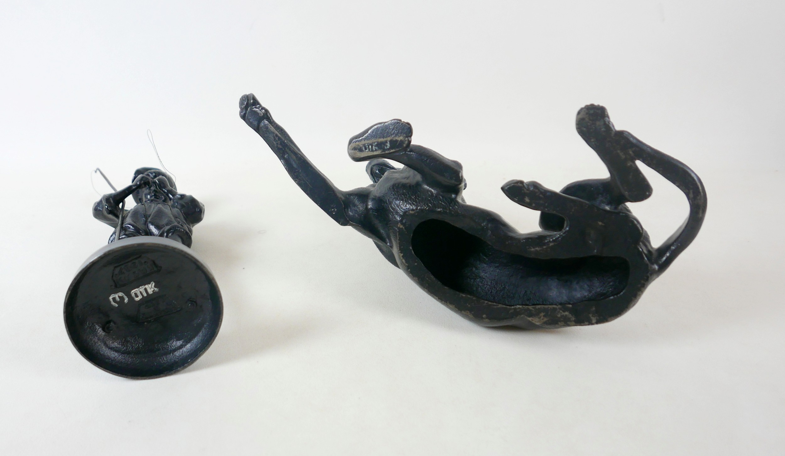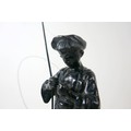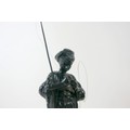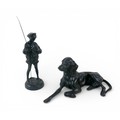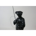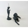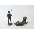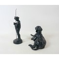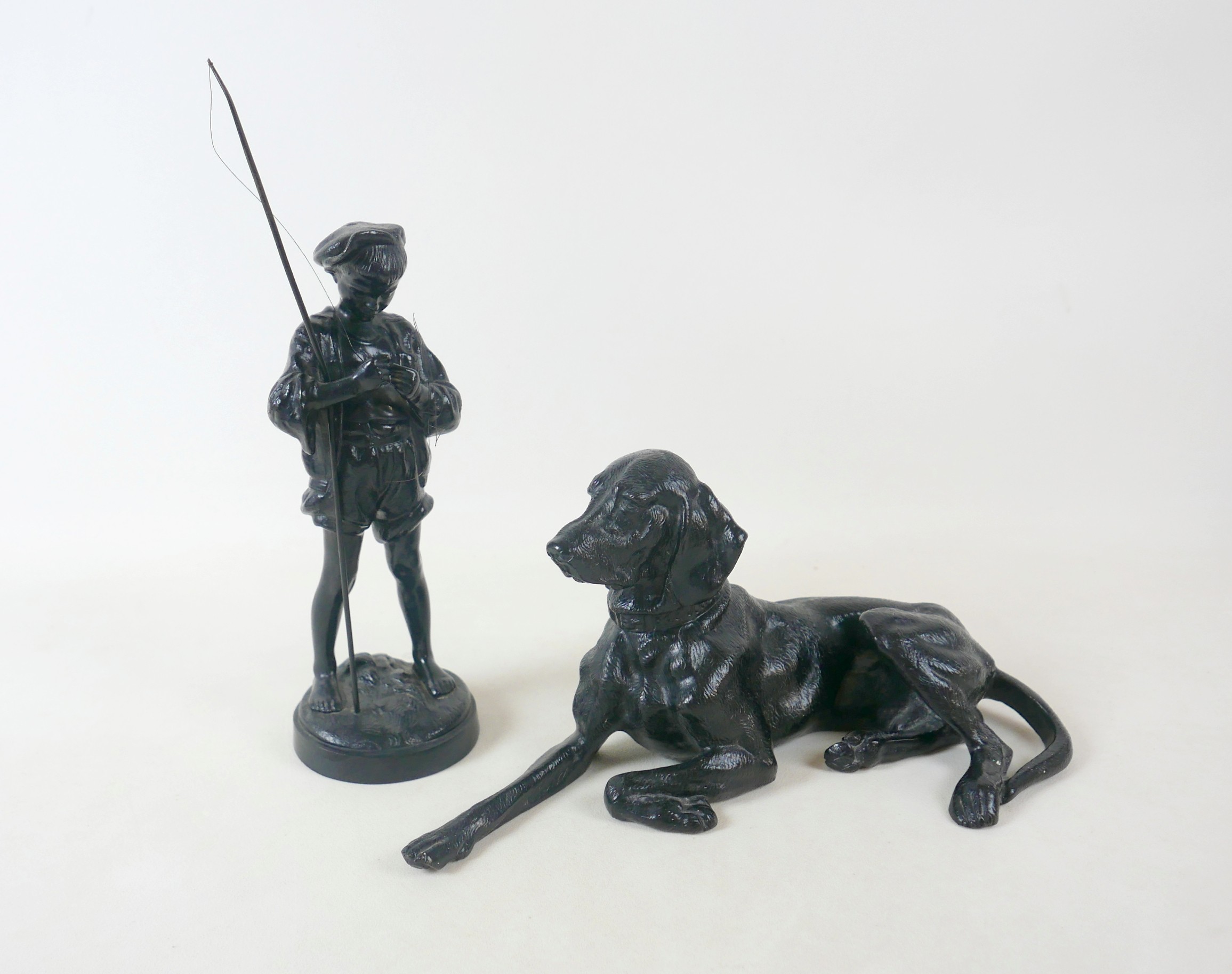Two soviet cast iron figures of a boy fishing, the underside is embossed "Made in USSR, Kasli 1987", and a hollow cast iron dog, wearing a collar inscribed "bad Auderpux", bearing the painted mark of the soviet department of quality control (OTK). Figure of boy fishing is 34cm in height.(2)