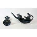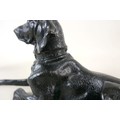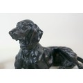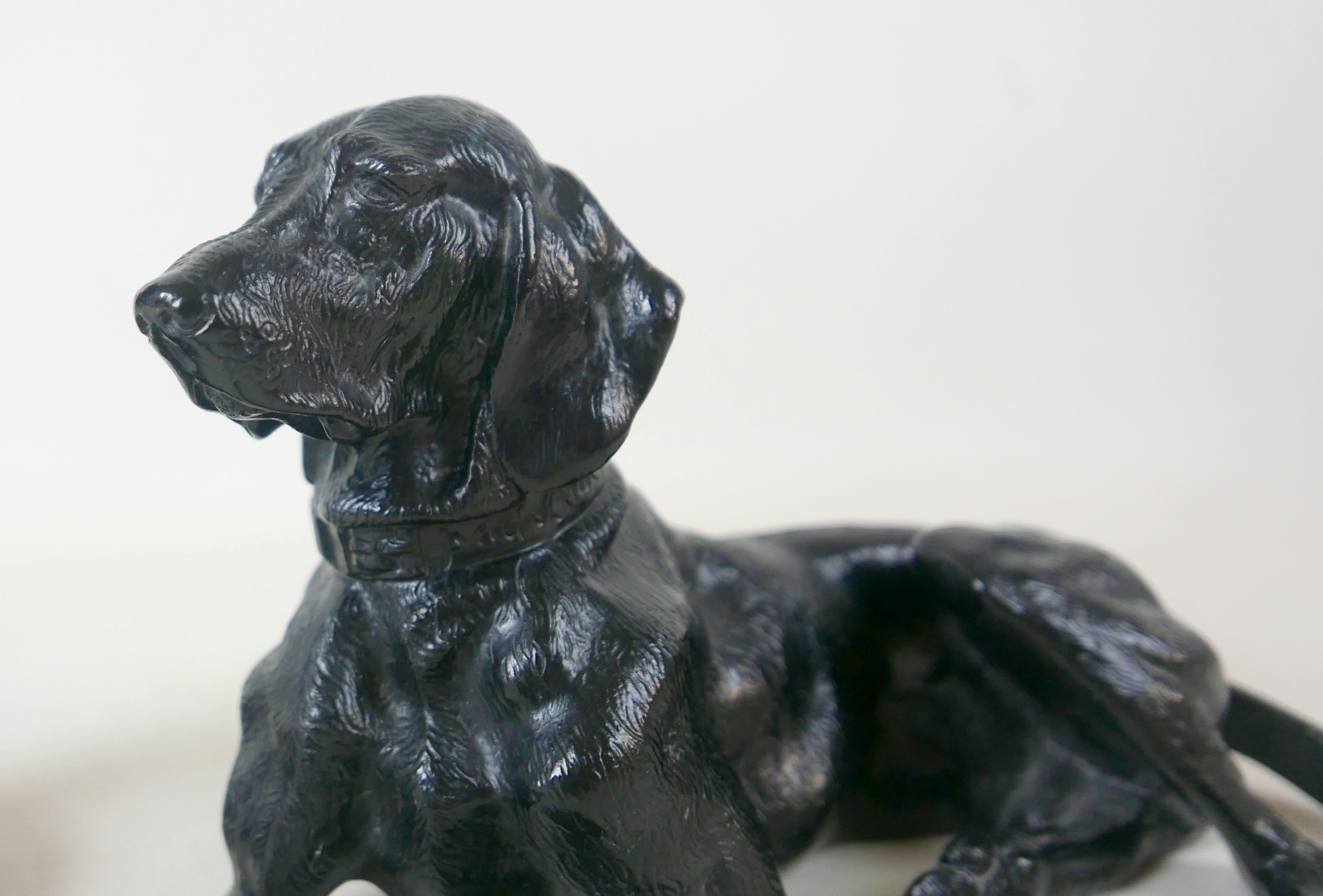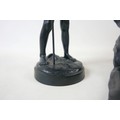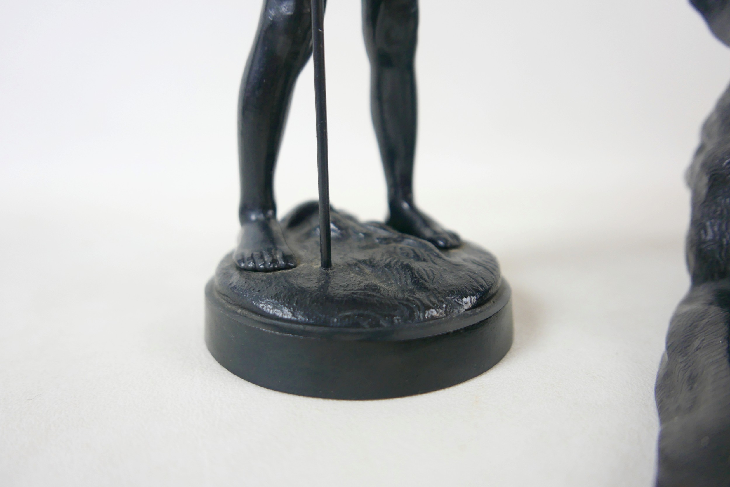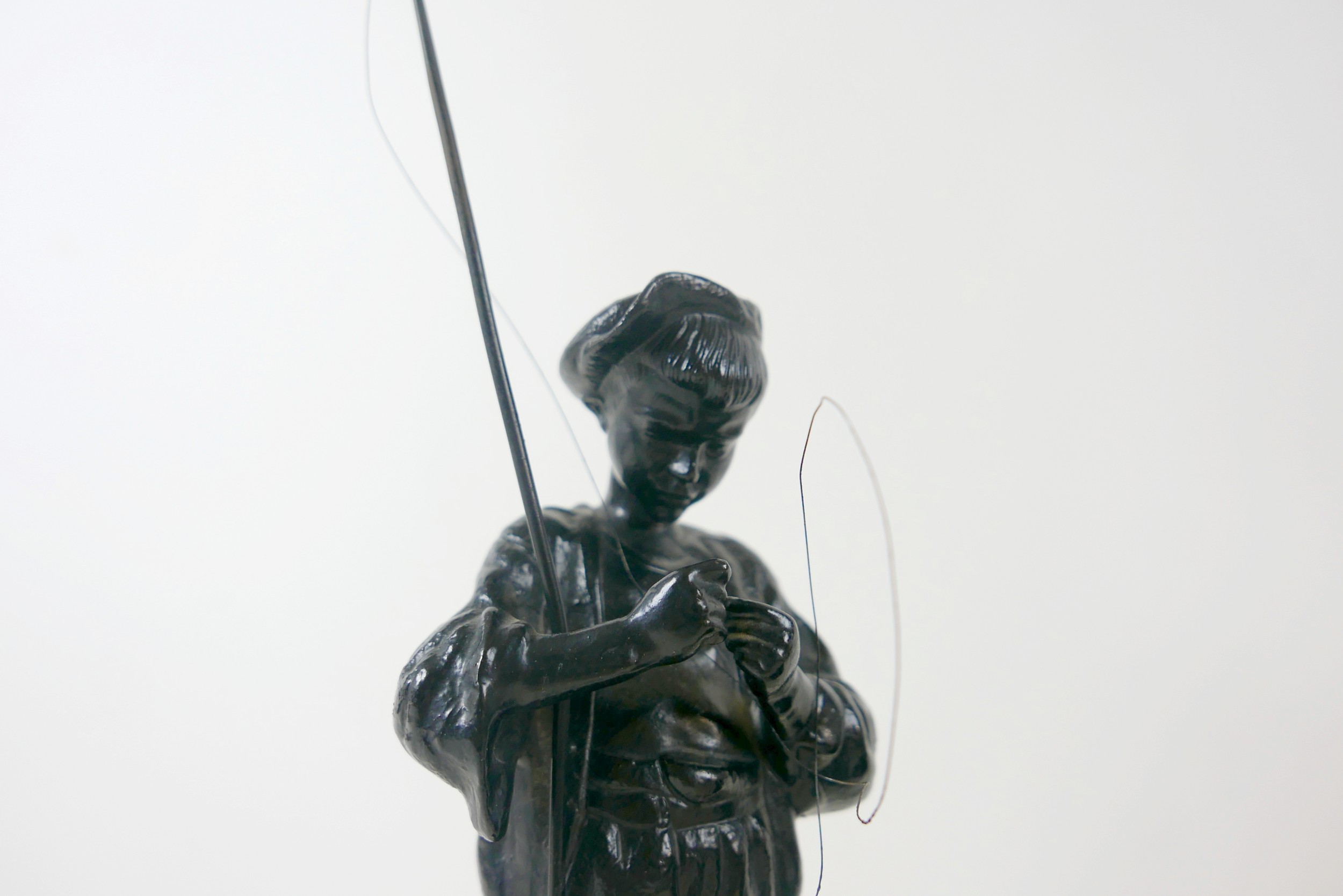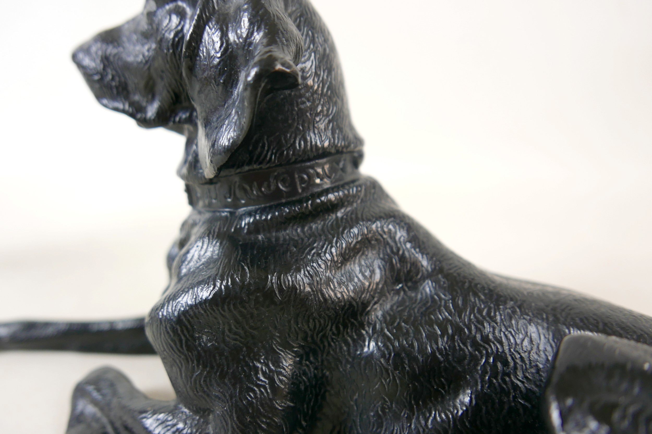 Two soviet cast iron figures of a boy fishing, the underside is embossed "Made in USSR, Kasli 1987", and a hollow cast iron dog, wearing a collar inscribed "bad Auderpux", bearing the painted mark of the soviet department of quality control (OTK). Figure of boy fishing is 34cm in height.(2)