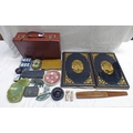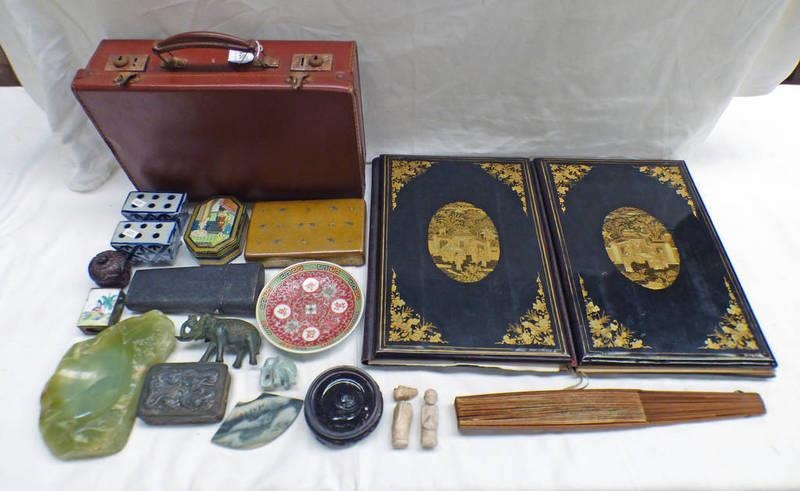VARIOUS ORIENTAL WARE, INCLUDING METAL ELEPHANT, JAIPUR STATE METAL BOX, BLUE & WHITE WARE, VARIOUS HORN & BONE SPOONS ETC IN CASE, ENAMEL BOX