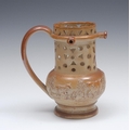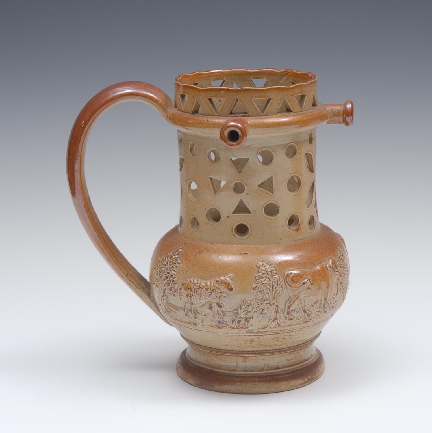 A 19th century brown salt glazed stoneware puzzle jug, pierced with stylised flowerhead and geometric motifs, in relief with continuous scene of sheep, cattle, trees and foliage, 19cm high, c.1840