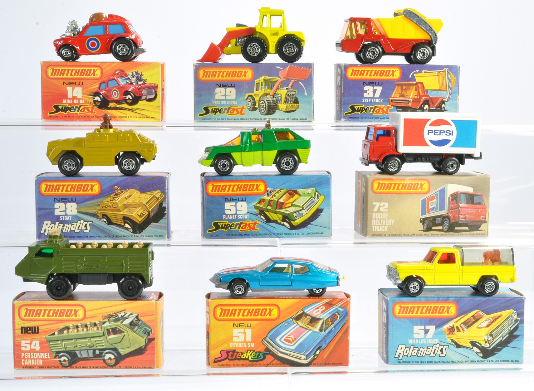 Matchbox Superfast comprising nine boxed issues as shown. Mini ha-ha, Citroen SM, Wildlife Truck etc. Mostly very good or excellent in mostly very good/excellent boxes. Generally Ex-Shop Stock.