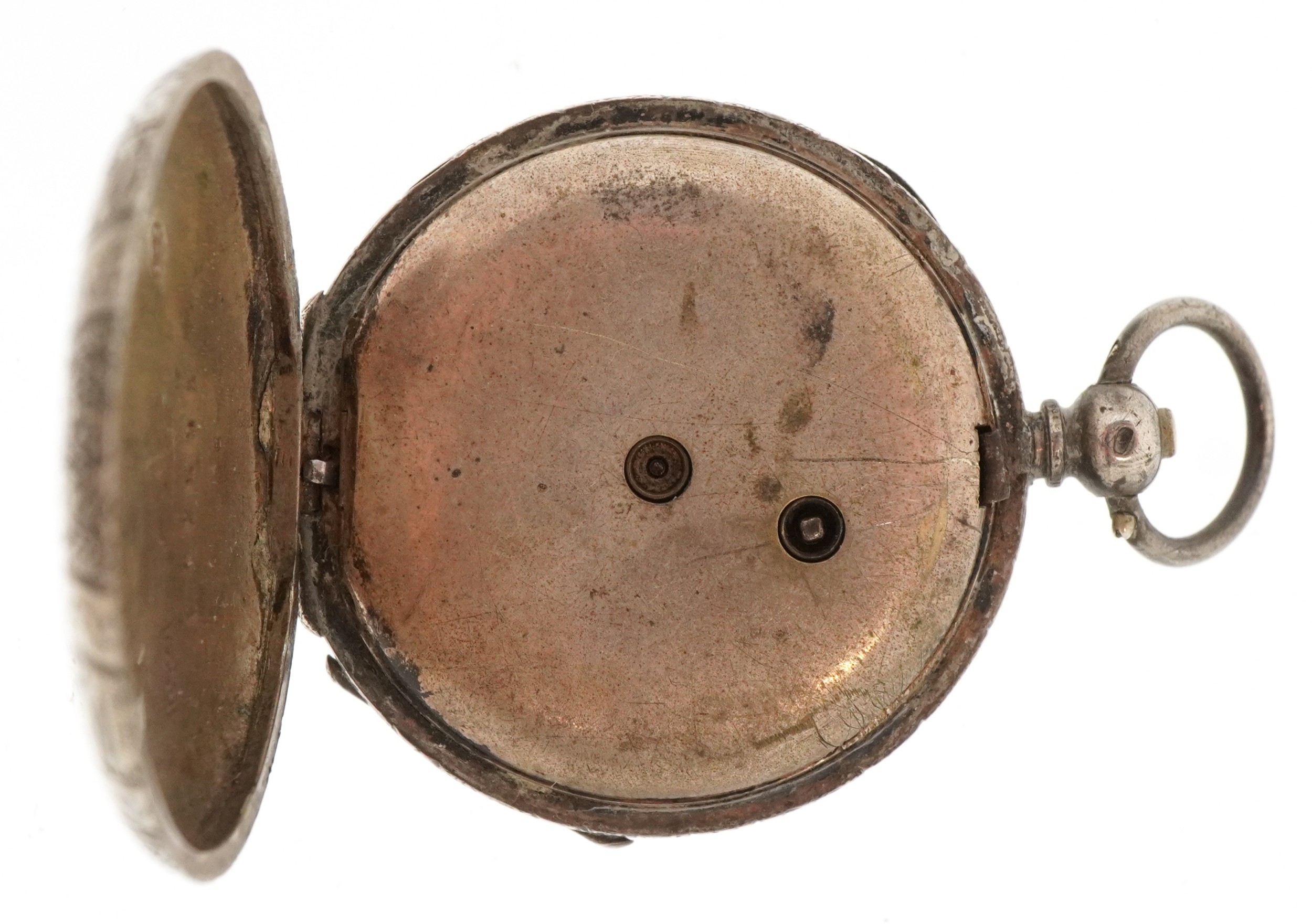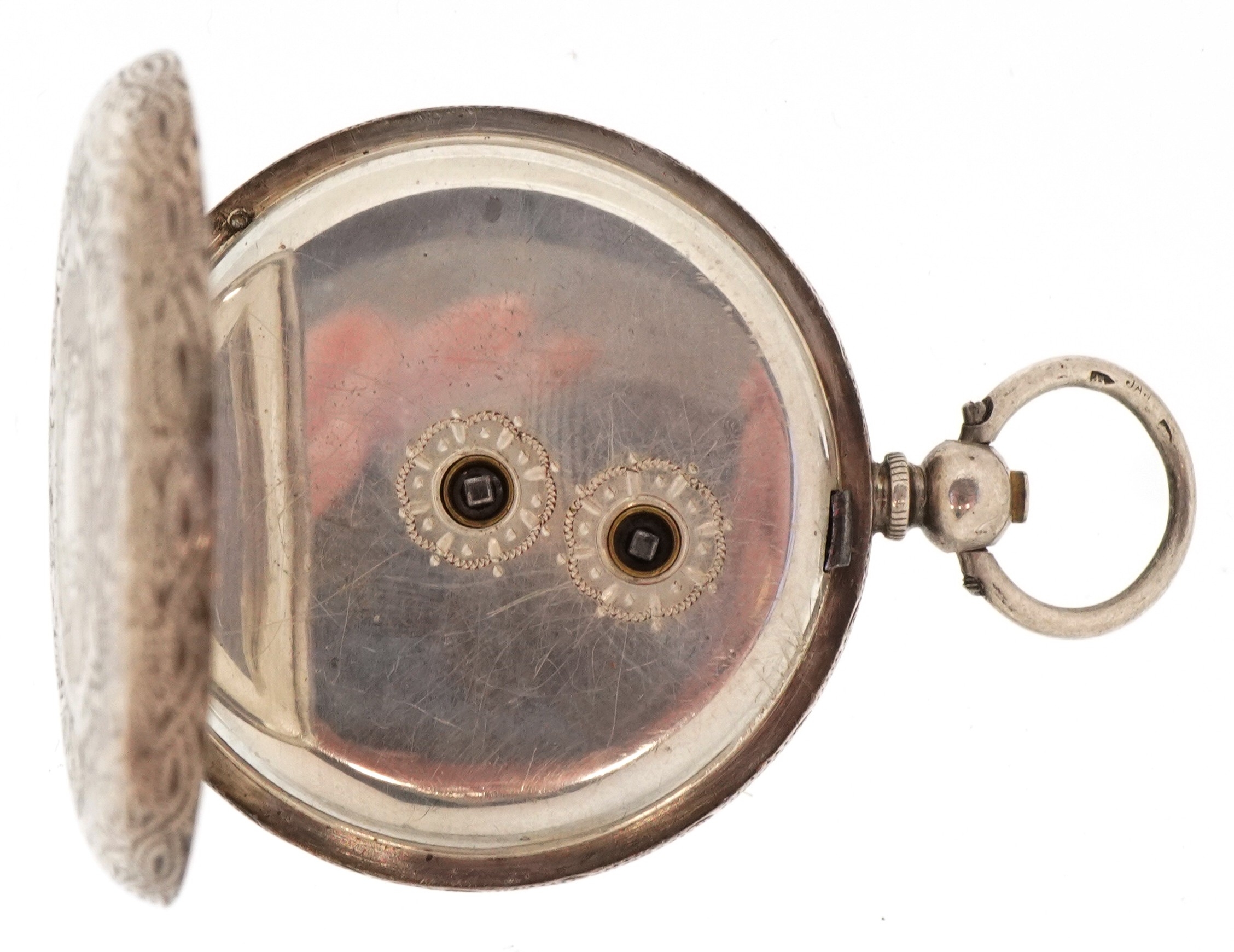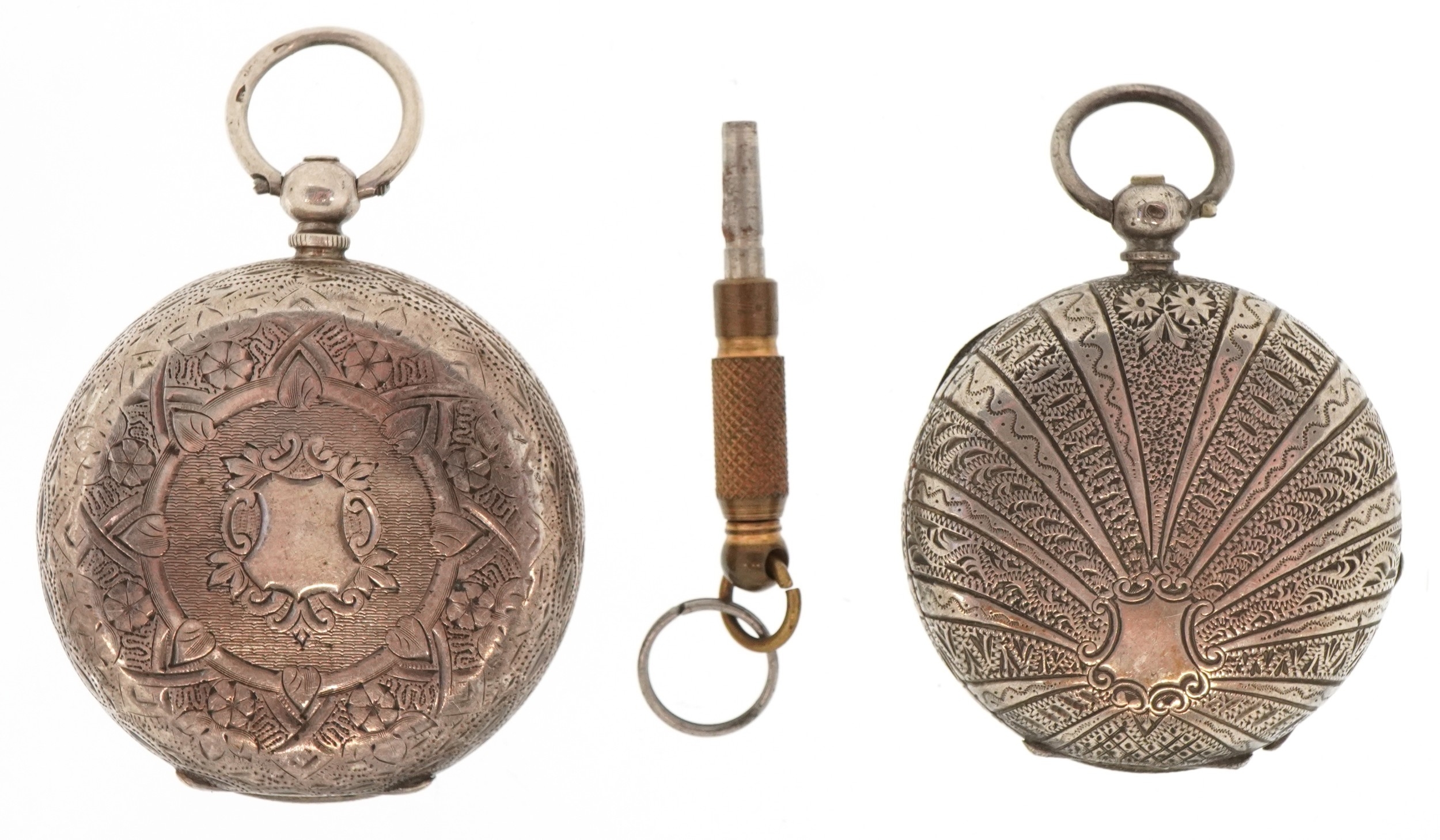 Two ladies silver open face keywind pocket watches having enamelled dials with Roman numerals, the largest 40mm in diameter.