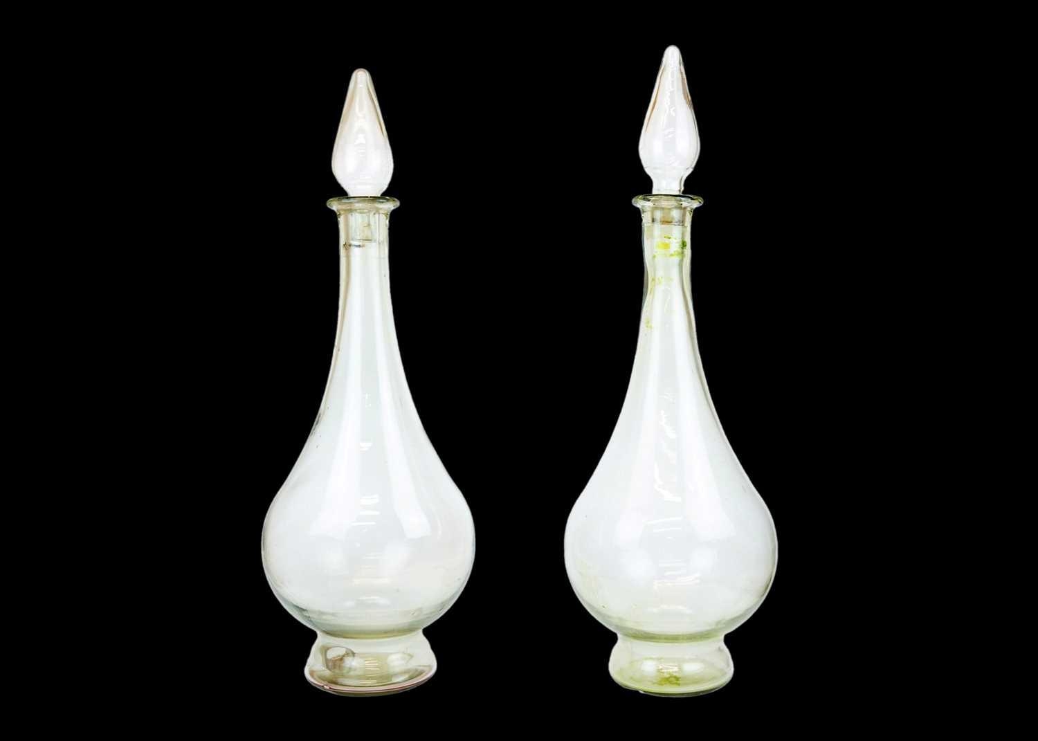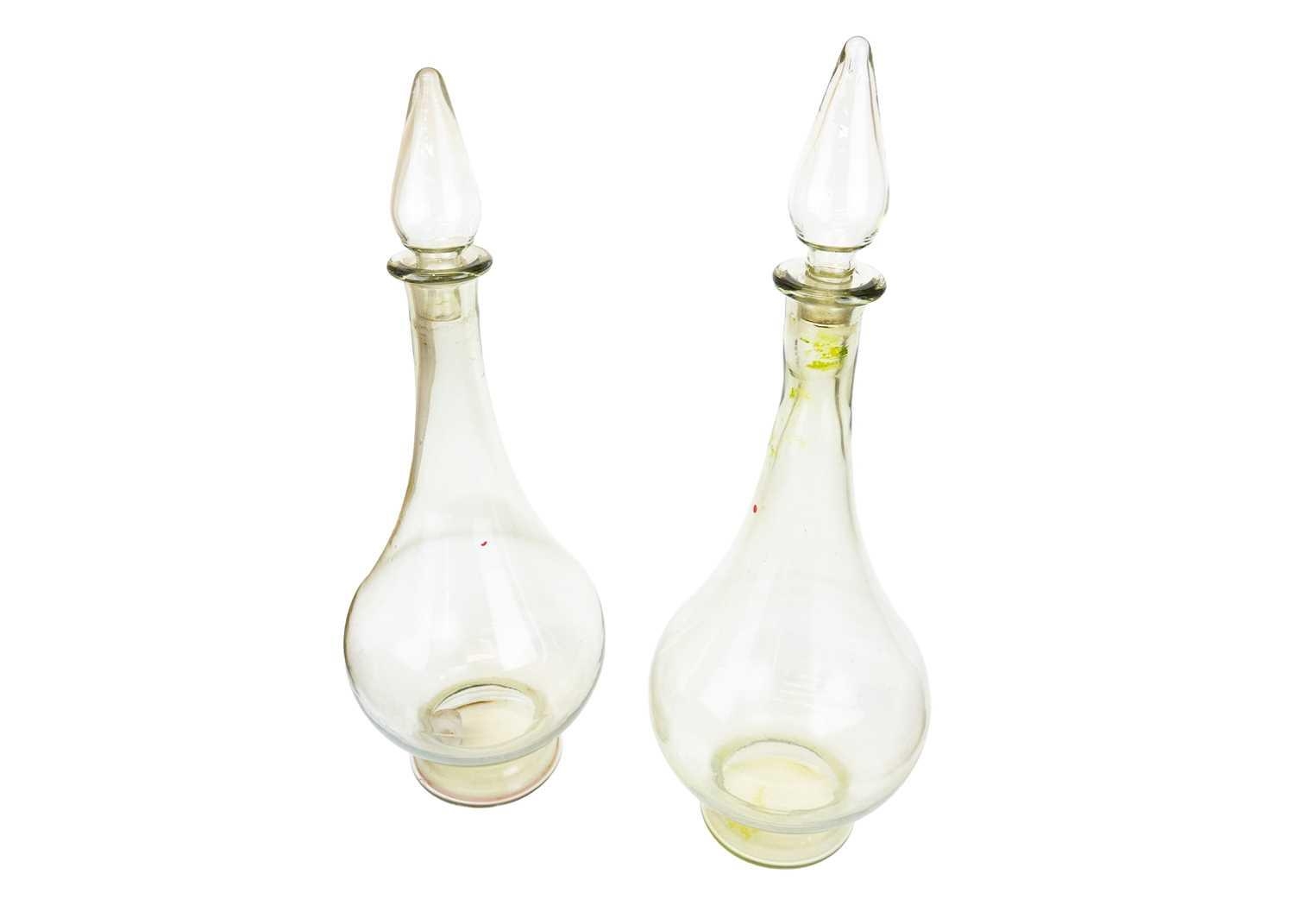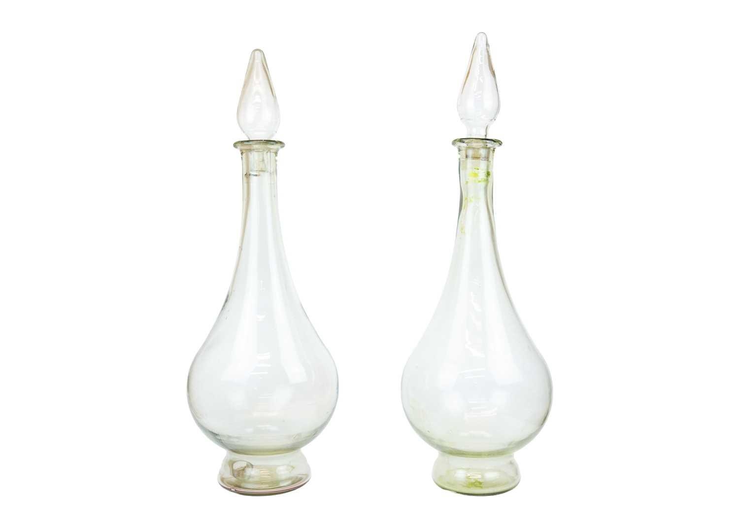 A pair of large modern apothecary display glass decanters and stoppers. Height 80cm.