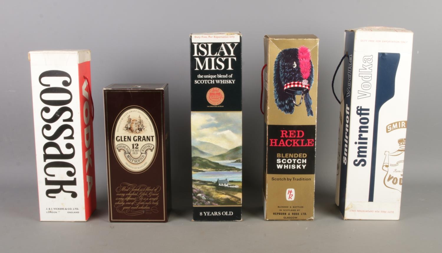 Five sealed bottles of alcohol, to include Cossack and Smirnoff vodka and Glen Grant, Islay Mist and Red Hackle whisky.
