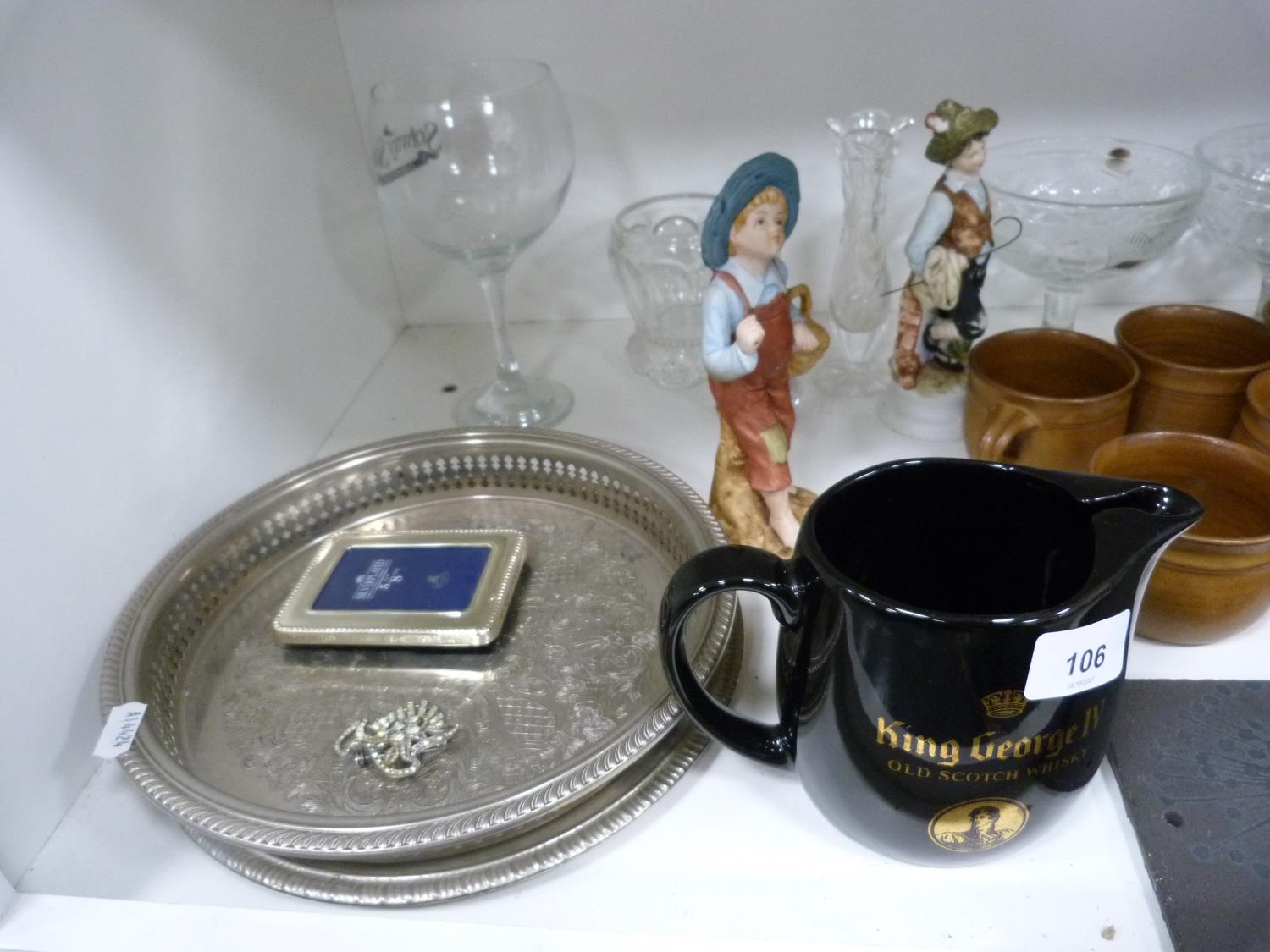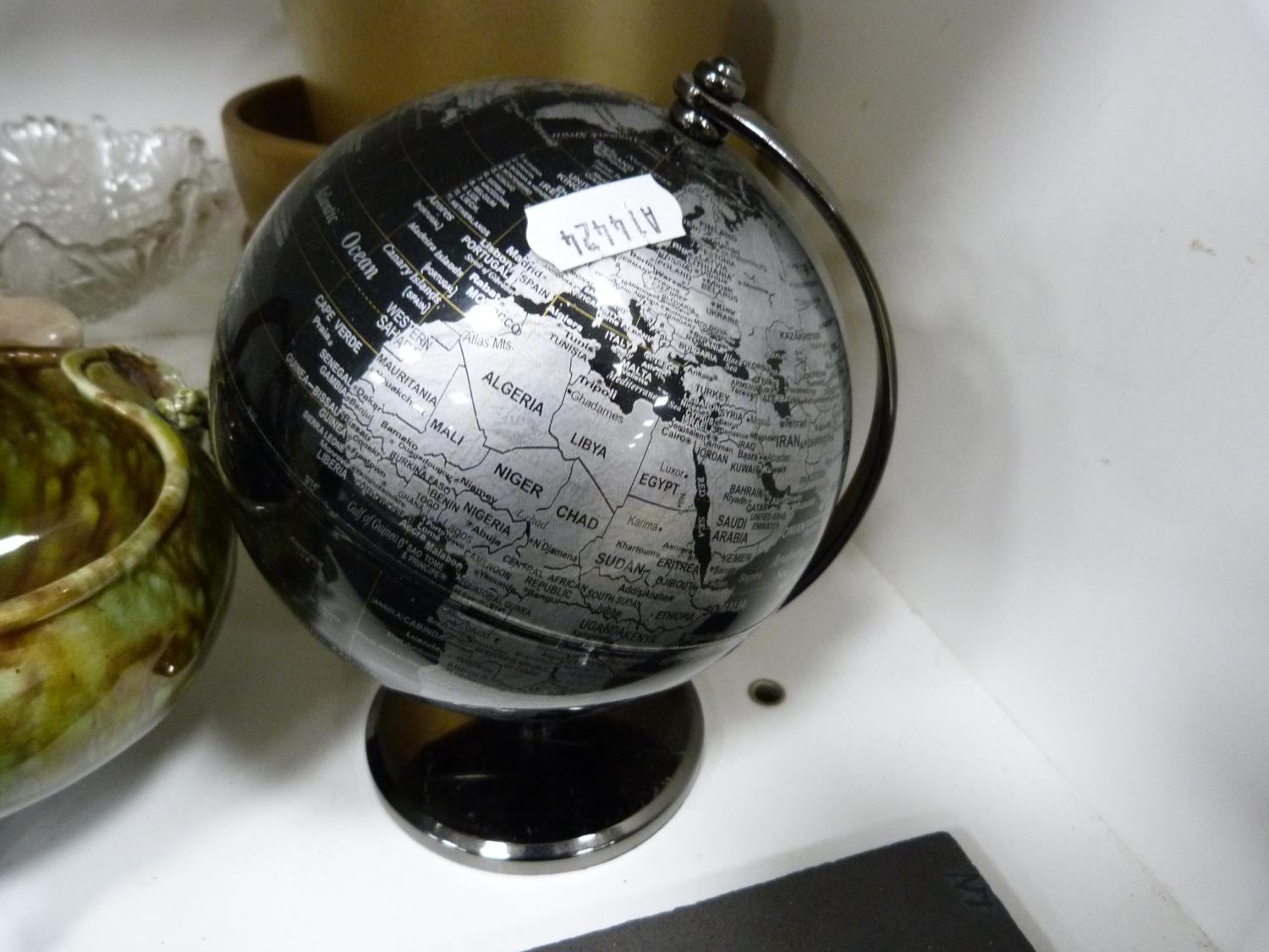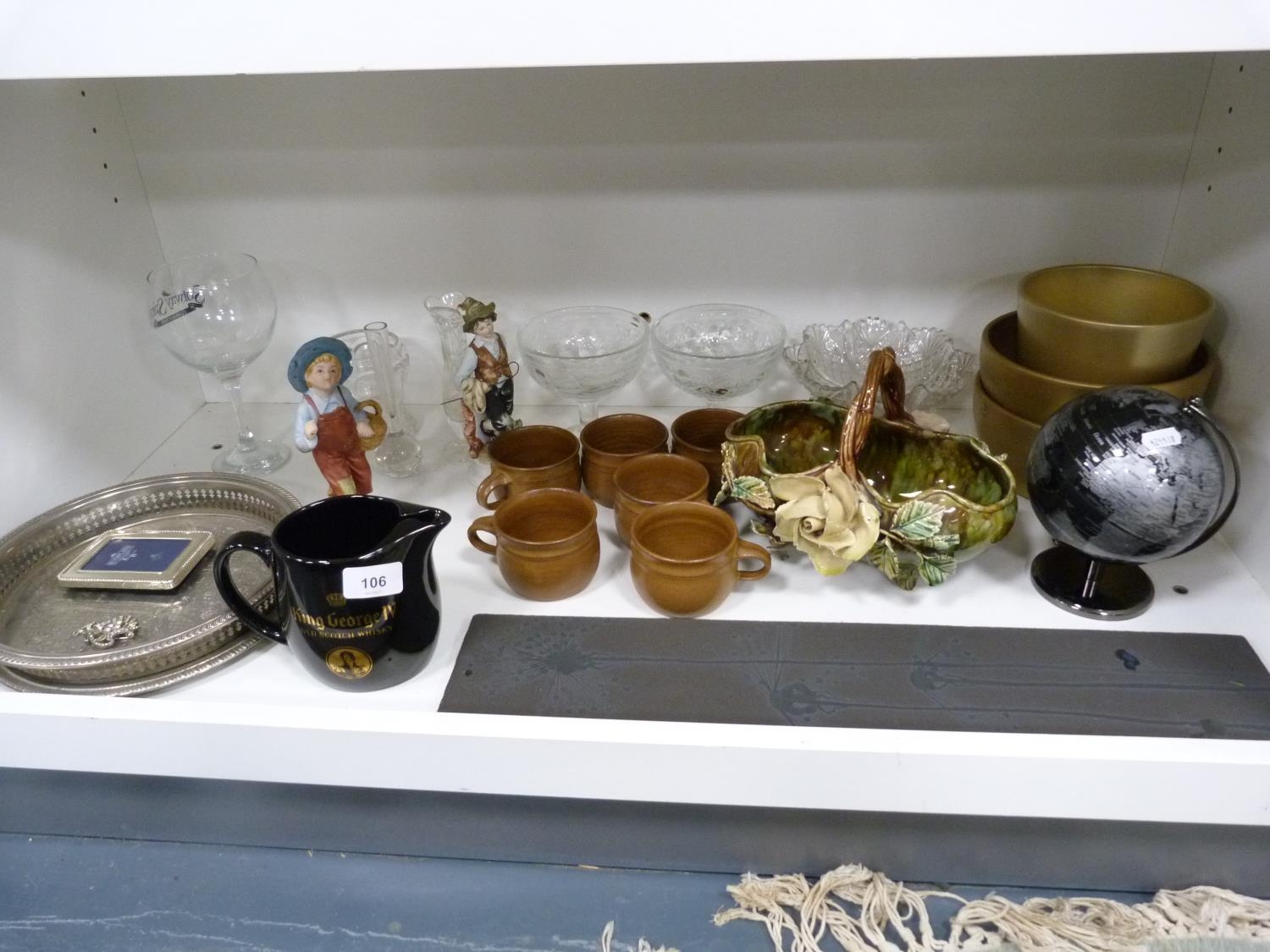 Wade King George IV Scotch Whisky jug, EP photograph frame, marcasite-style brooch, glass bowls, two figures, stoneware glazed cups, Majolica-style bowl, modern globe, gold-coloured modern bowls etc.