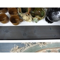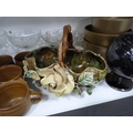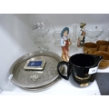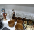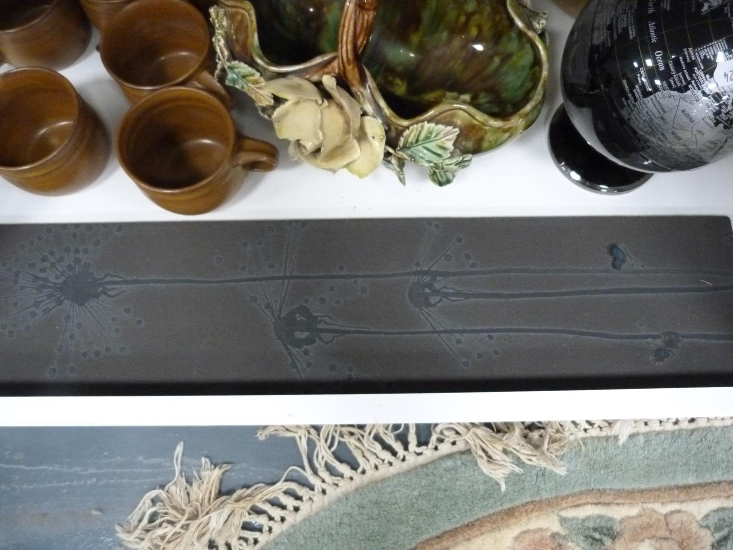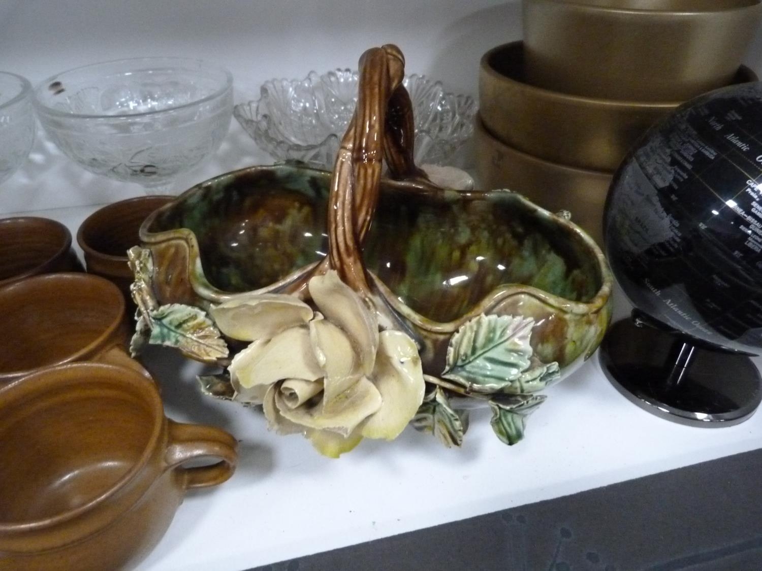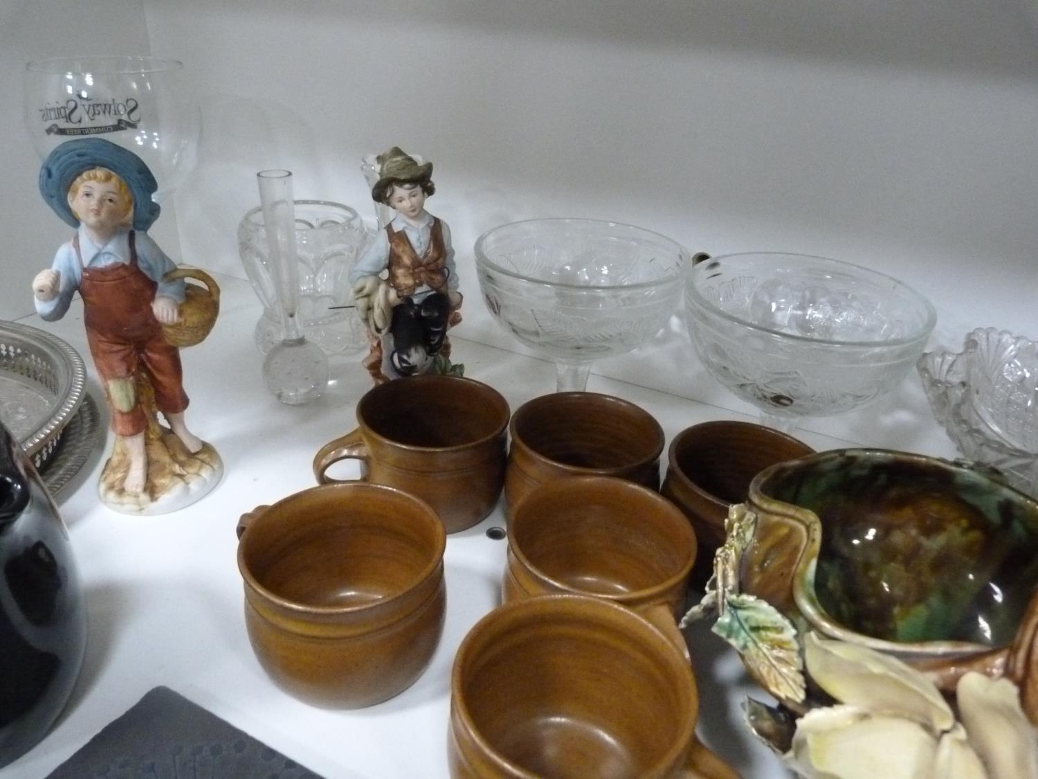 Wade King George IV Scotch Whisky jug, EP photograph frame, marcasite-style brooch, glass bowls, two figures, stoneware glazed cups, Majolica-style bowl, modern globe, gold-coloured modern bowls etc.