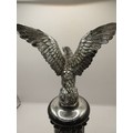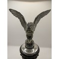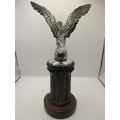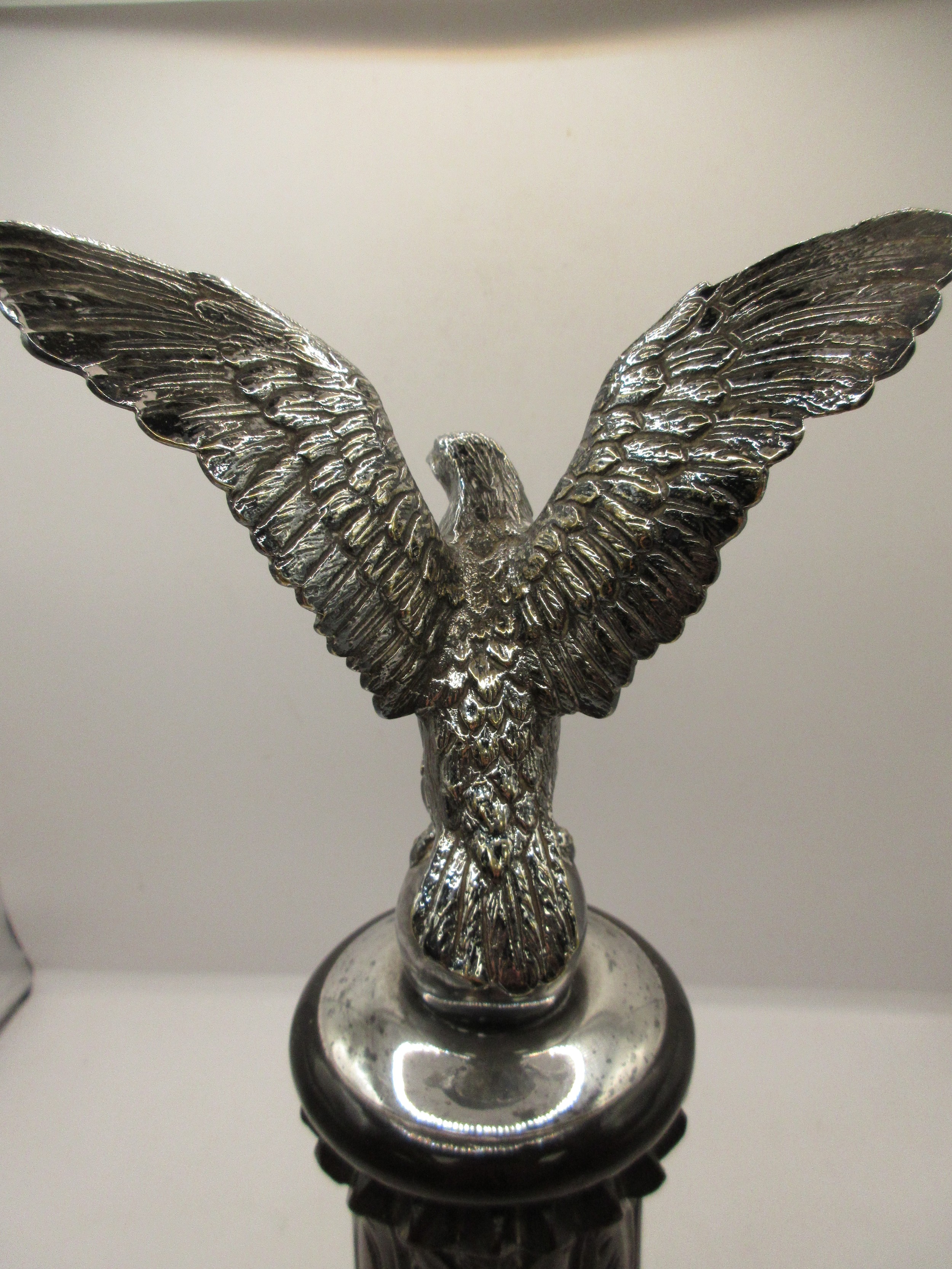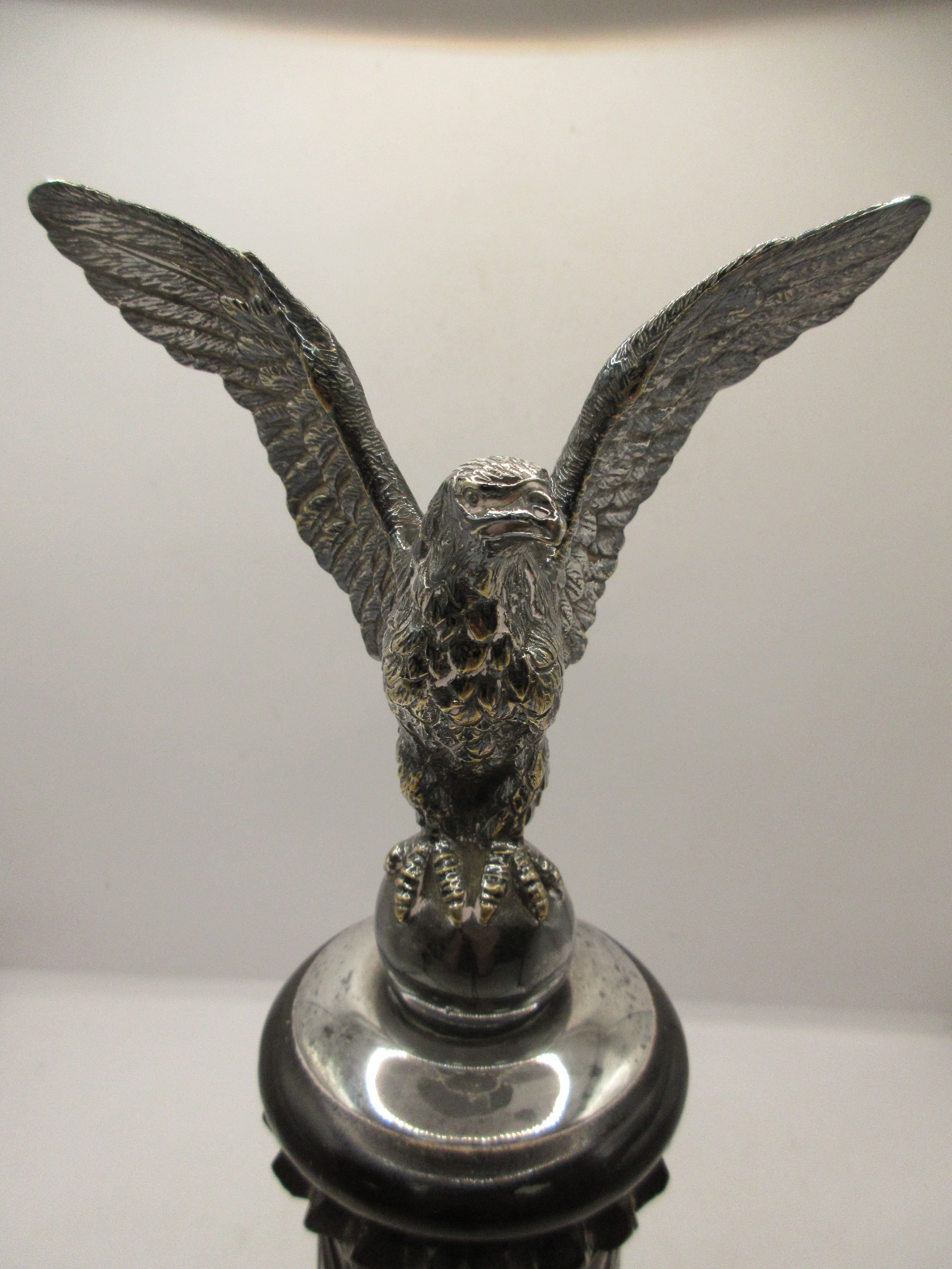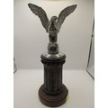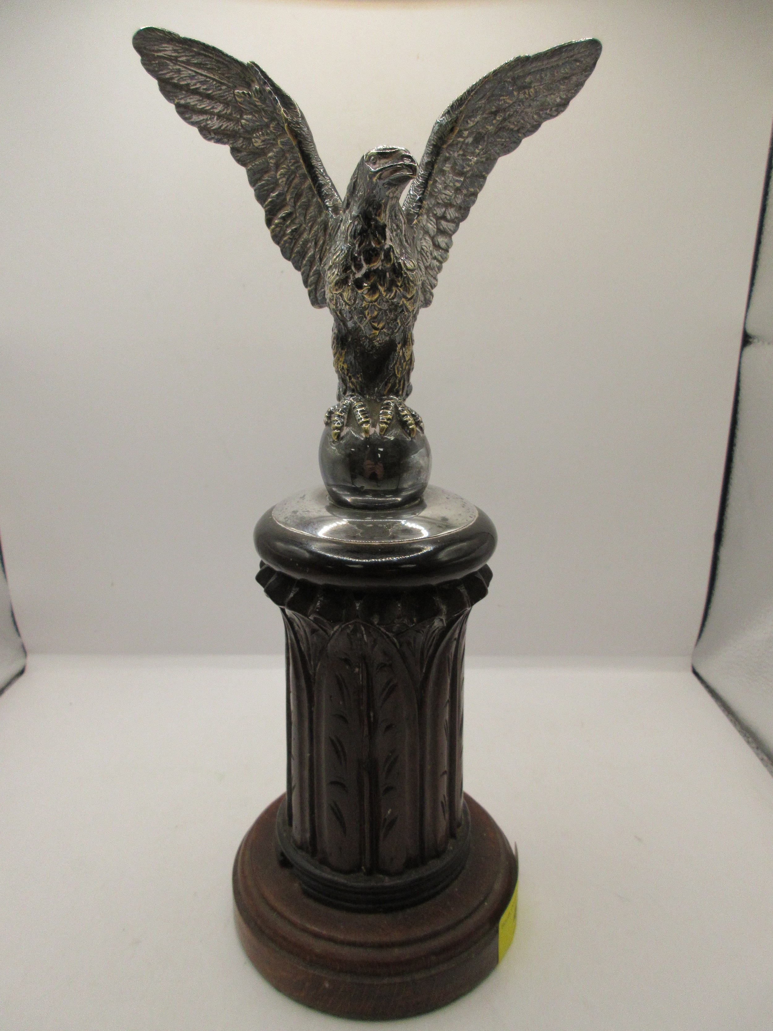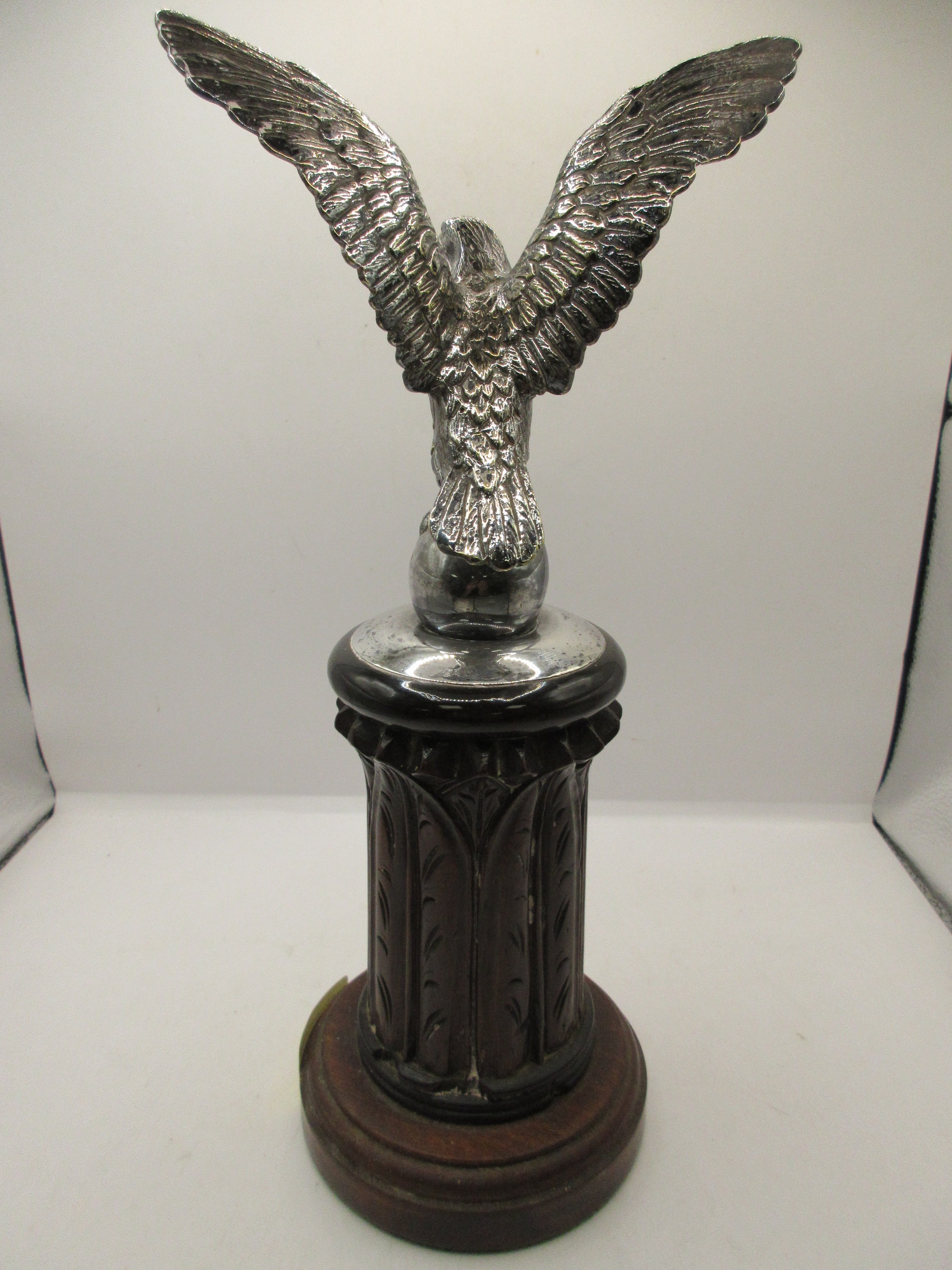 AN imposing antique car bonnet mascot in the form of an eagle with wings spread atop an egg, in silver plate, mounted on a heavily decorated wooden column, likely 1920s/1930s, in extremely good order