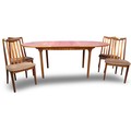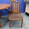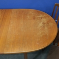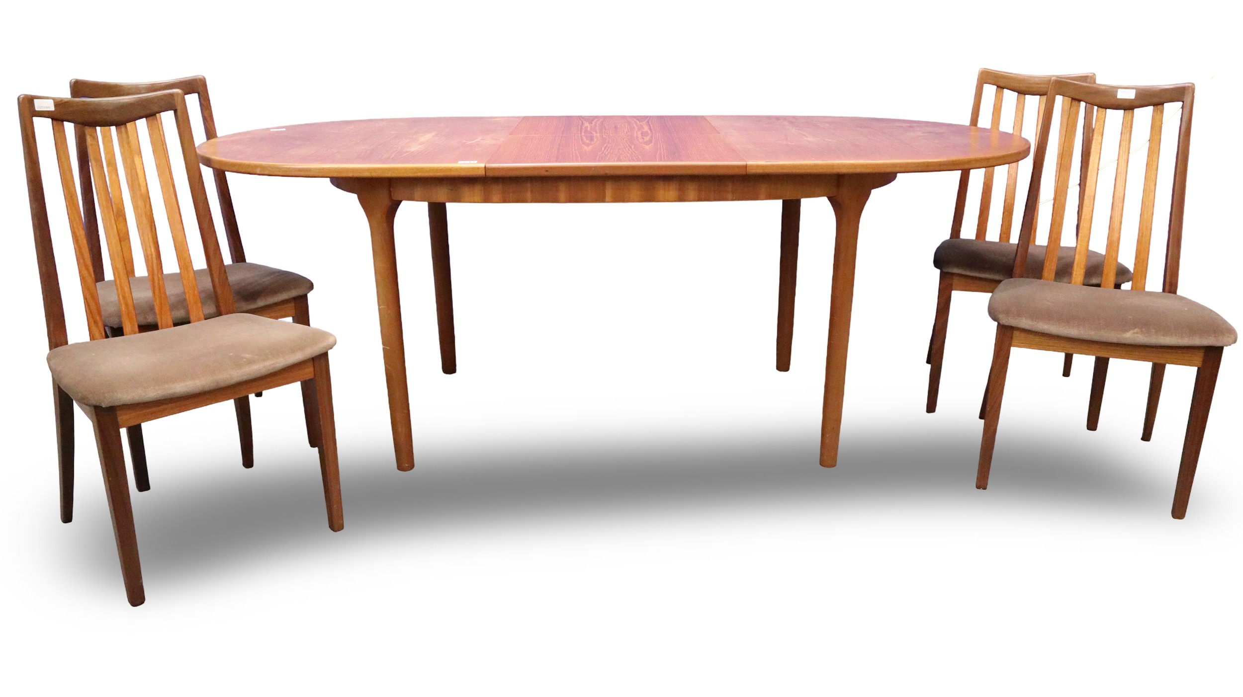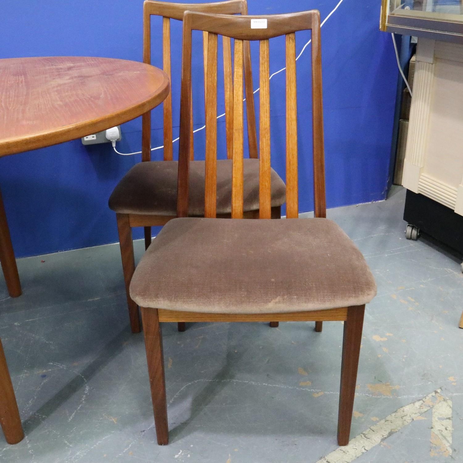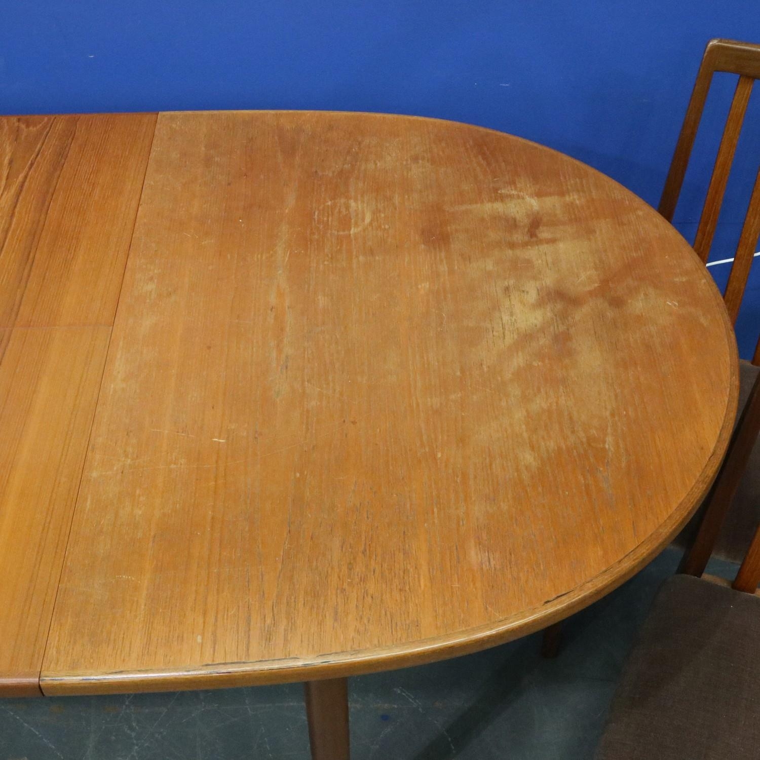 Leslie Dandy designed for G Plan, a set of four teak framed dining chairs, with an oval extending teak dining table. Chairs relatively clean and sturdy, table requires attention to top. Not available for in-house P&P