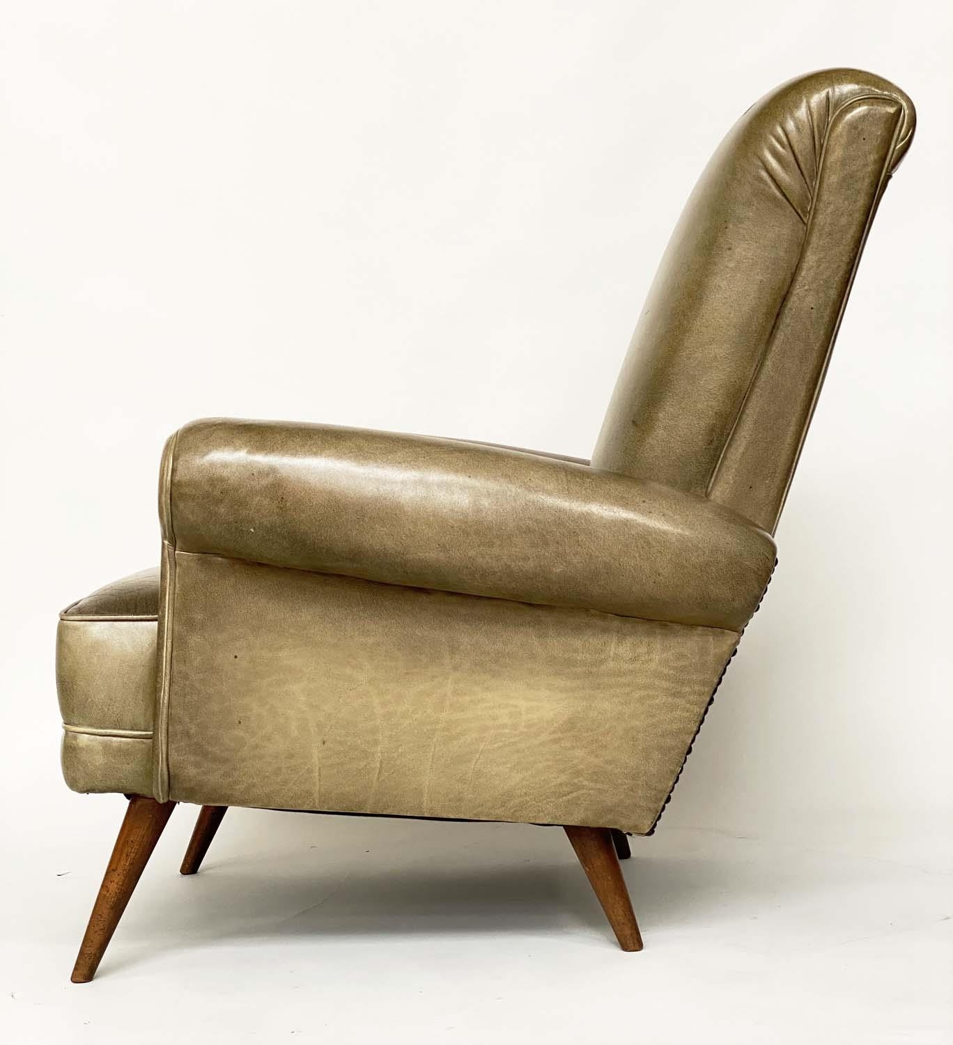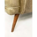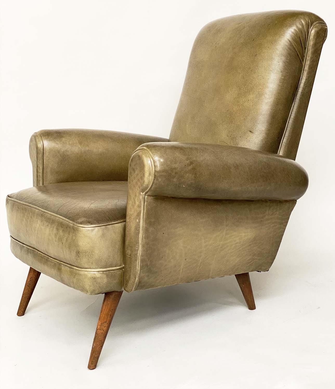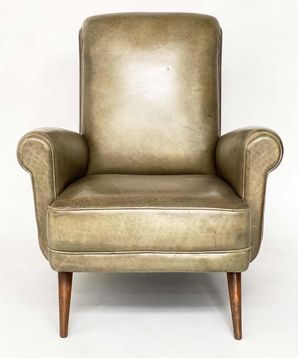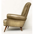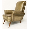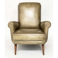 HOWARD KEITH STYLE ARMCHAIR, 1970's leather with scroll back and arms and well splayed teak supports, 75cm W.