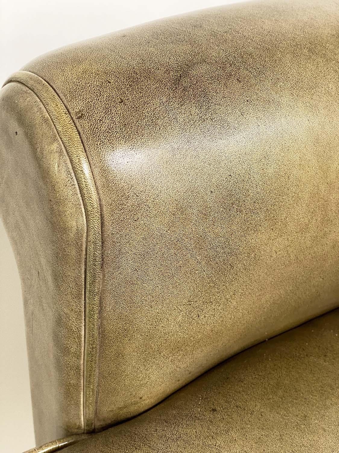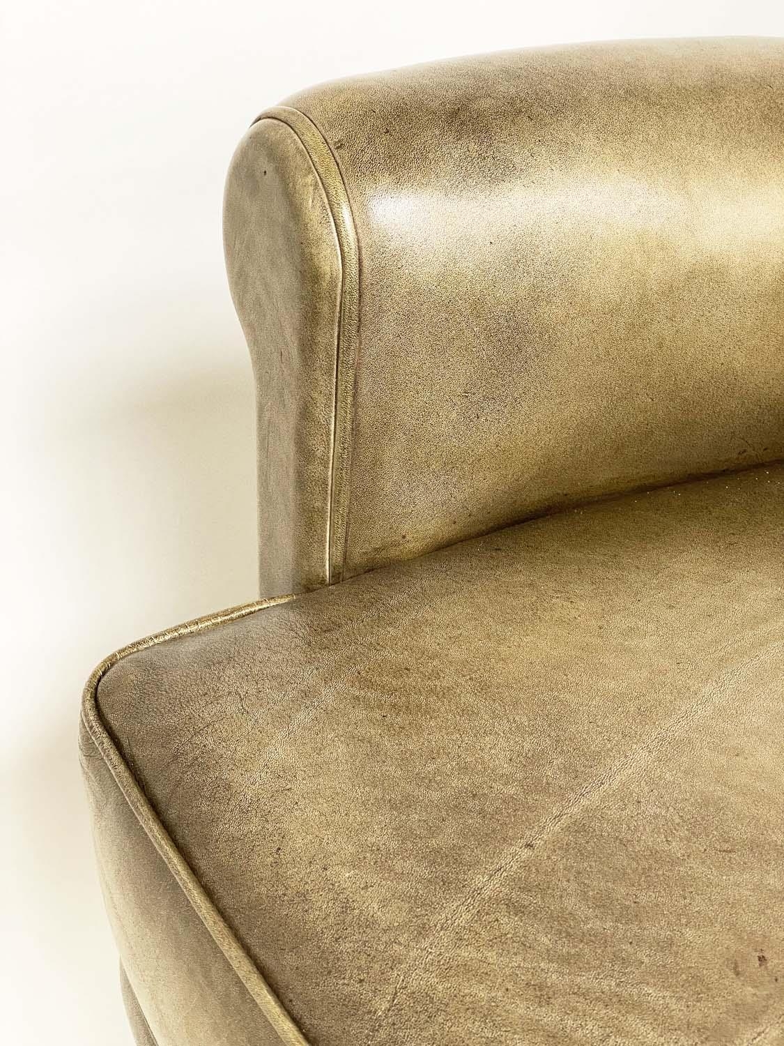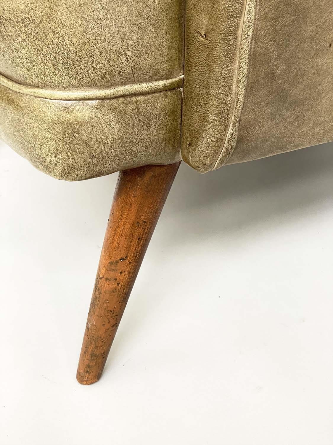 HOWARD KEITH STYLE ARMCHAIR, 1970's leather with scroll back and arms and well splayed teak supports, 75cm W.