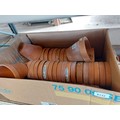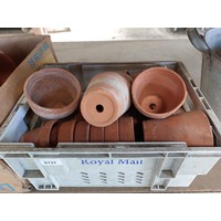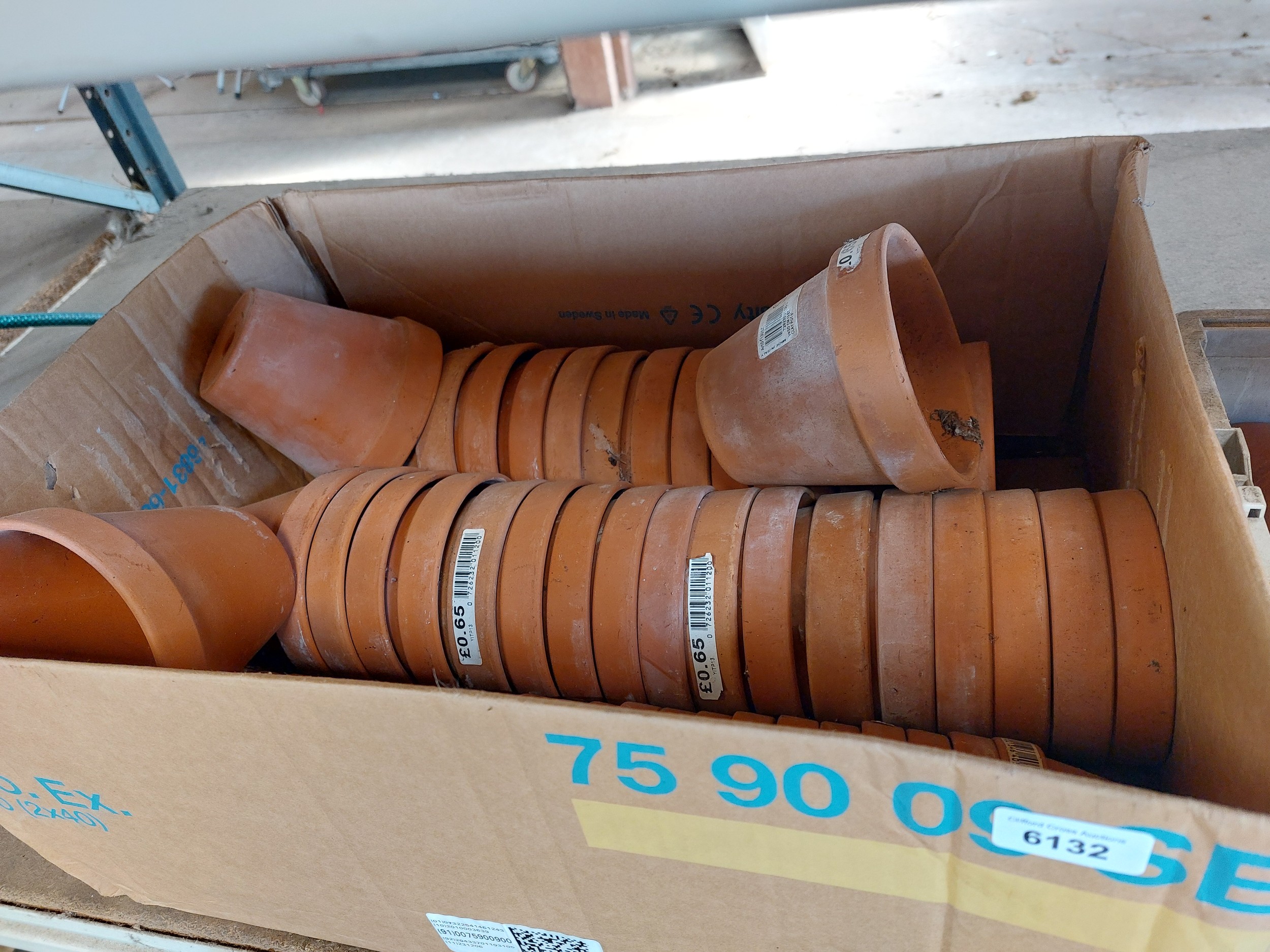 A cardboard box of terracotta plant pots.